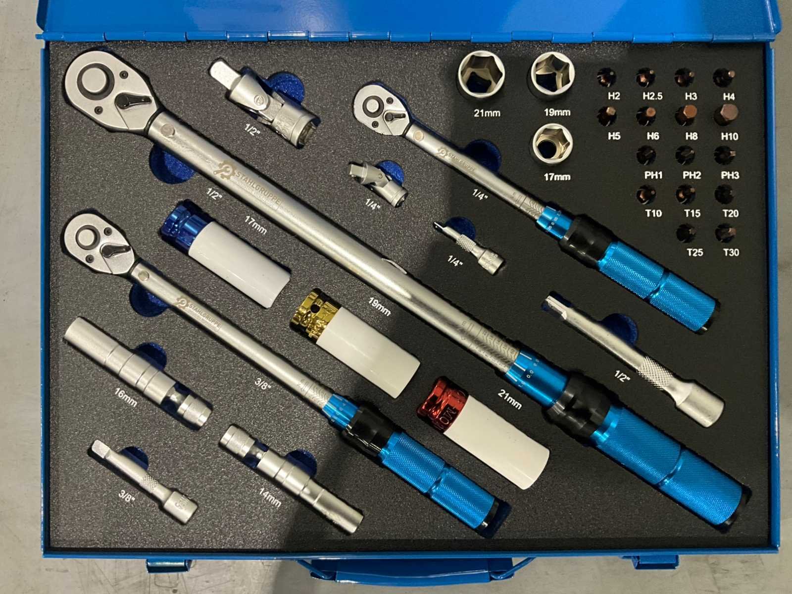 1x 1/4" momentsleutel met 72-tands aandrijving (bereik: 5-25 N/M) 1x 3/8" momentsleutel met 72-tands aandrijving (bereik: 10-60 N/M) 1x 1/2" momentsleutel met 72-tands aandrijving (bereik: 40-220 N/M) 3x Impactdoppen (1/2"): 17mm, 19mm, 21mm 3x Dopsleutels (1/2"): 17mm, 19mm, 21mm 3x Verlengstukken: 1/4" x 3", 3/8" x 3", 1/2" x 5" 2x Universele koppelingen (1/4" & 1/2") 16x Bitdoppen (1/4"): PH1, PH2, PH3, T10, T15, T20, T25, T30, H2, H2.5, H3, H4, H5, H6, H8, H10 2x Bougiesleutels (14mm, 16mm) met dunne wand, 3/8" aandrijving voor BMW ongebruikt Nee Merk: Stahlgruppe Type: 32PC Bouwjaar: 2026 Lengte: 45 Breedte: 33 Hoogte: 5