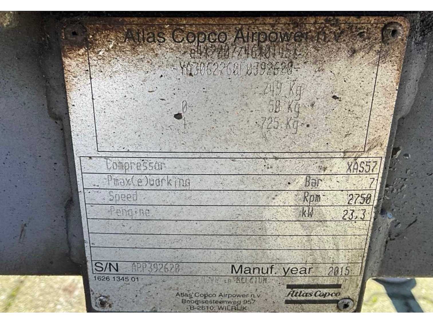 Chassisnummer YA3062260F0392620; Deutz 2 cilinder dieselmotor; kunststof kap; opklapbare trekboom; neussteun; (de koper dient bij transport over de weg zelf te voorzien in een geldig kenteken; een 13 polige aansluitstekker of verloopstuk met kabel (verlengsnoer kan ter plaatse tegen betaling aangekocht worden); eventueel extra lichtbalk); Duitse kentekenpapieren; gelijkvormigheidsattest; (VIE-NY667) Nee Merk: Atlas Copco Type: XAS57 Bouwjaar: 2015 Serienummer: APP392620 Capaciteit.: 7bar Luchtstroom: 3000l/min Afgelezen urenstand: 1237hr Eigen gewicht: 800kg Totale afmeting L: 3400mm Totale afmeting Breedte: 1350mm Totale afmeting Hoogte: 1300mm