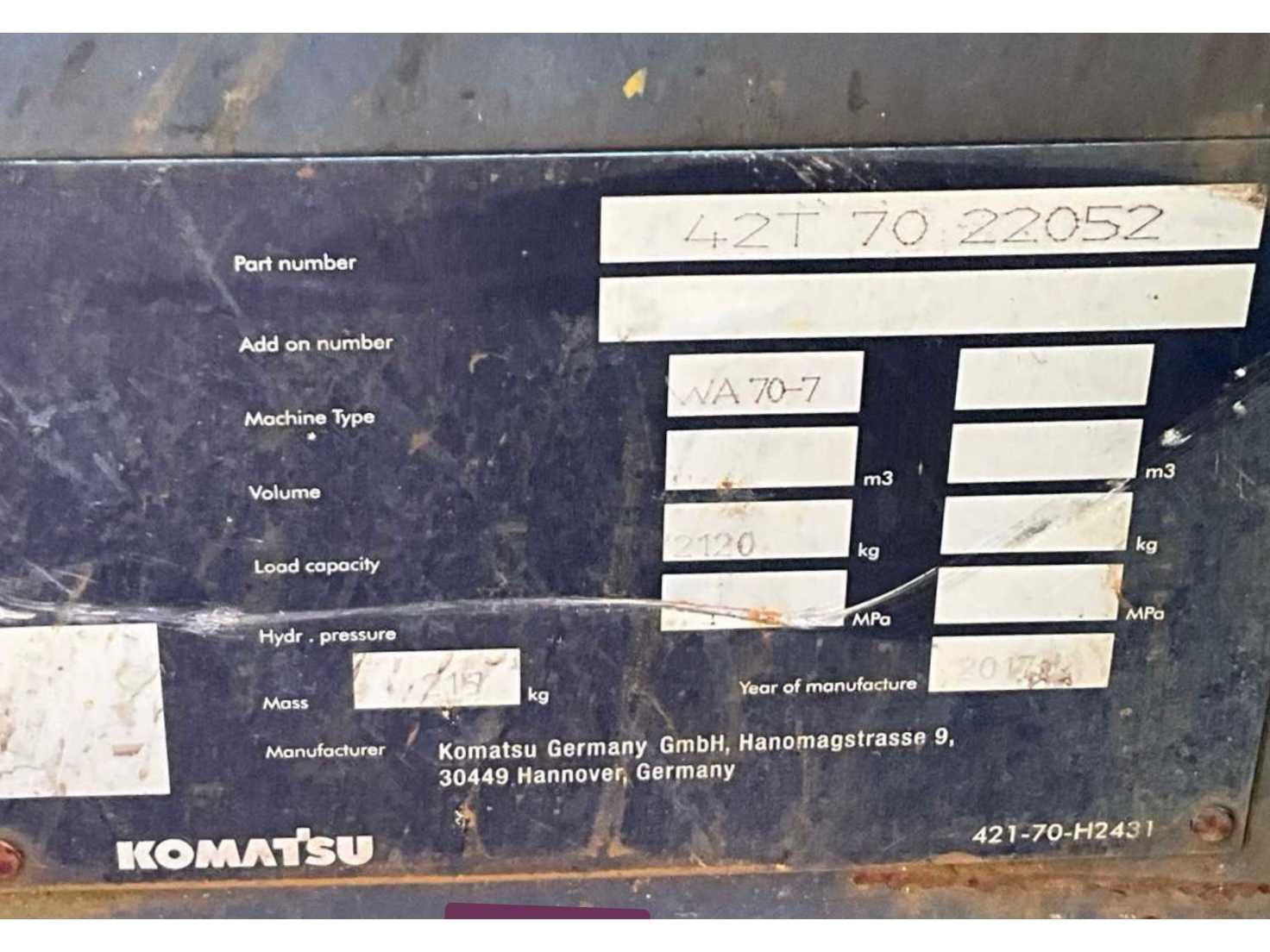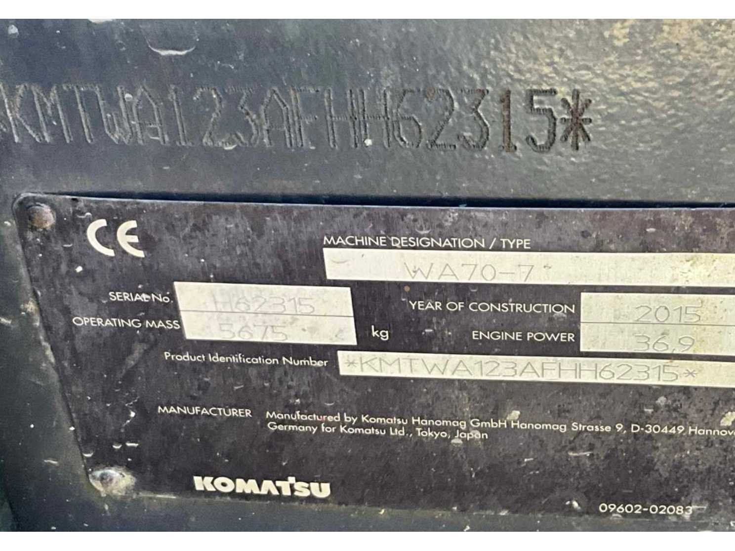 Gesloten cabine; 4x4 aandrijving; maximale hef capaciteit 2120 kg; maximale uitstorthoogte 2400 mm; vorkenbord met vorken; graafbak op frame; working condition; Nee Merk: Komatsu Type: WA-70-7 Bouwjaar: 2015 Serienummer: KMTWA123AFHH62315 Merk motor: Komatsu Kenteken: 52-48-GV Motorvermogen (kW): 36.9kW Aantal cilinders: 4 Brandstof: diesel Graafbak afm. b: 1750mm Bandenmaat: 405/70R18 Cabine: true Afgelezen urenstand: 2911 Eigen gewicht: 5675kg Totale afmeting L: 5500mm Totale afmeting Breedte: 1800mm Totale afmeting Hoogte: 2500mm