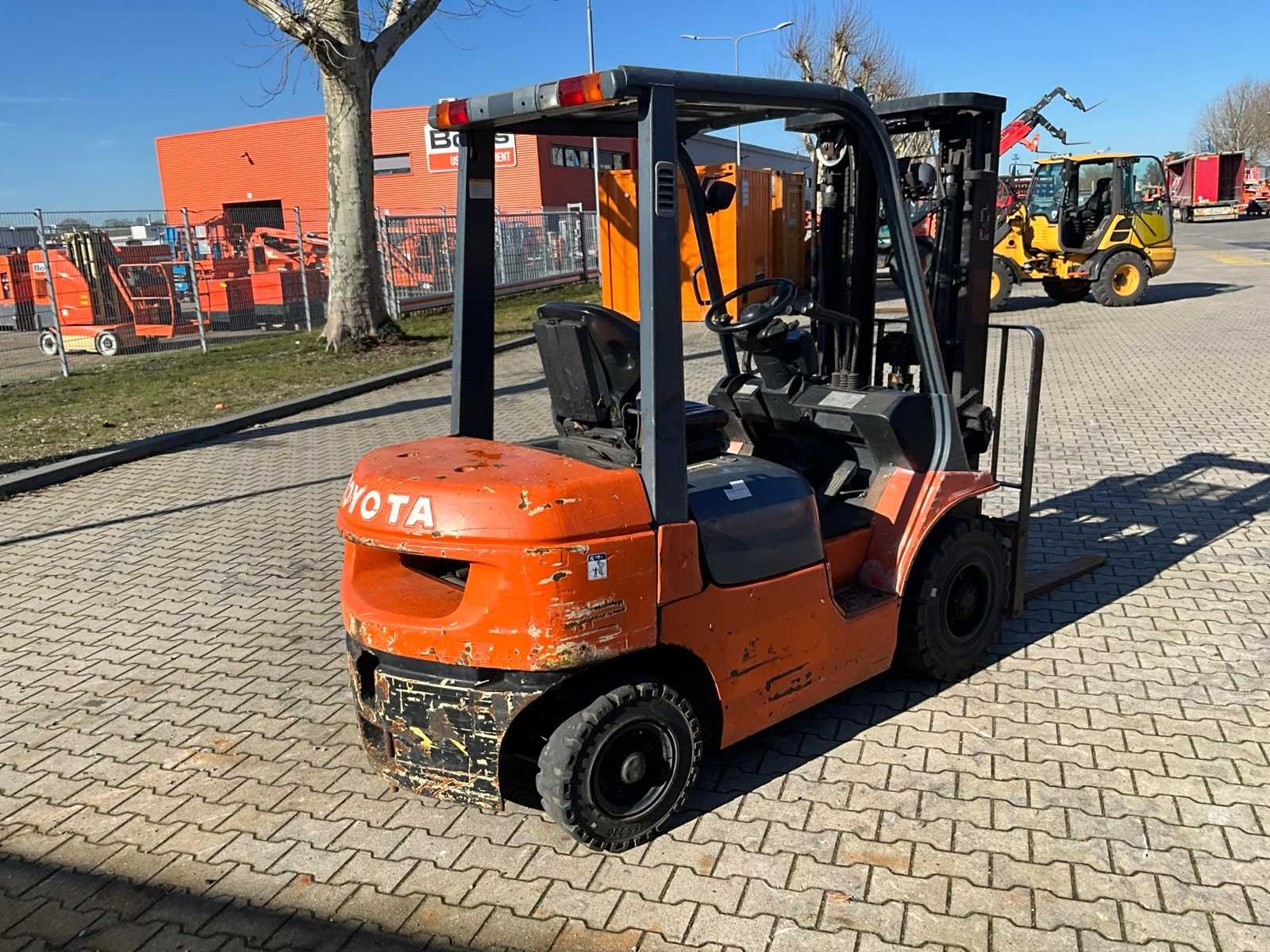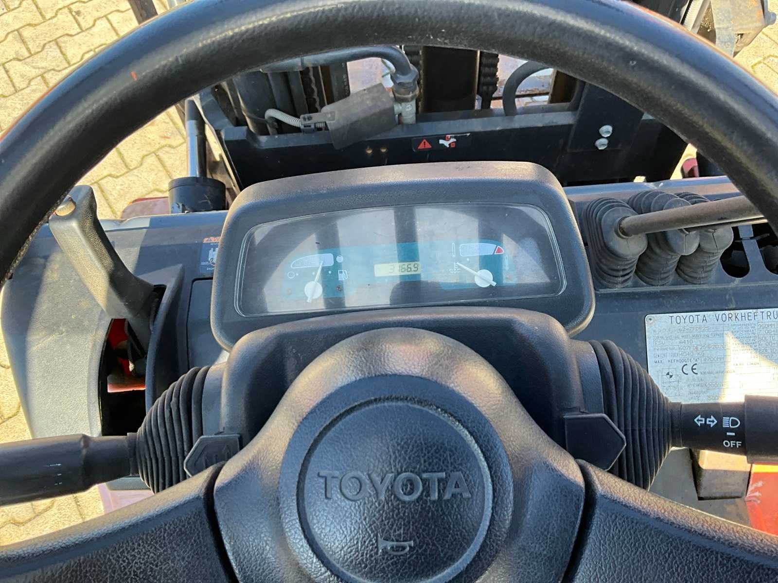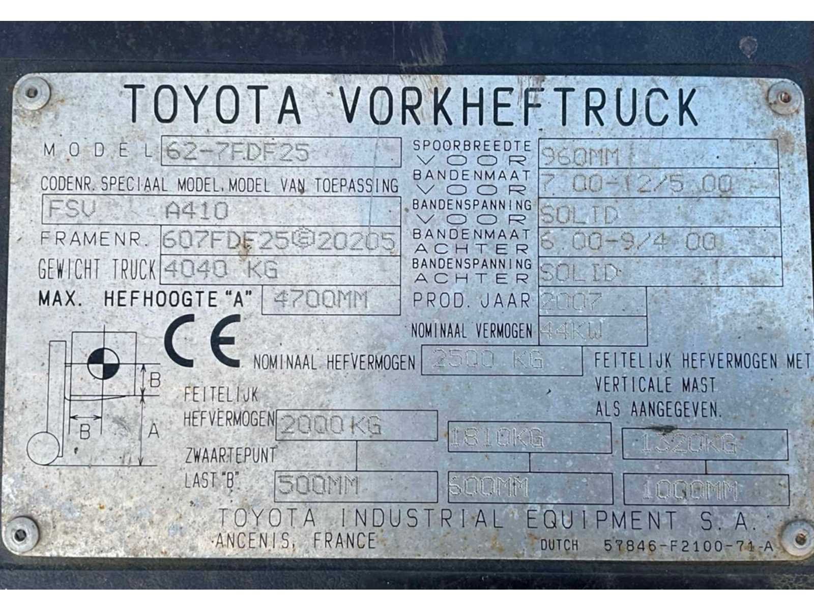 Vorkbreedte 125 mm; FEM2; lastrek; working condition; Nee Merk: Toyota Type: 62-7FDF25 Bouwjaar: 2007 Serienummer: 607FDF25 20205 Brandstof: Diesel Mast: Triple Soort band: Volrubber banden Aantal wielen: 4 Afgelezen urenstand: 3168 Free-lift: true Triple mast: true Eigen gewicht: 4040kg Hefvermogen: 2500kg Lepellengte: 1200mm Max. hefhoogte: 4700mm Vol rubber banden: true Minimale doorrijhoogte: 2130mm Totale afmeting L: 3800mm Totale afmeting Breedte: 1150mm Totale afmeting Hoogte: 2150mm Diesel: true