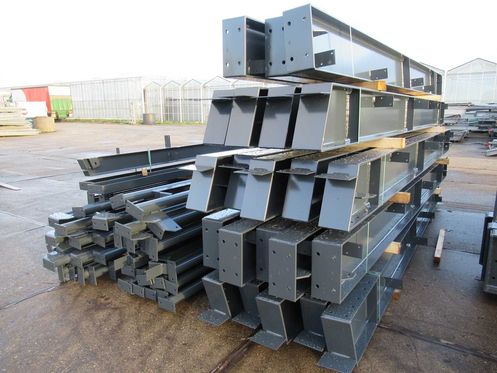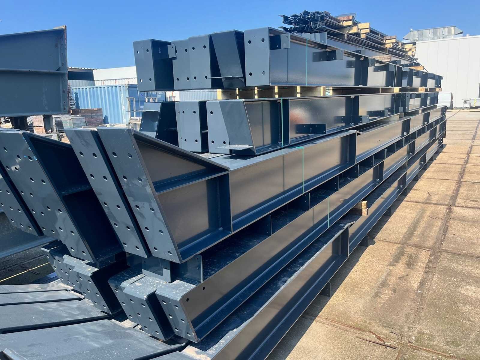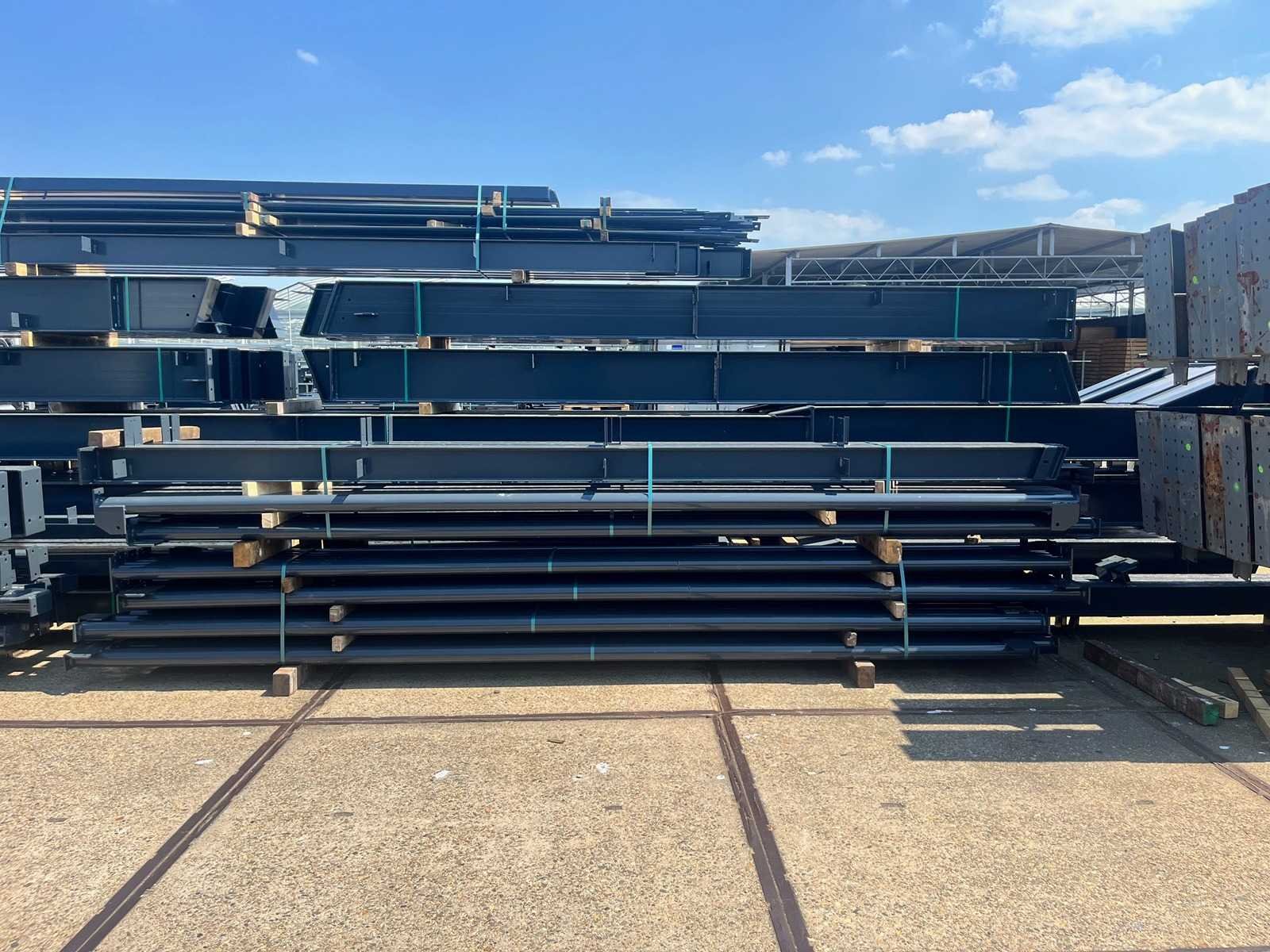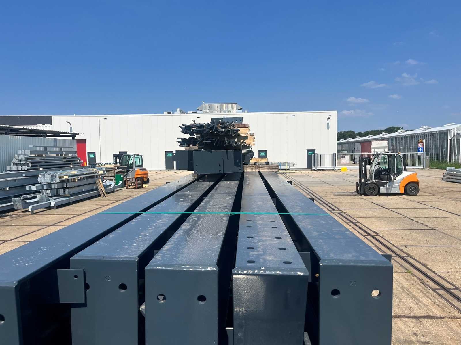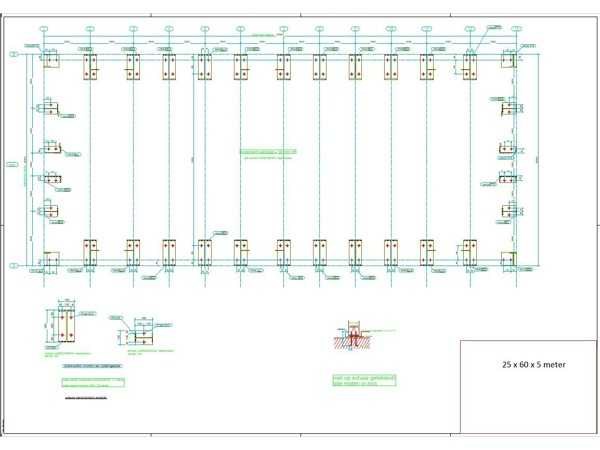 Nederlandse productie; vrije overspanning; spanten h.o.h. 5000mm; staalberekeningen; staaltekeningen; montagetekeningen; ankerplan; staal genummerd volgens montageplan; dakhelling 20 graden; 11 sets tussenspanten IPE360/300; 2 sets eindspanten IPE 200/180 met windstijlen waarvan 1 set voorzien is van een deursparing; voorzien van drukkokers; windverbanden; gordinglippen; bouten en moeren; meestort ankers; staalconstructie volgens productnorm EN1090 (Certificaat na aankoop verkrijgbaar); kavel ligt netjes transportklaar en dient met 2 trailers opgehaald te worden; kavel wordt gratis met een heftruck geladen No Materiaal: Gepoedercoat staal antraciet Bouwjaar: 2026 Totaal oppervlakte: 1500m² Nok hoogte: 9550mm Goot hoogte: 5000mm Totale afmeting L: 60000mm Totale afmeting Breedte: 25000mm