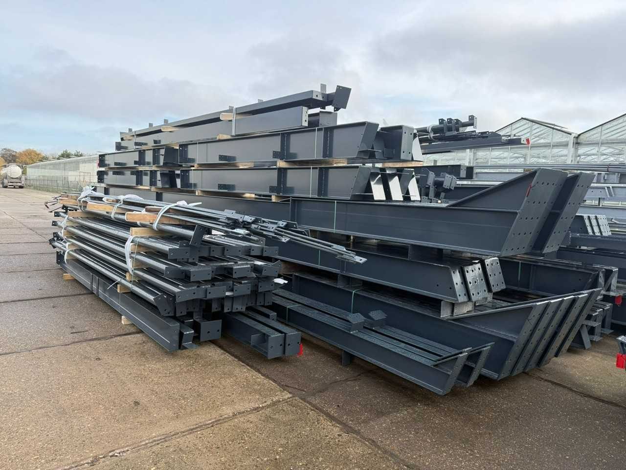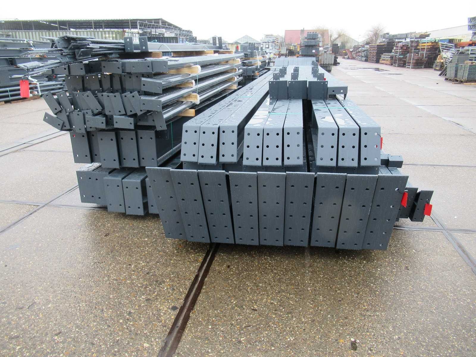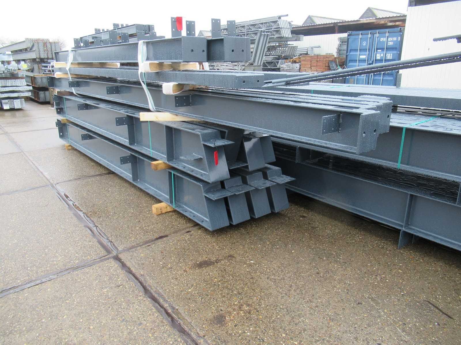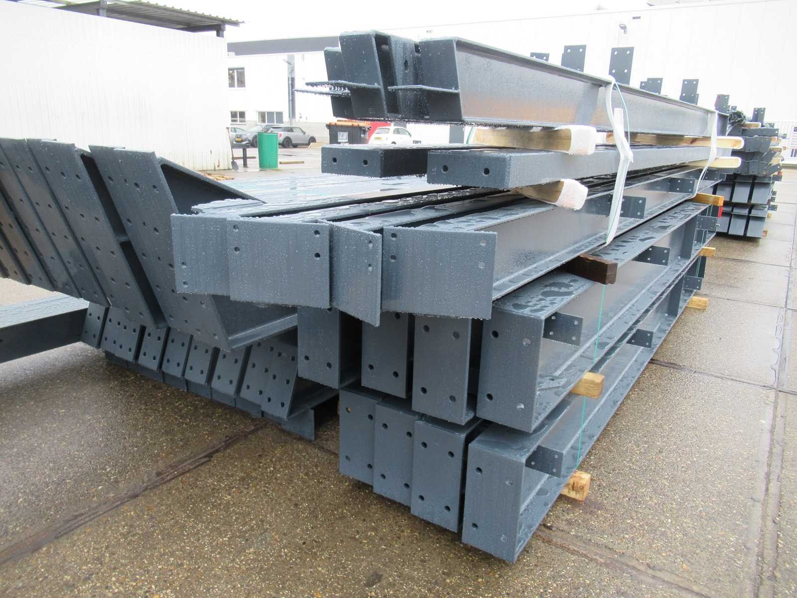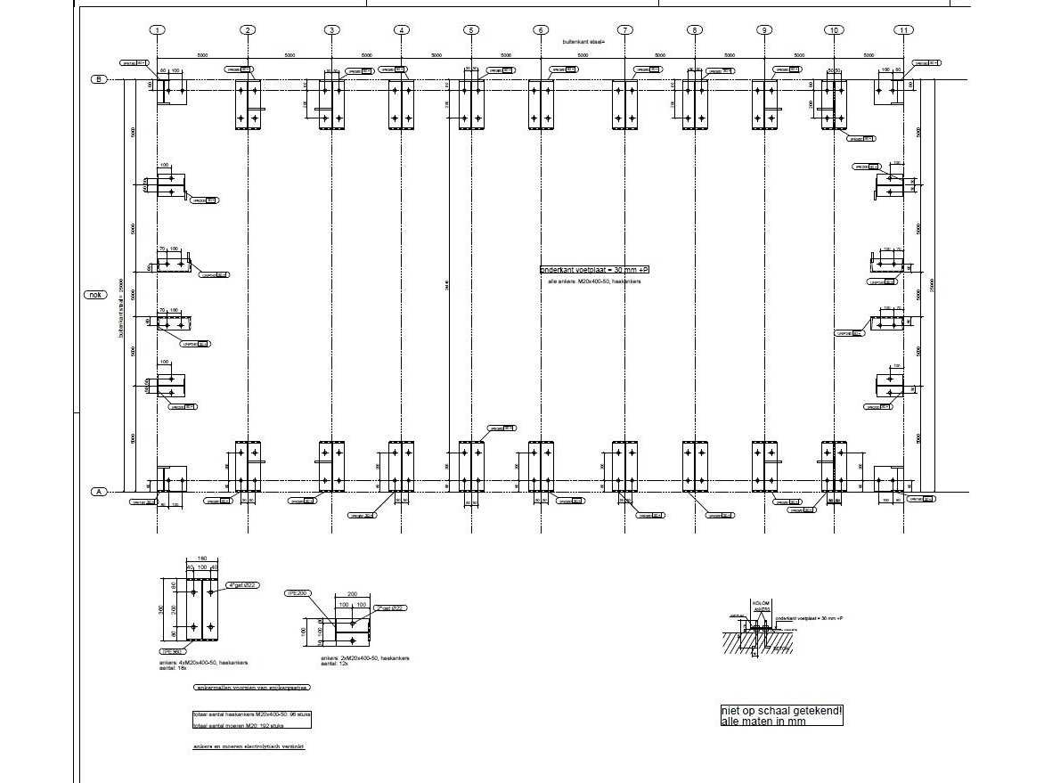 Nederlandse productie; vrije overspanning; spanten h.o.h. 5000mm; staalberekeningen; staaltekeningen; montagetekeningen; ankerplan; staal genummerd volgens montageplan; dakhelling 20 graden; 9 sets tussenspanten IPE360/300; 2 sets eindspanten IPE 200/180 met windstijlen waarvan 1 set voorzien is van een deursparing; voorzien van drukkokers; windverbanden; gordinglippen; bouten en moeren; meestort ankers; staalconstructie volgens productnorm EN1090 (Certificaat na aankoop verkrijgbaar); kavel ligt netjes transportklaar en dient met 2 trailers opgehaald te worden; kavel wordt gratis met een heftruck geladen No Materiaal: Gepoedercoat staal antraciet Bouwjaar: 2026 Totaal oppervlakte: 1250m² Nok hoogte: 9050mm Goot hoogte: 4500mm Totale afmeting L: 50000mm Totale afmeting Breedte: 25000mm
