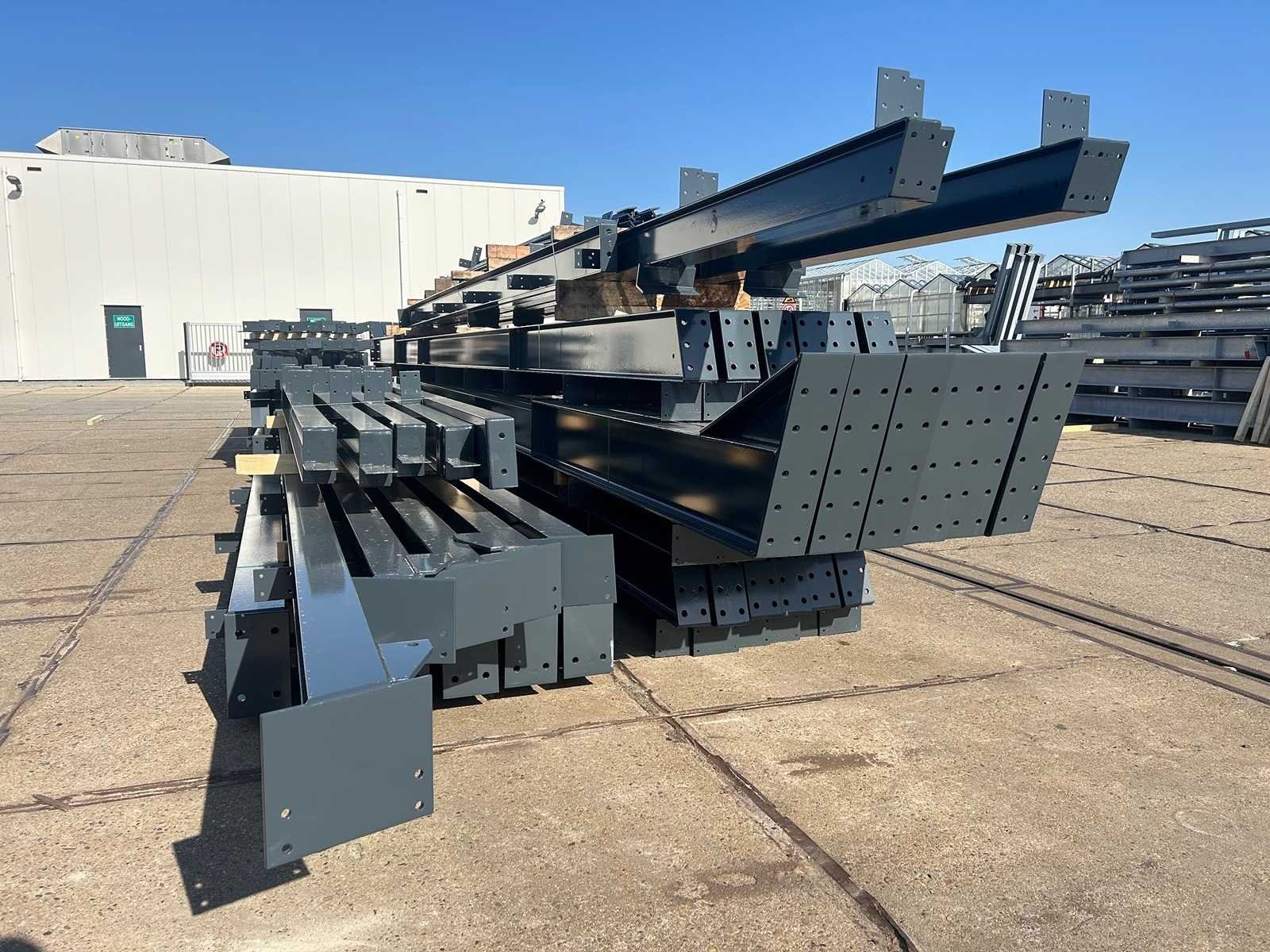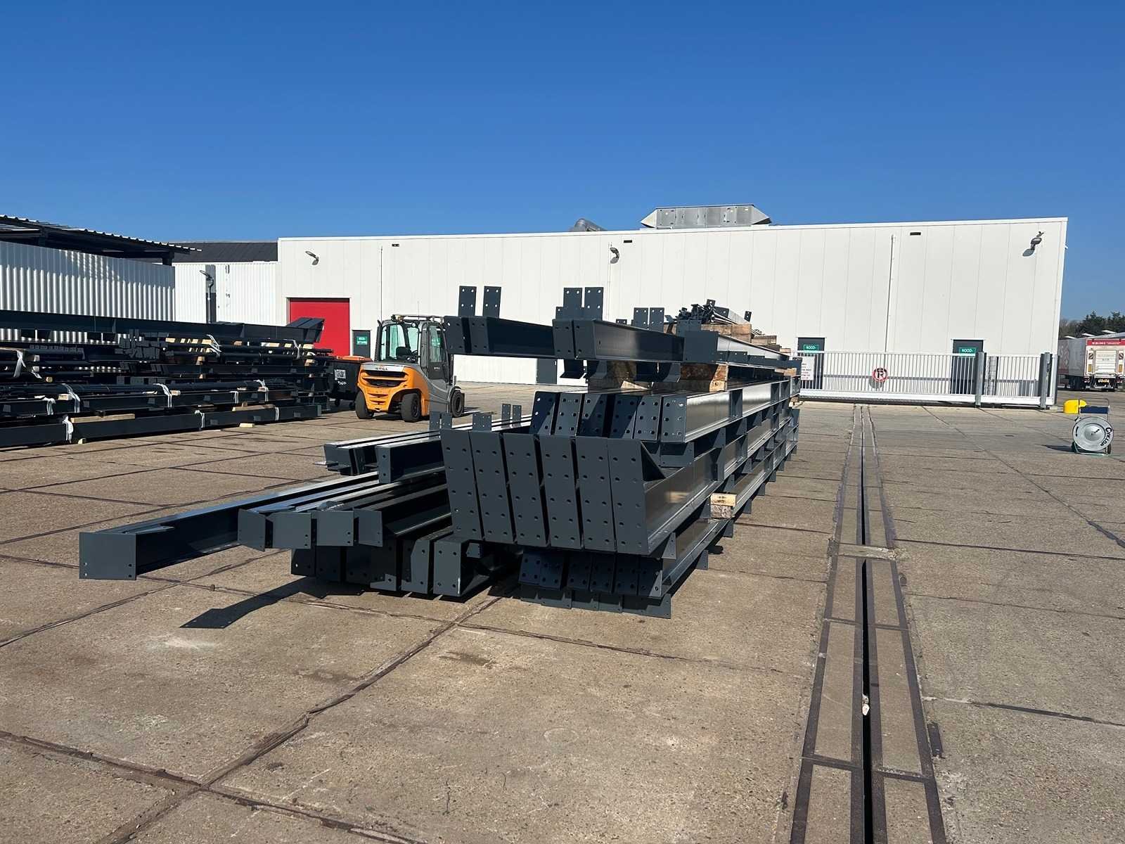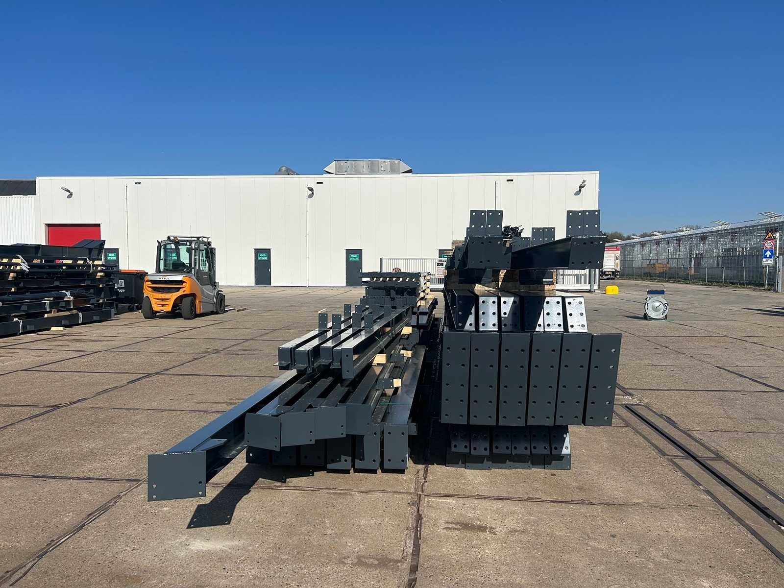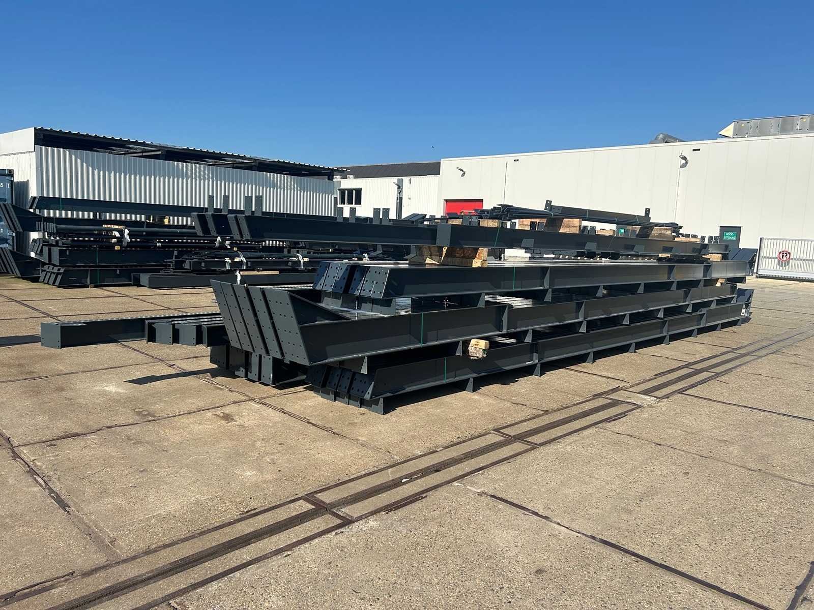 Nederlandse productie; vrije overspanning; spanten h.o.h. 5000mm; staalberekeningen; staaltekeningen; montagetekeningen; ankerplan; staal genummerd volgens montageplan; dakhelling 20 graden; 9 sets tussenspanten IPE330/270; 2 sets eindspanten IPE 220/200/180 met windstijlen waarvan 1 set voorzien is van een deursparing UNP220; voorzien van drukkokers; windverbanden; gordinglippen; bouten en moeren; meestort ankers; staalconstructie volgens productnorm EN1090 (Certificaat na aankoop verkrijgbaar); kavel ligt netjes transportklaar en dient met 1 trailer opgehaald te worden; kavel wordt gratis met een heftruck geladen No Materiaal: Gepoedercoat staal antraciet Bouwjaar: 2026 Totaal oppervlakte: 1100m² Nok hoogte: 8504mm Goot hoogte: 4500mm Totale afmeting L: 50000mm Totale afmeting Breedte: 22000mm