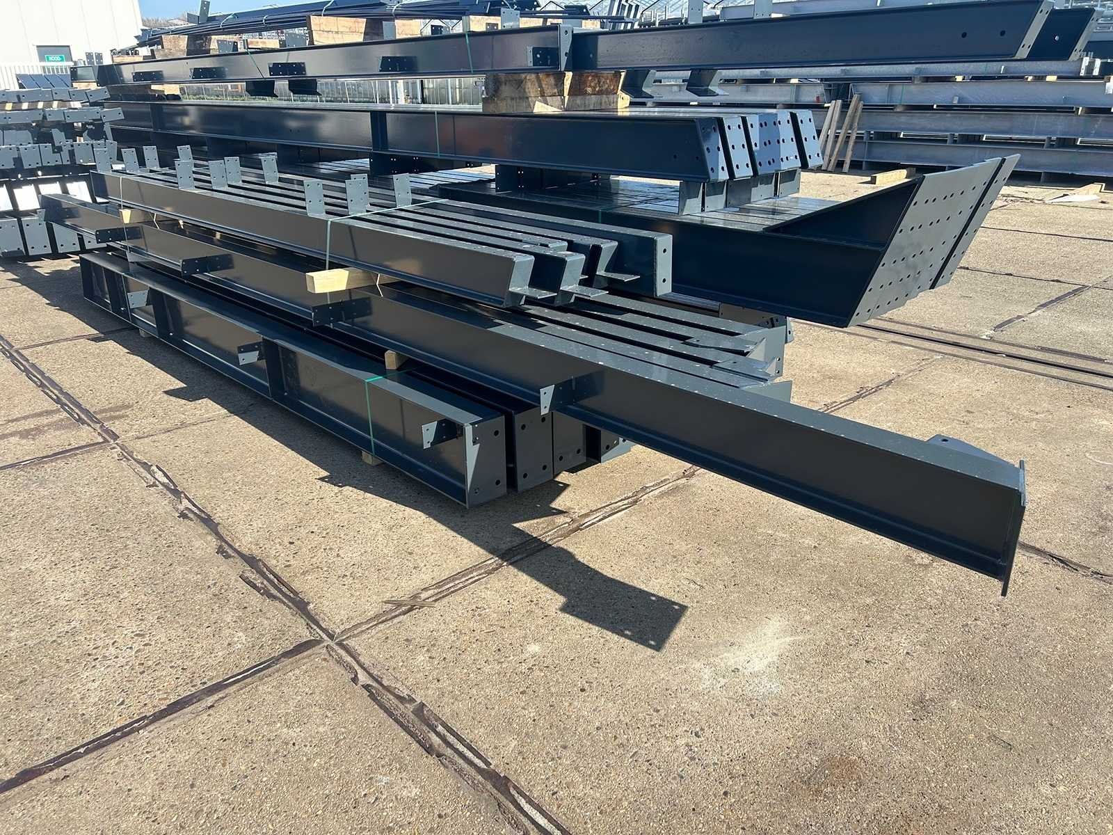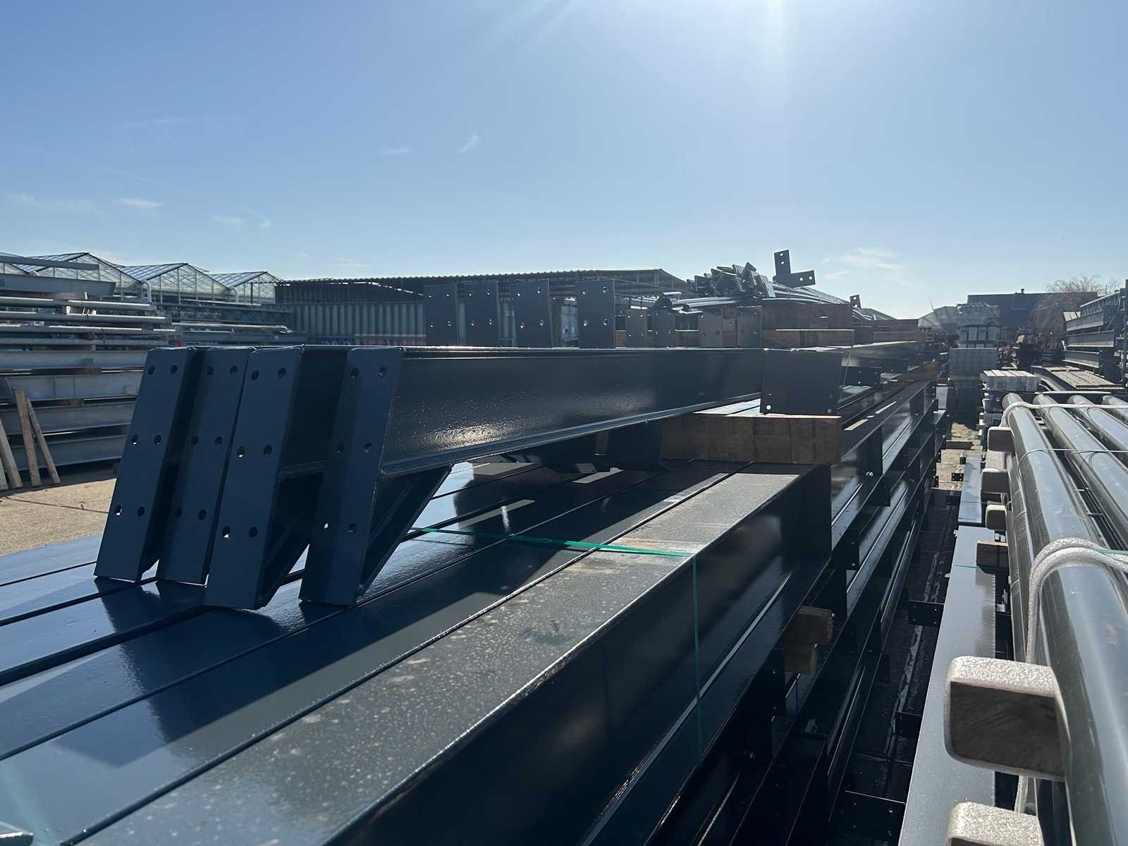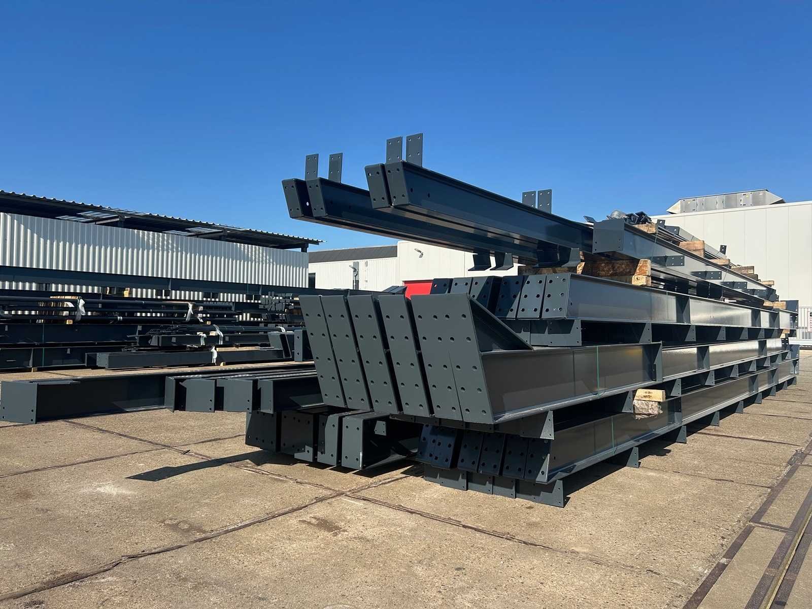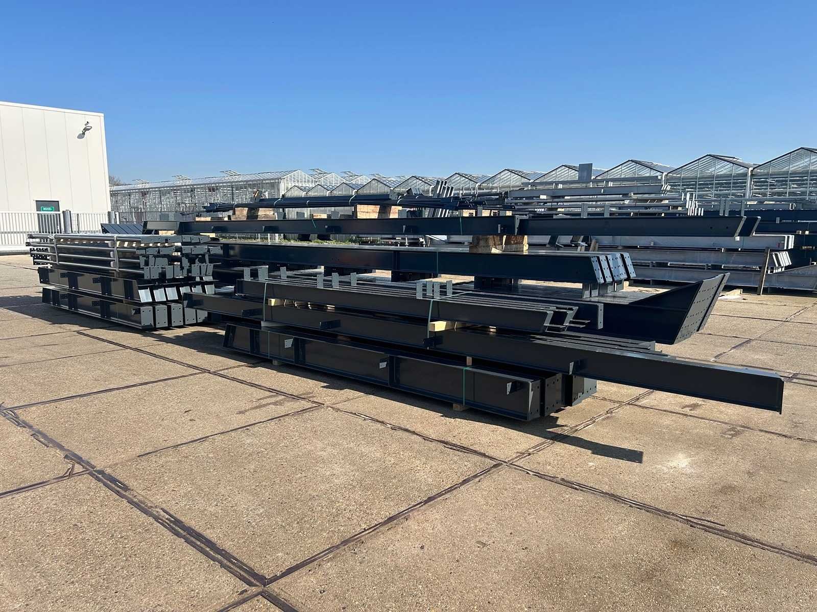 Nederlandse productie; vrije overspanning; spanten h.o.h. 5000mm; staalberekeningen; staaltekeningen; montagetekeningen; ankerplan; staal genummerd volgens montageplan; dakhelling 20 graden; 9 sets tussenspanten IPE330/270; 2 sets eindspanten IPE 220/200/180 met windstijlen waarvan 1 set voorzien is van een deursparing UNP220; voorzien van drukkokers; windverbanden; gordinglippen; bouten en moeren; meestort ankers; staalconstructie volgens productnorm EN1090 (Certificaat na aankoop verkrijgbaar); kavel ligt netjes transportklaar en dient met 1 trailer opgehaald te worden; kavel wordt gratis met een heftruck geladen No Materiaal: Gepoedercoat staal antraciet Bouwjaar: 2026 Totaal oppervlakte: 1100m² Nok hoogte: 8504mm Goot hoogte: 4500mm Totale afmeting L: 50000mm Totale afmeting Breedte: 22000mm
