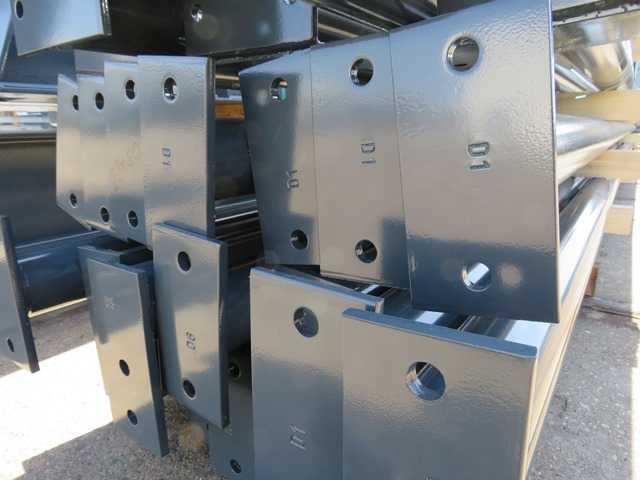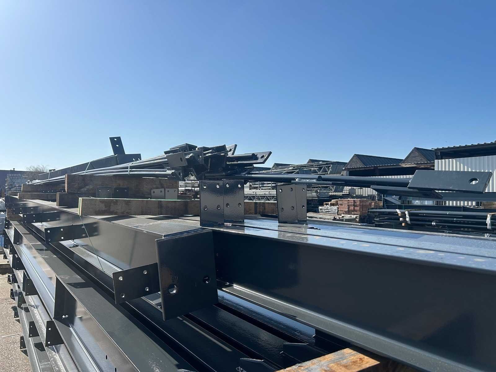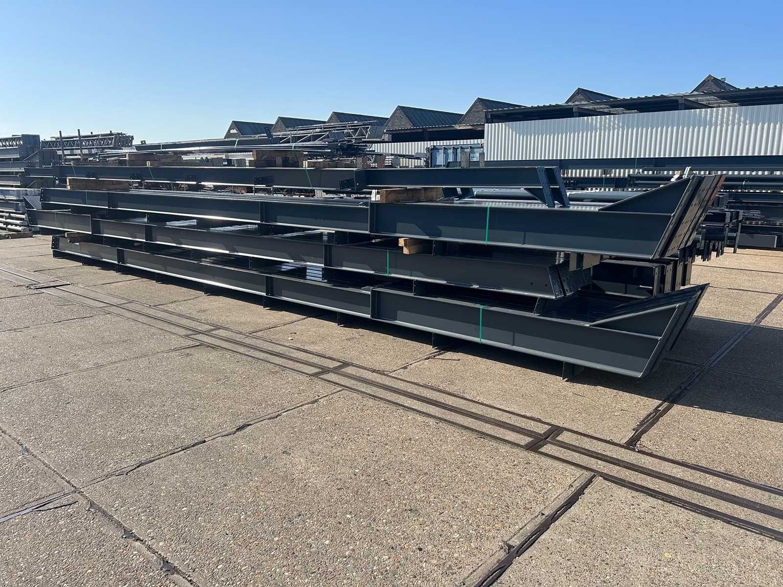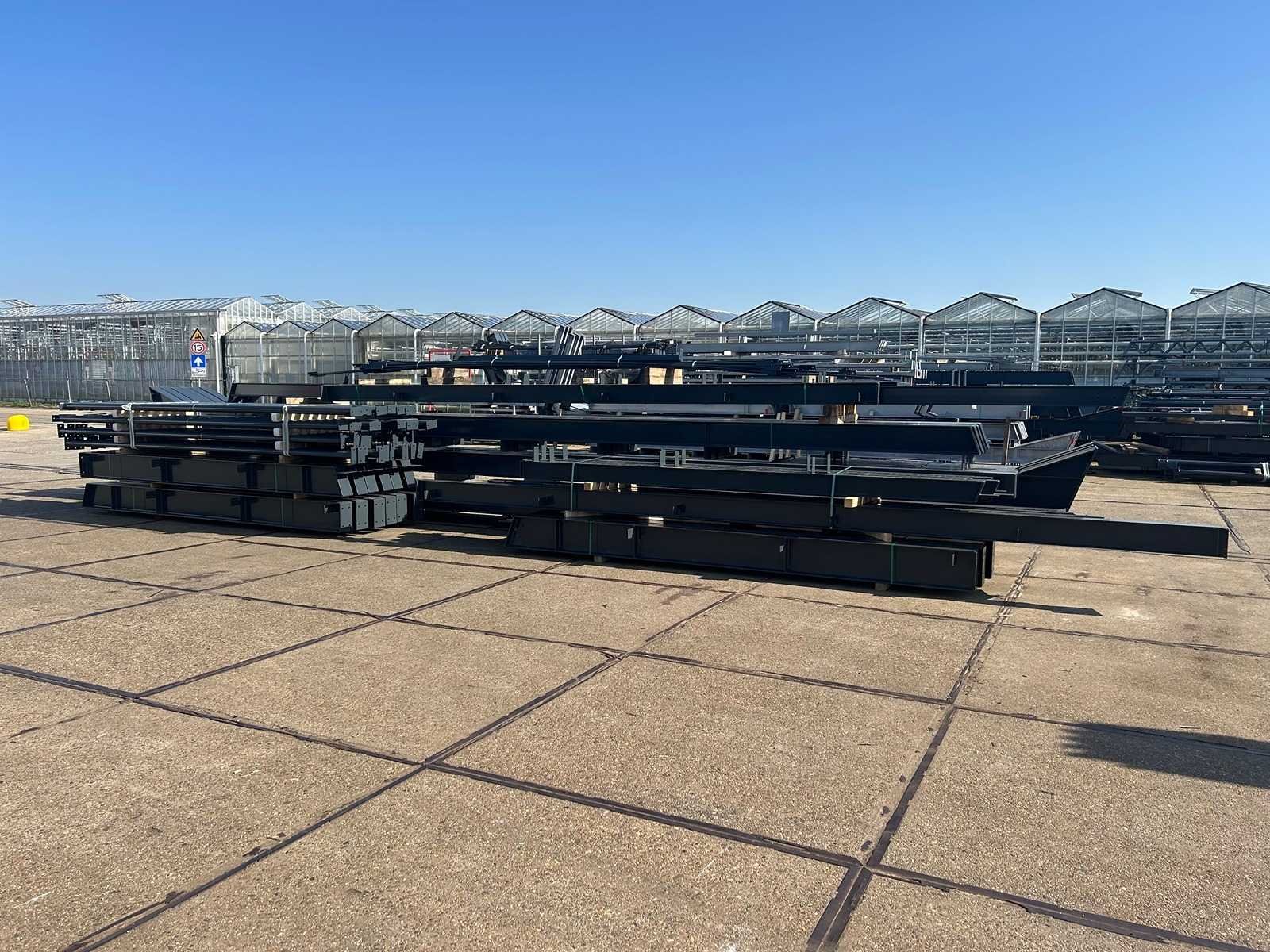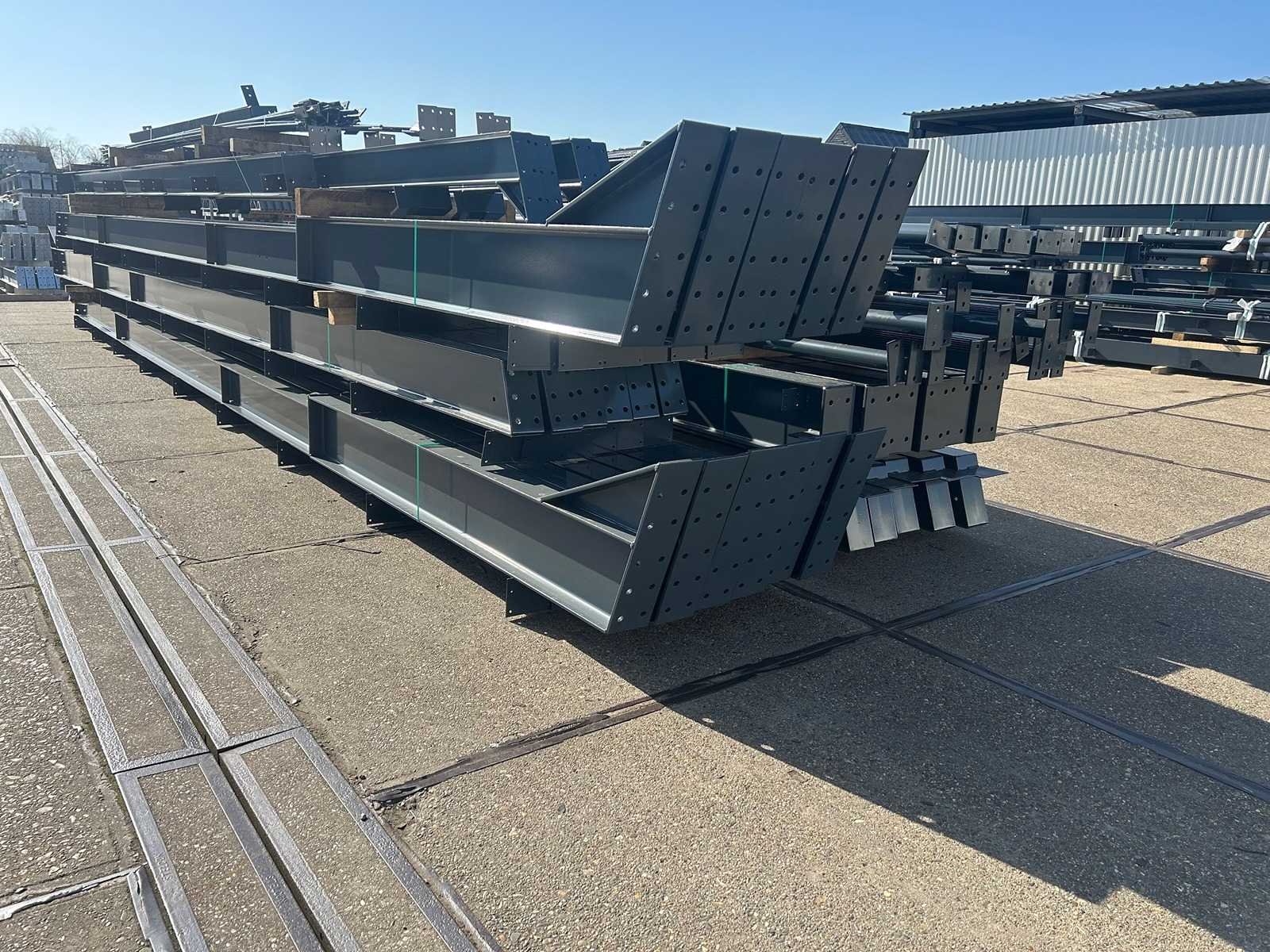 Nederlandse productie; vrije overspanning; spanten h.o.h. 5000mm; staalberekeningen; staaltekeningen; montagetekeningen; ankerplan; staal genummerd volgens montageplan; dakhelling 20 graden; 9 sets tussenspanten IPE330/270; 2 sets eindspanten IPE 220/200/180 met windstijlen waarvan 1 set voorzien is van een deursparing UNP220; voorzien van drukkokers; windverbanden; gordinglippen; bouten en moeren; meestort ankers; staalconstructie volgens productnorm EN1090 (Certificaat na aankoop verkrijgbaar); kavel ligt netjes transportklaar en dient met 1 trailer opgehaald te worden; kavel wordt gratis met een heftruck geladen No Materiaal: Gepoedercoat staal antraciet Bouwjaar: 2026 Totaal oppervlakte: 1100m² Nok hoogte: 8504mm Goot hoogte: 4500mm Totale afmeting L: 50000mm Totale afmeting Breedte: 22000mm