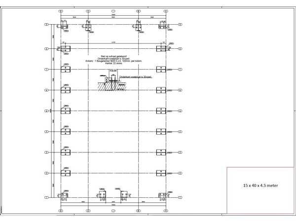 Nederlandse productie; vrije overspanning; spanten h.o.h. 5000mm; staalberekeningen; staaltekeningen; montagetekeningen; ankerplan; staal genummerd volgens montageplan; dakhelling 20 graden; 7 sets tussenspanten IPE 270/240; 2 sets eindspanten IPE 200/180 met windstijlen waarvan 1 set voorzien is van een deursparing; voorzien van drukkokers; windverbanden; gordinglippen; bouten en moeren; meestort ankers; staalconstructie volgens productnorm EN1090 (Certificaat na aankoop verkrijgbaar); kavel ligt netjes transportklaar en dient met 1 trailer opgehaald te worden; kavel wordt gratis met een heftruck geladen No Materiaal: gepoedercoat staal antraciet Bouwjaar: 2026 Totaal oppervlakte: 600m² Nok hoogte: 7230mm Goot hoogte: 4500mm Totale afmeting L: 40000mm Totale afmeting Breedte: 15000mm