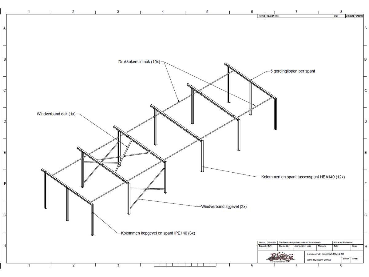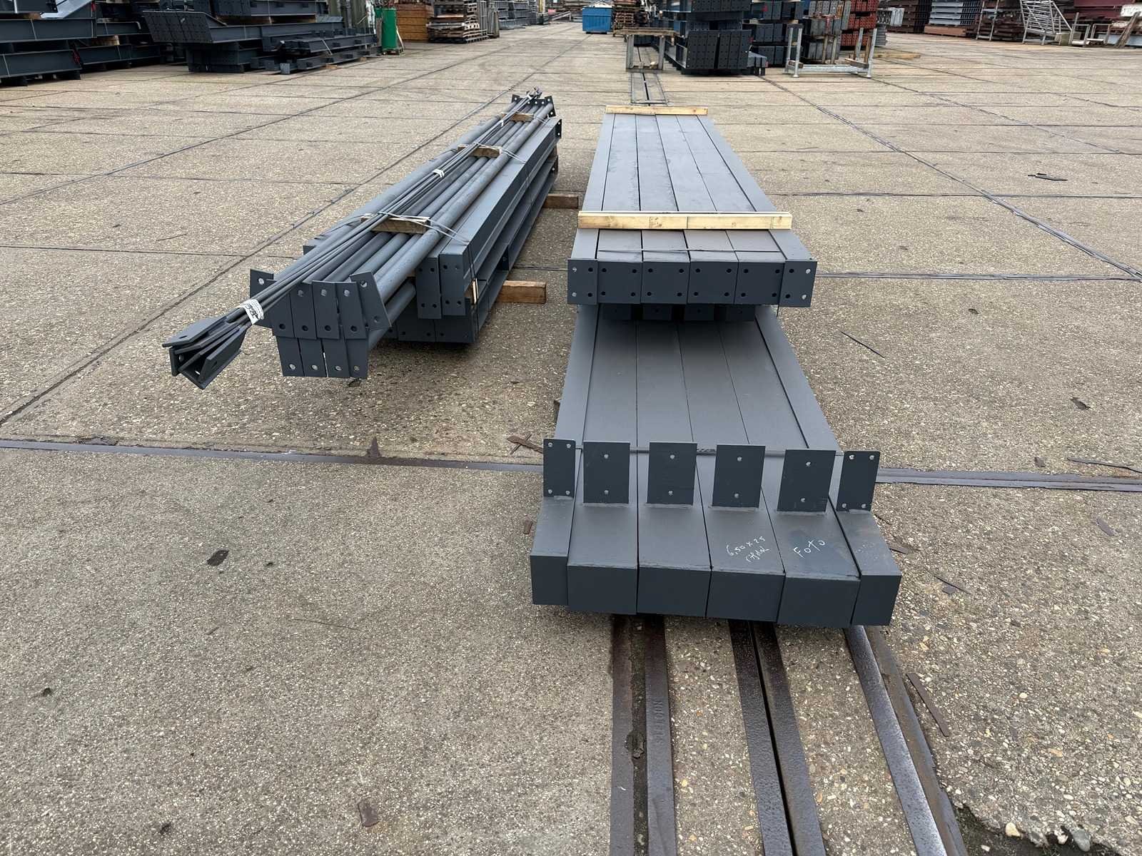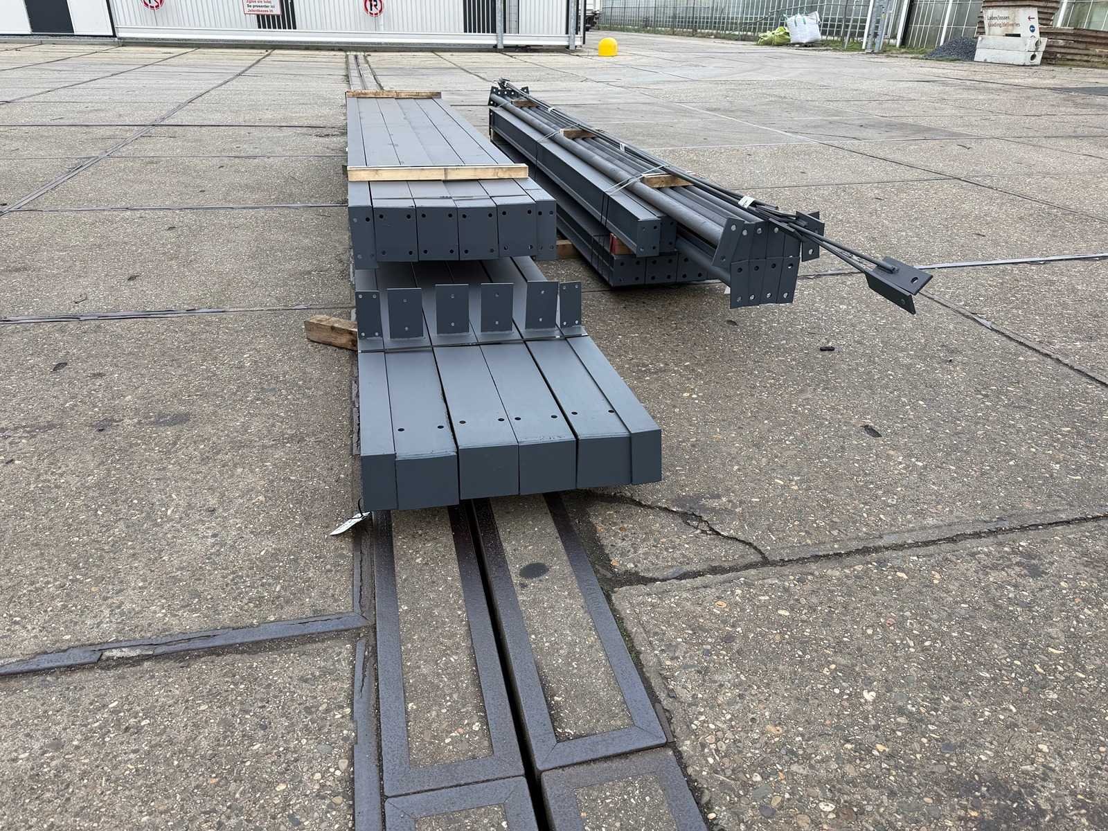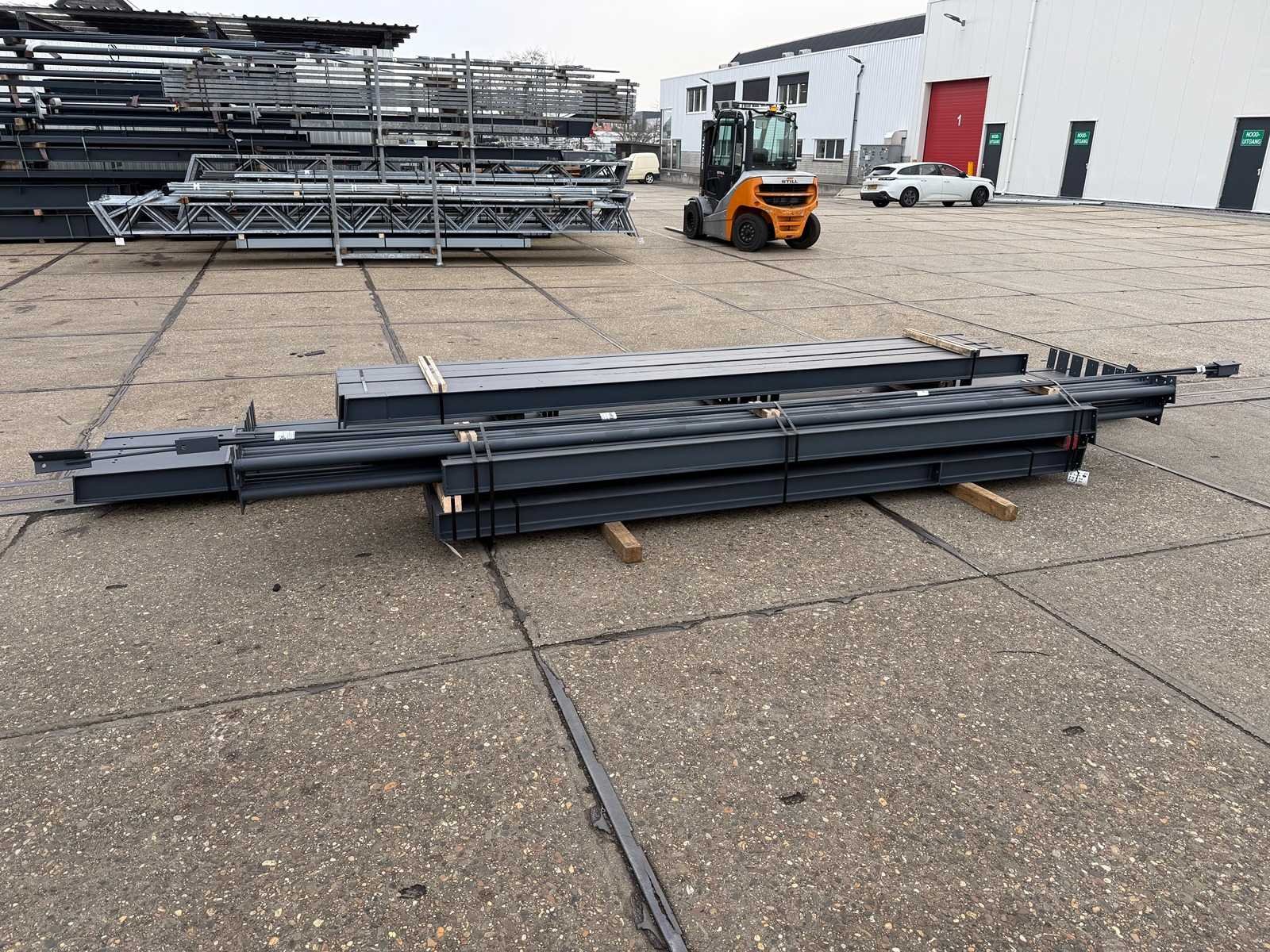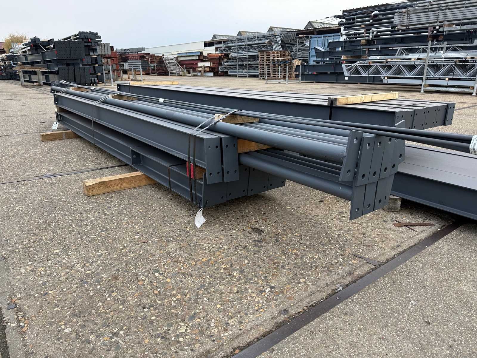 Vrije overspanning afdak constructie; spanten h.o.h. 5000mm; hoogte voorkant 4450mm, hoogte achterkant 3650mm; 4 sets tussenspanten HEA140; 2 sets kopgevelspanten IPE140 met windstijlen; staaltekening; 3D-tekening; voorzien van drukkokers; windverbanden; gordinglippen op de spanten; kavel ligt netjes transportklaar en dient met 1 trailer opgehaald te worden; kavel wordt gratis met een heftruck geladen No Materiaal: Geschilderd staal antraciet Type: Afdak Totaal oppervlakte: 162m² Nok hoogte: 4450mm Goot hoogte: 3650mm Totale afmeting L: 25000mm Totale afmeting Breedte: 6500mm
