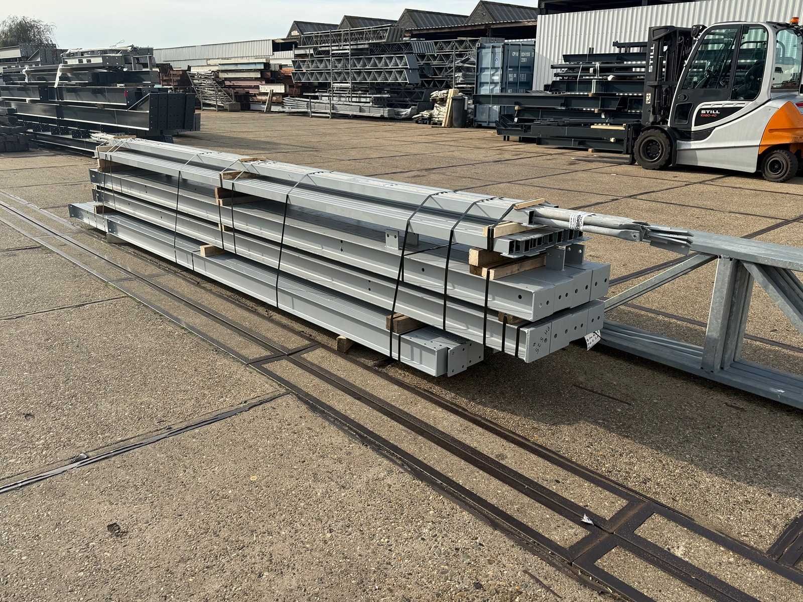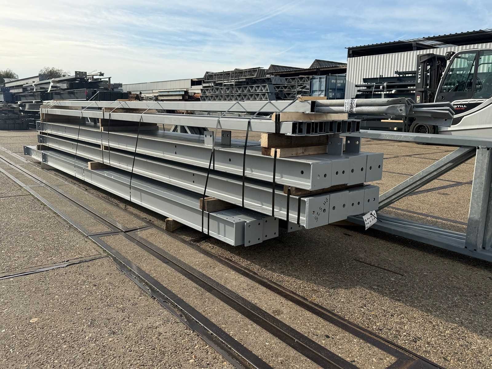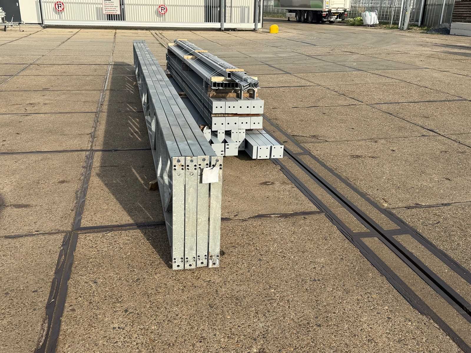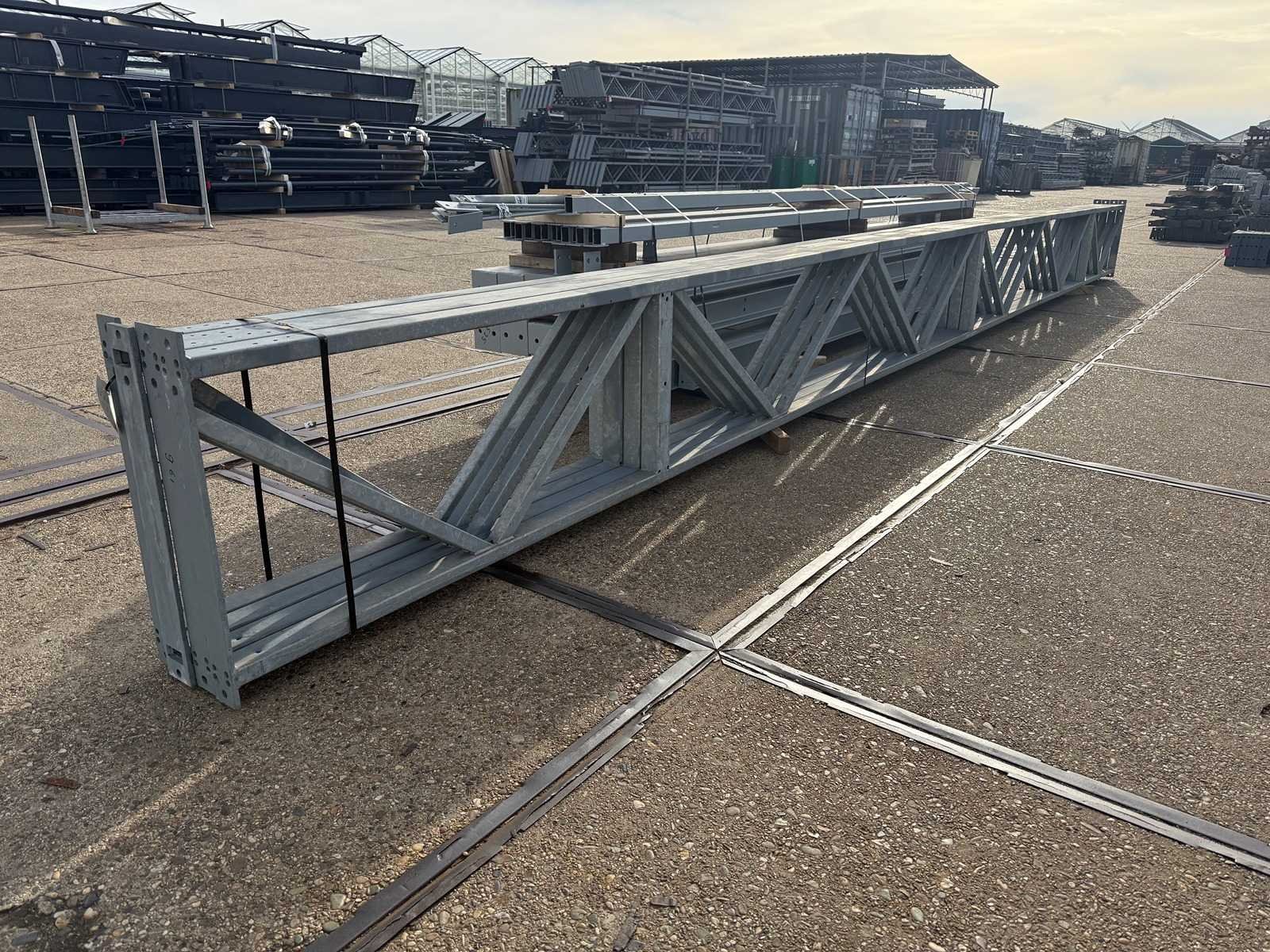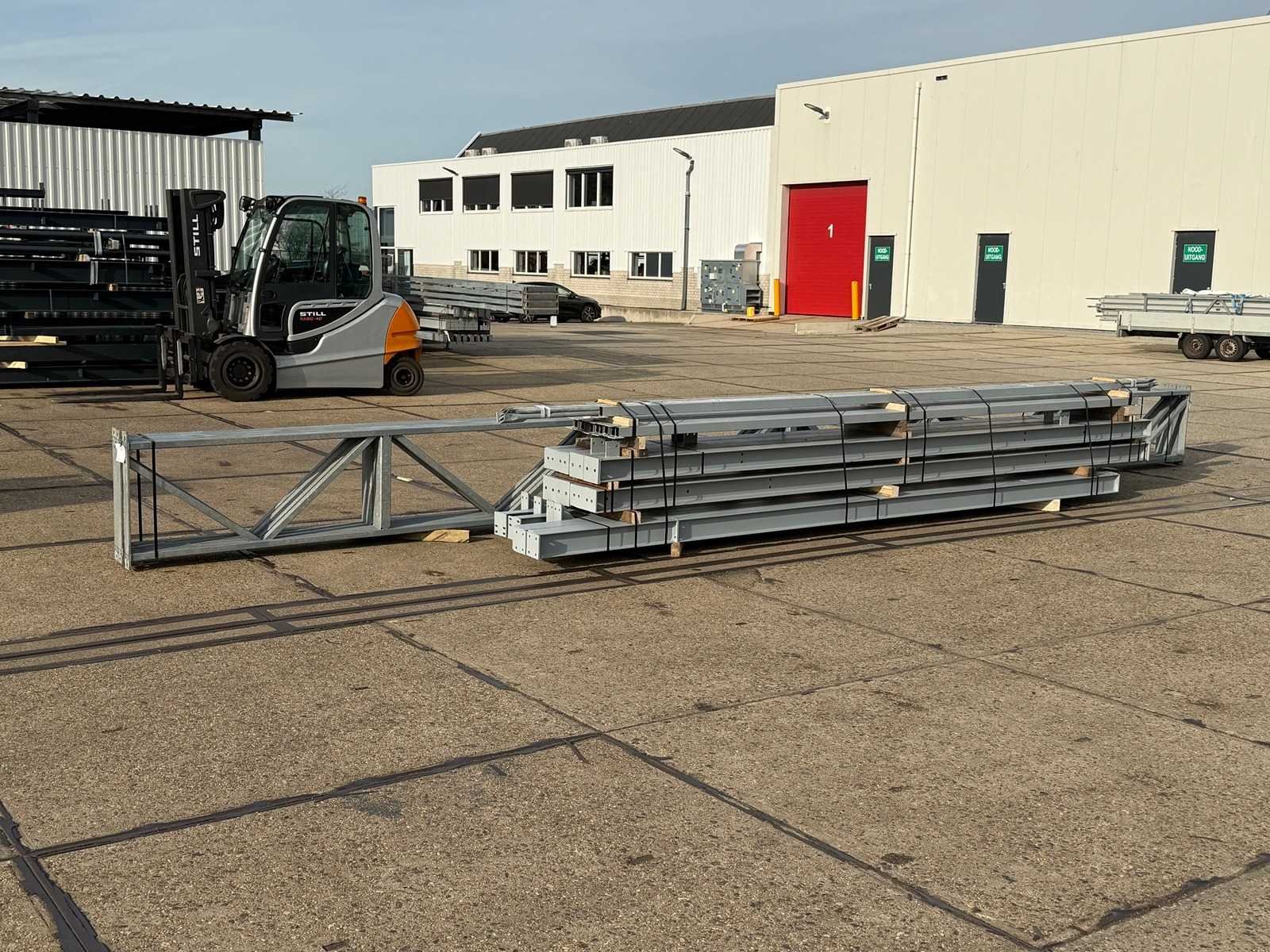 Zware platdak staalconstructie; vrije overspanning; spanten h.o.h. 5000mm; bestaande uit 4 sets tussenspanten zware tralieliggers met HEA140 als staanders; 2 sets eindspanten met windstijlen in IPE140 voorzien van windverbanden en kruisschoren; staalconstructie ligt netjes transportklaar en dient met 1 trailer opgehaald te worden; kavels wordt gratis met een heftruck geladen No Materiaal: Gegalvaniseerd en geschilderd staal Type: Platdak Totaal oppervlakte: 240m² Nok hoogte: 5250mm Goot hoogte: 5250mm Totale afmeting L: 25000mm Totale afmeting Breedte: 9600mm