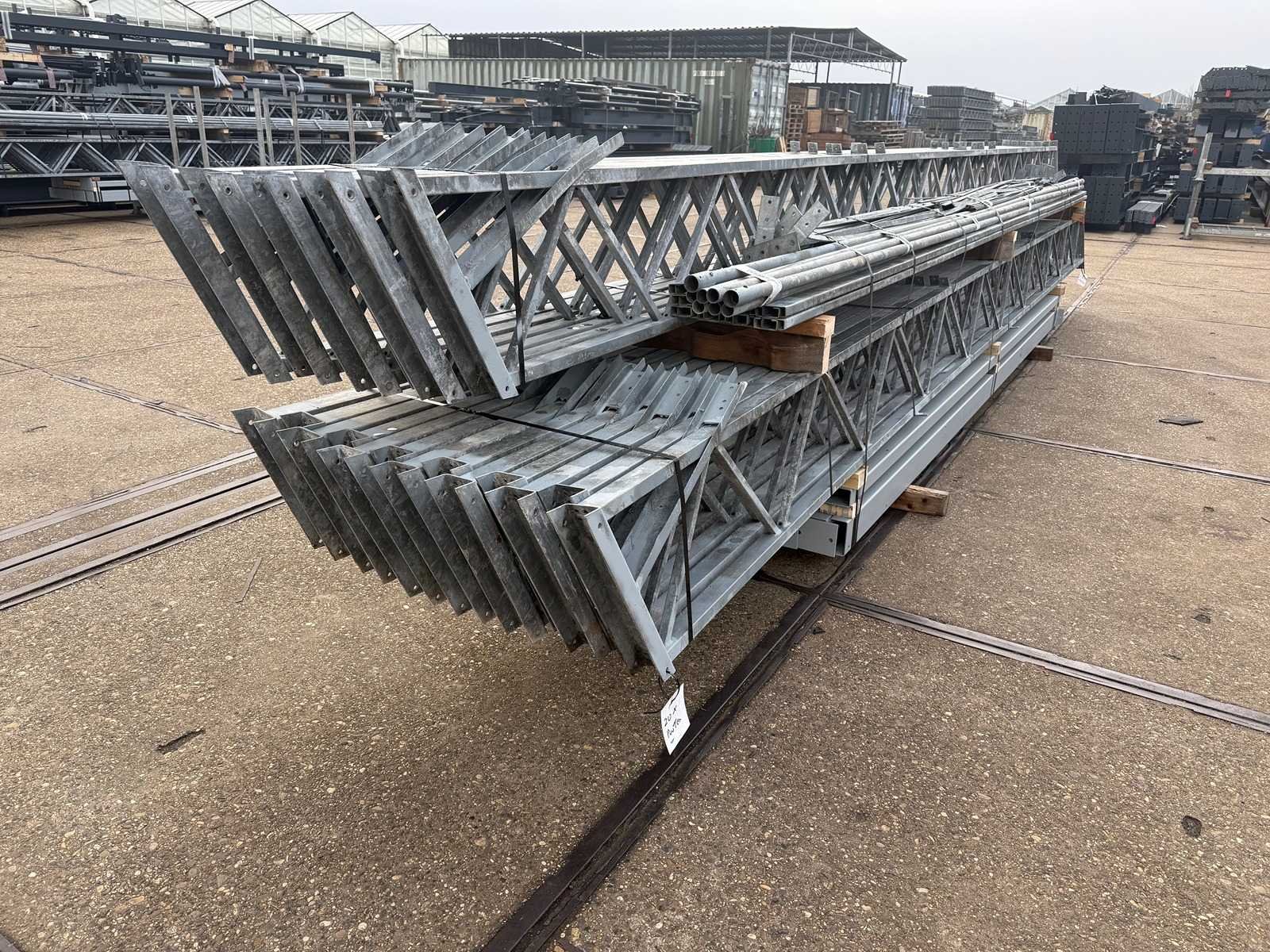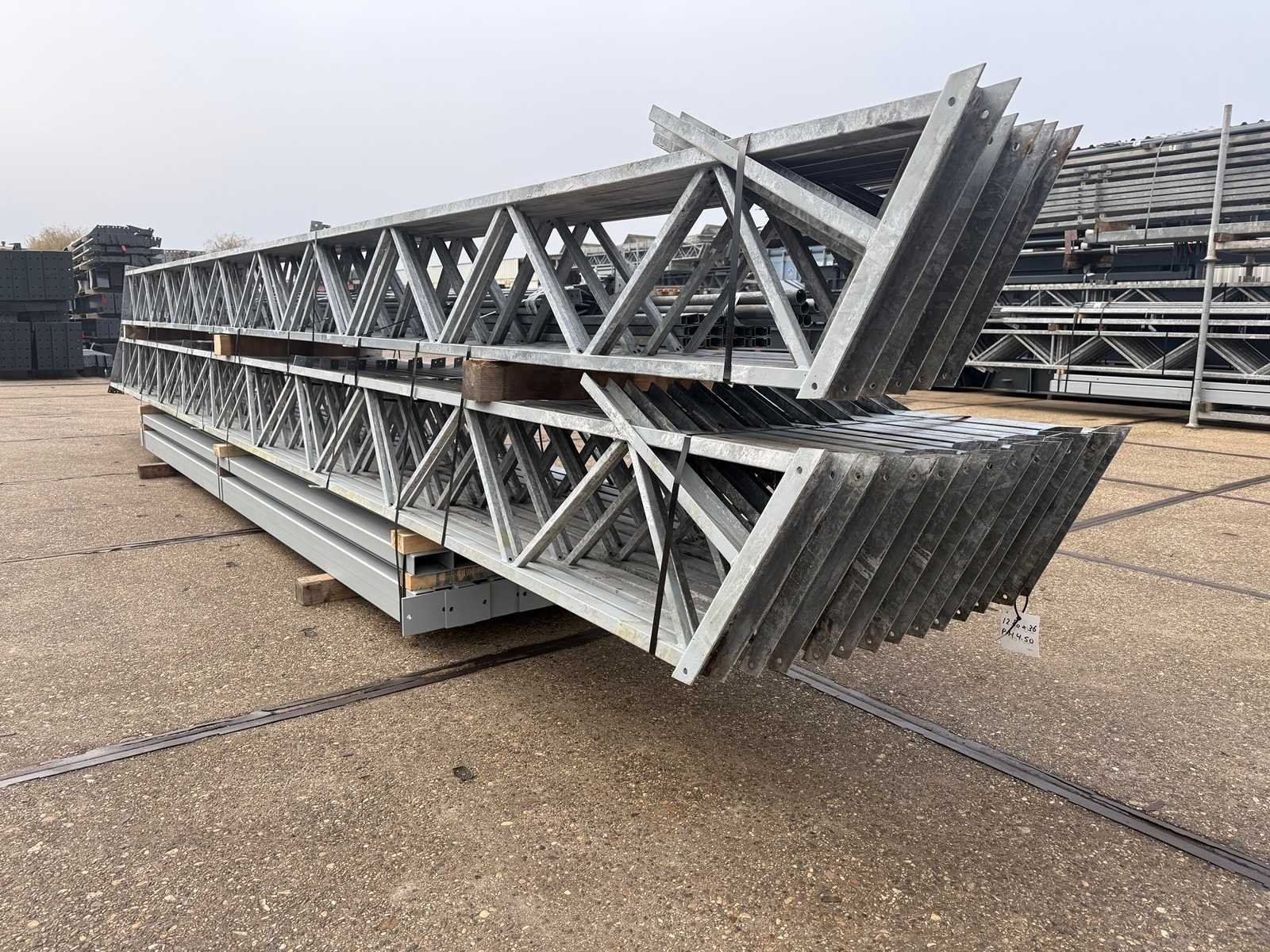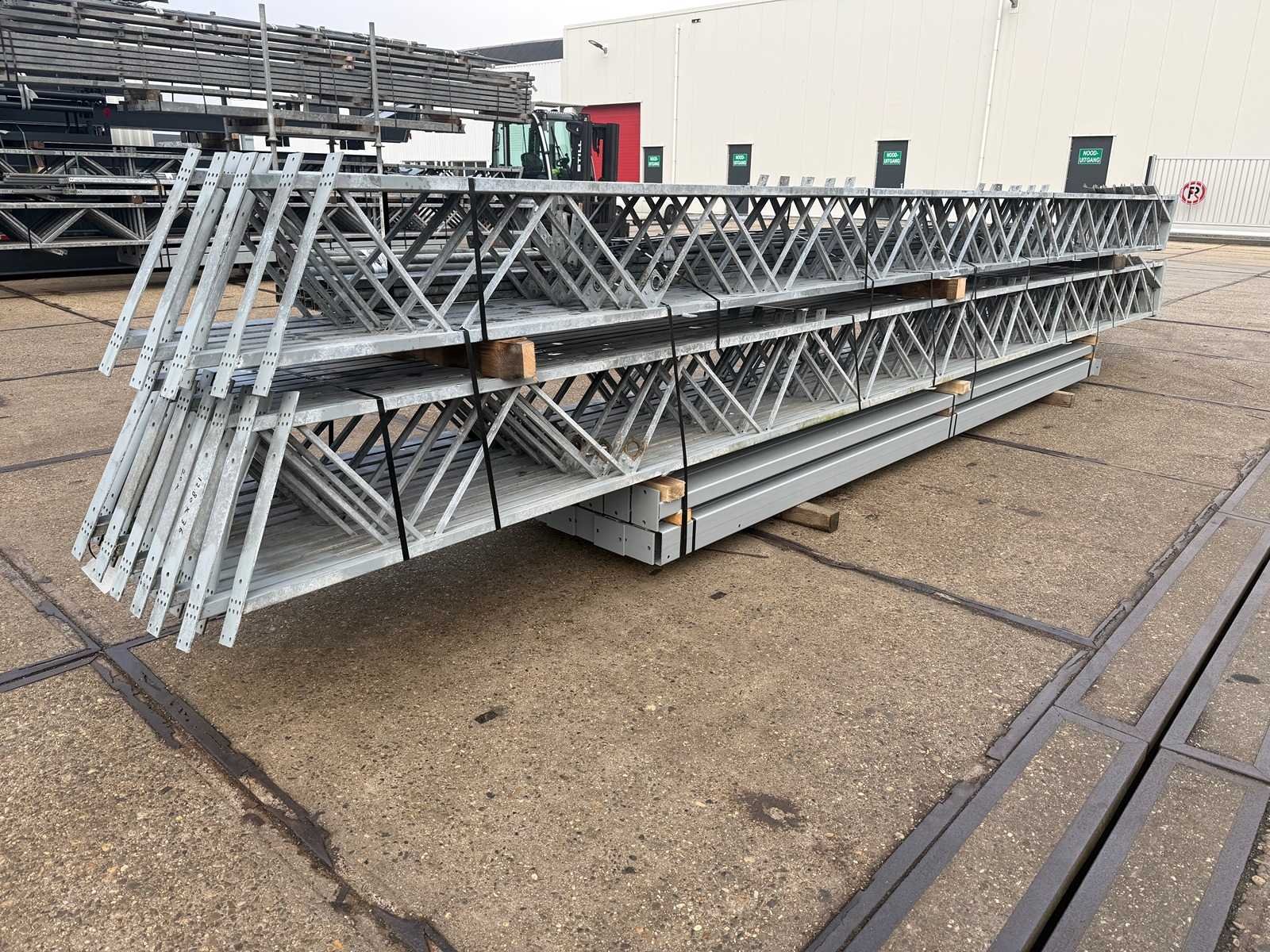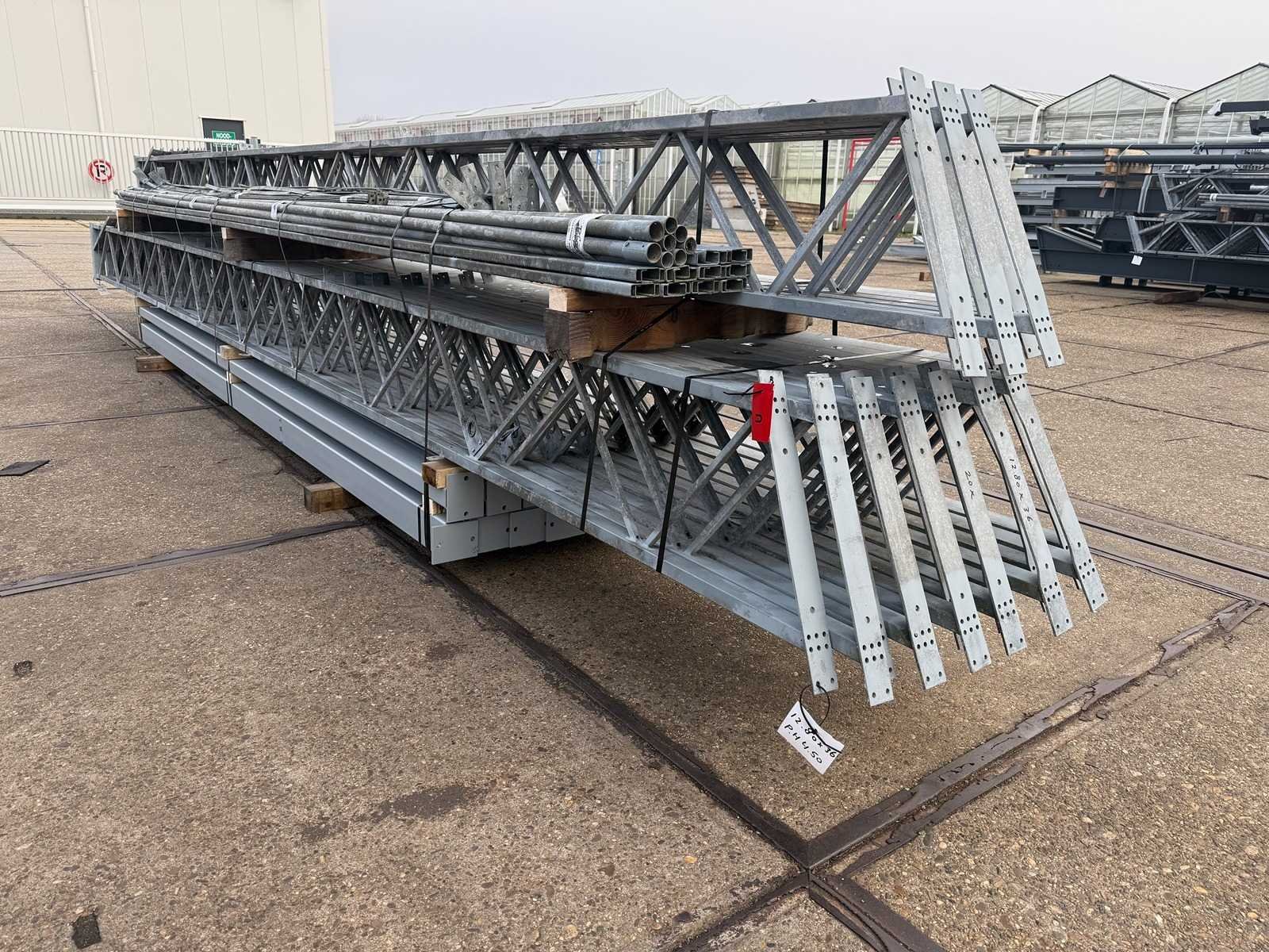 Overspanning trekstang tussen de spanten; spanten h.o.h. 4000mm; kokerprofiel als staanders en traliespanten; staaltekening; 3D-tekening; dakhelling 25 graden; 10 sets tussenspanten; voorzien van trekstangen met ophangstrips; windverbanden; kavel ligt netjes transportklaar en dient met 1 trailer opgehaald te worden; kavel wordt gratis met een heftruck geladen No Materiaal: gegalvaniseerd en geschilderd staal Totaal oppervlakte: 460m² Nok hoogte: 7000mm Goot hoogte: 4500mm Totale afmeting L: 36000mm Totale afmeting Breedte: 12800mm