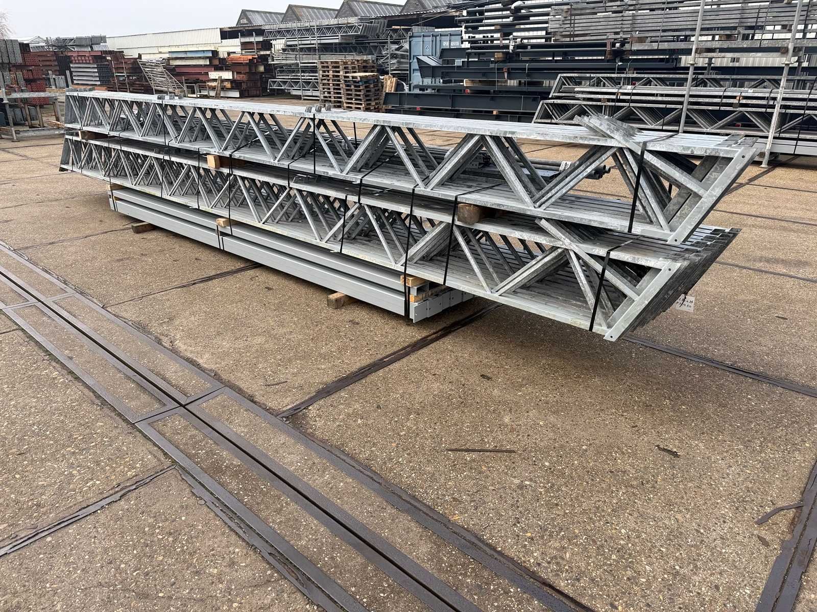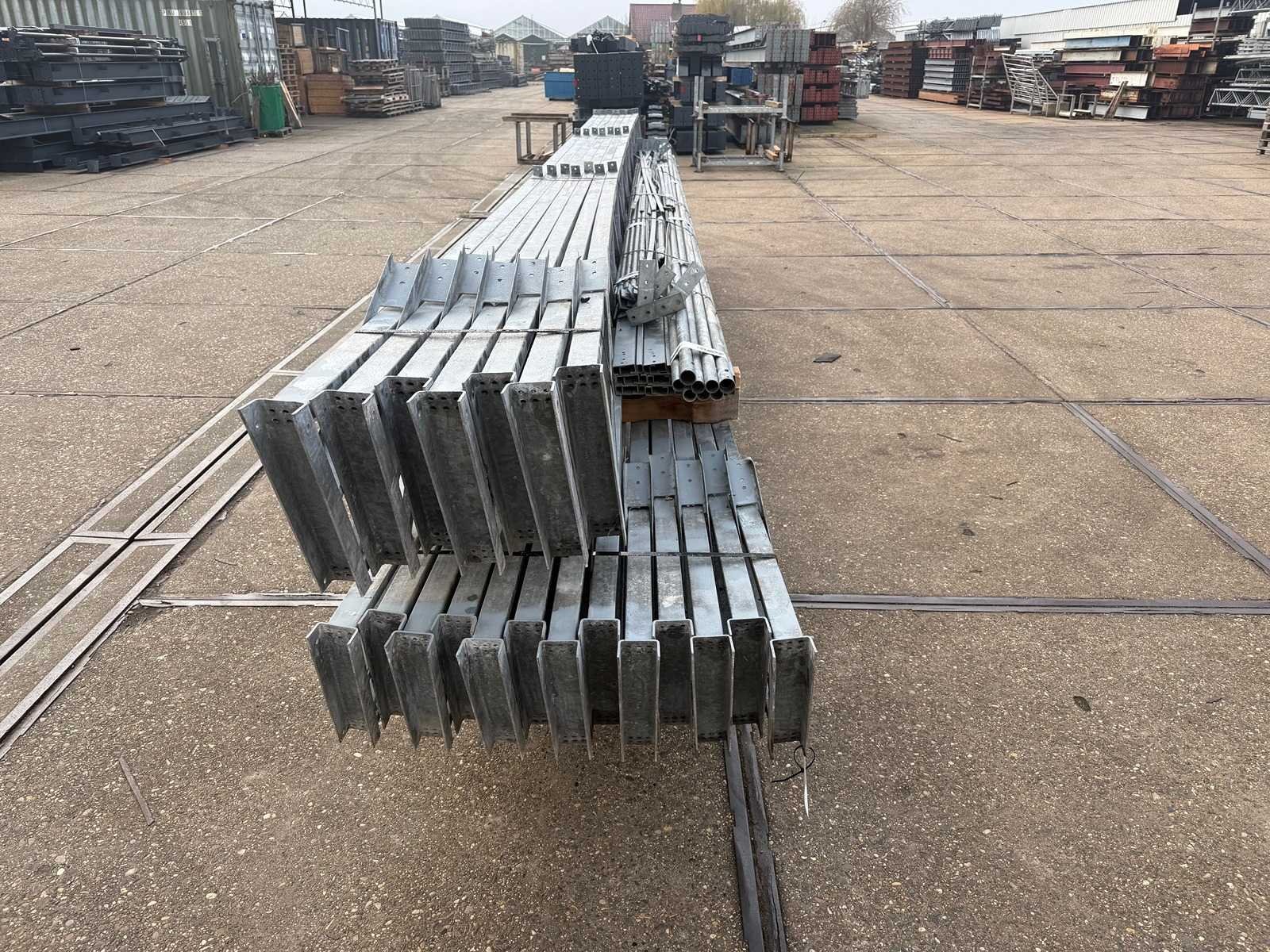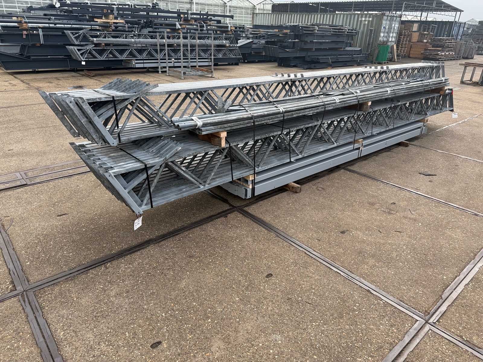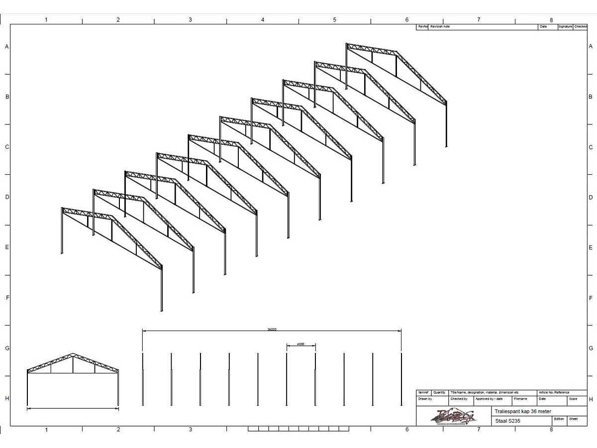 Overspanning trekstang tussen de spanten; spanten h.o.h. 4000mm; kokerprofiel als staanders en traliespanten; staaltekening; 3D-tekening; dakhelling 25 graden; 10 sets tussenspanten; voorzien van trekstangen met ophangstrips; windverbanden; kavel ligt netjes transportklaar en dient met 1 trailer opgehaald te worden; kavel wordt gratis met een heftruck geladen No Materiaal: gegalvaniseerd en geschilderd staal Totaal oppervlakte: 460m² Nok hoogte: 7000mm Goot hoogte: 4500mm Totale afmeting L: 36000mm Totale afmeting Breedte: 12800mm