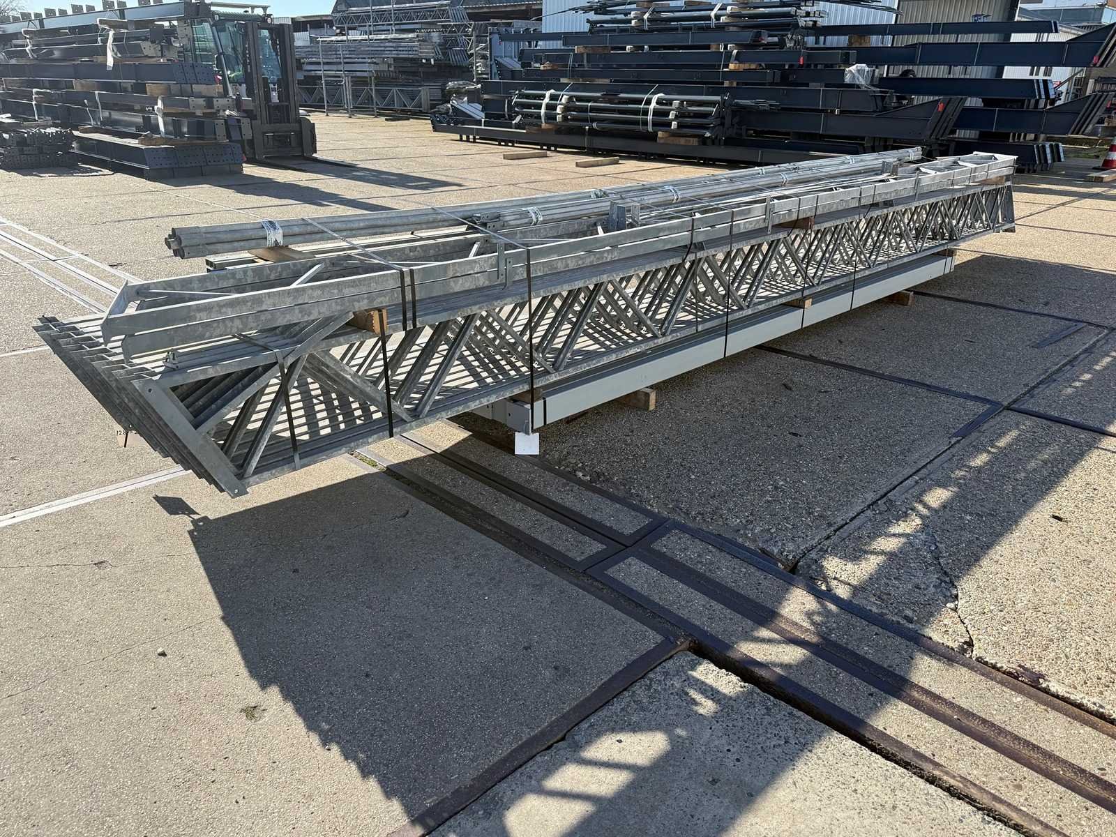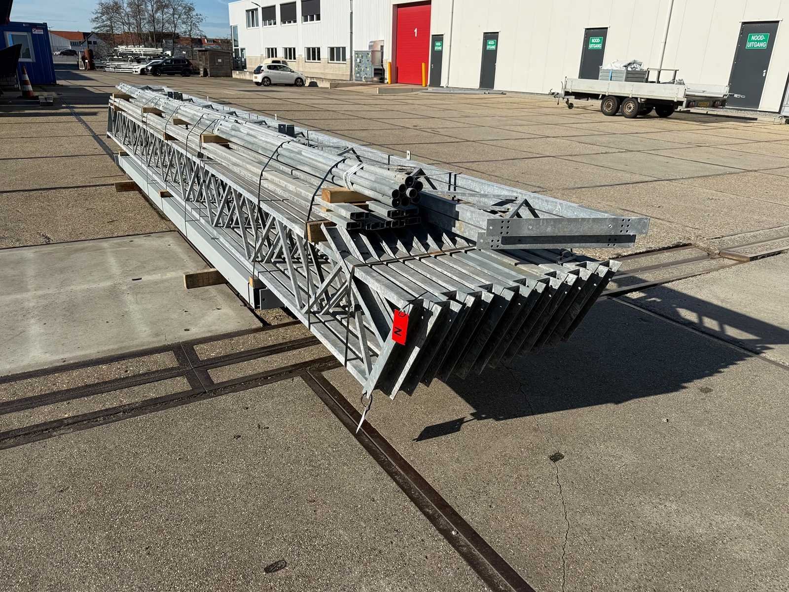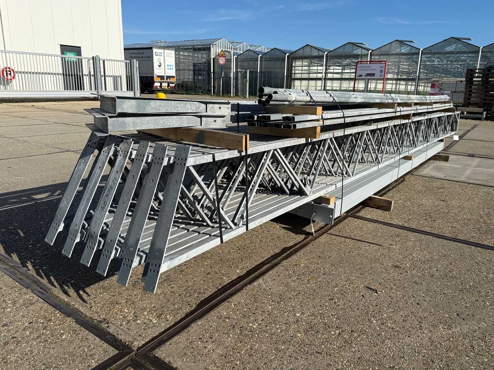 Overspanning trekstang tussen de spanten; spanten h.o.h. 4000mm; kokerprofiel als staanders en traliespanten; staaltekening; 3D-tekening; dakhelling 25 graden; 7 sets tussenspanten; voorzien van trekstangen met ophangstrips; windverbanden en kruisschoren; kavel ligt netjes transportklaar en dient met 1 trailer opgehaald te worden; kavel wordt gratis met een heftruck geladen No Materiaal: Gegalvaniseerd en geschilderd staal Totaal oppervlakte: 307m² Nok hoogte: 7000mm Goot hoogte: 4500mm Totale afmeting L: 24000mm Totale afmeting Breedte: 12800mm