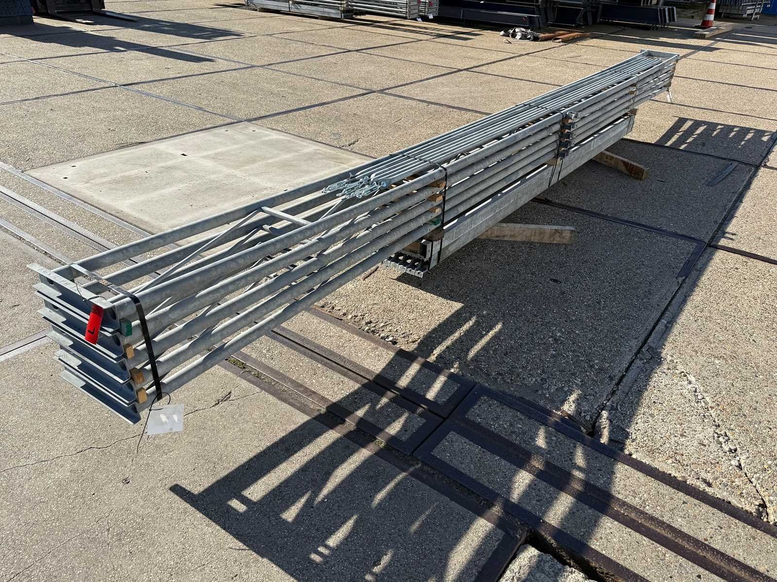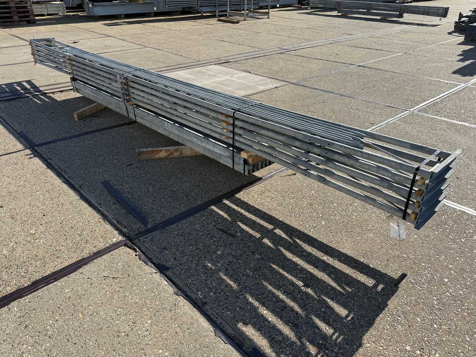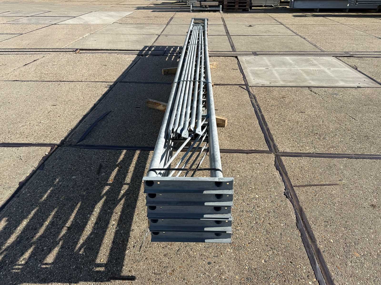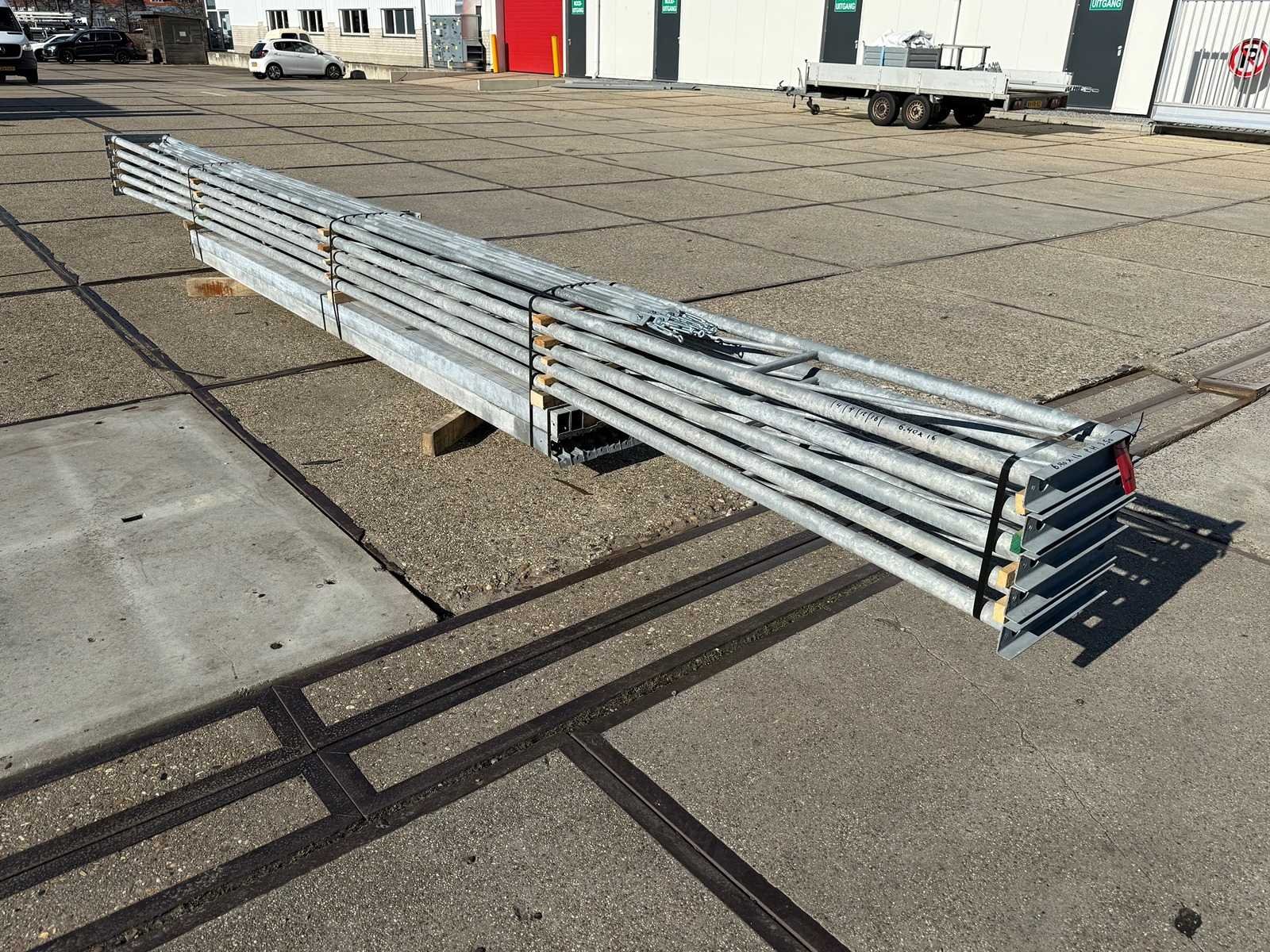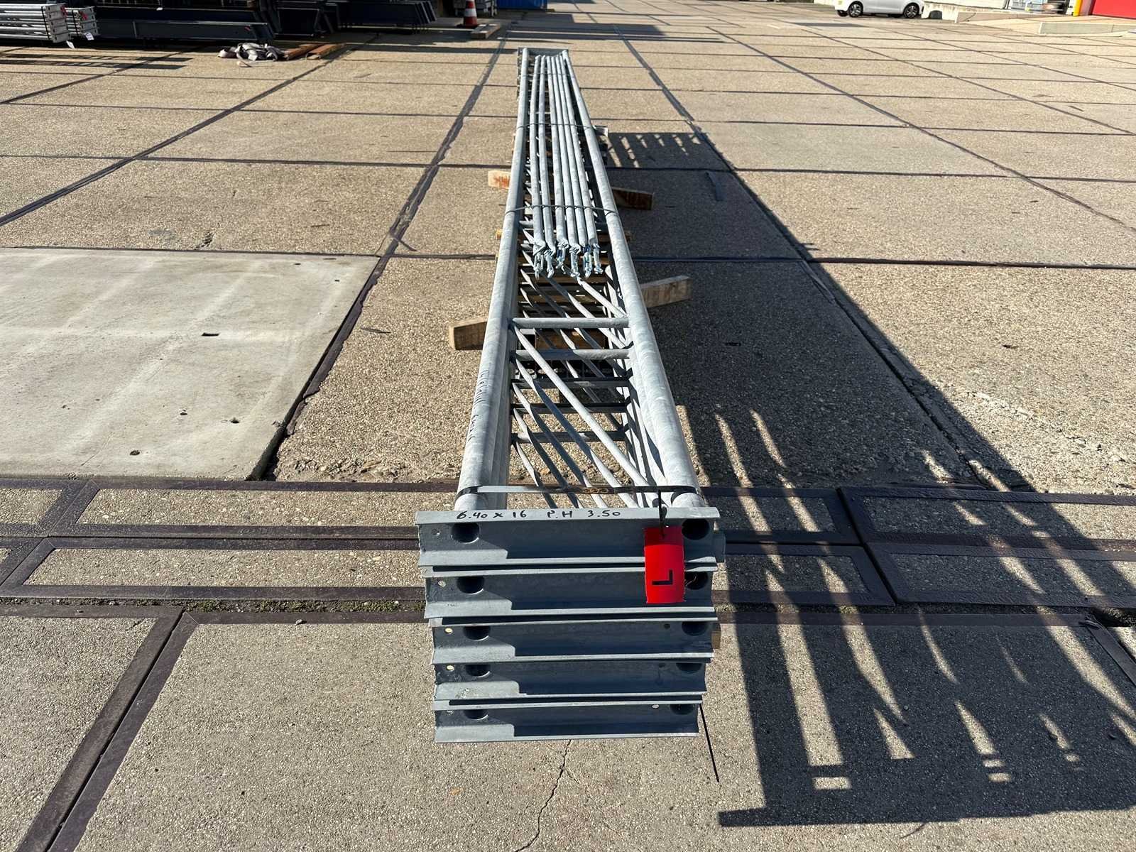 Platdak staalconstructie; vrije overspanning; spanten h.o.h. 4000mm; bestaande uit 5 sets tralieliggers met kokers als staanders; voorzien van windverbanden en kruisschoren; staalconstructie ligt netjes transportklaar en dient met 1 trailer opgehaald te worden; kavels wordt gratis met een heftruck geladen No Materiaal: Gegalvaniseerd staal Type: Platdak Totaal oppervlakte: 102m² Nok hoogte: 3500mm Goot hoogte: 3500mm Totale afmeting L: 16000mm Totale afmeting Breedte: 6400mm
