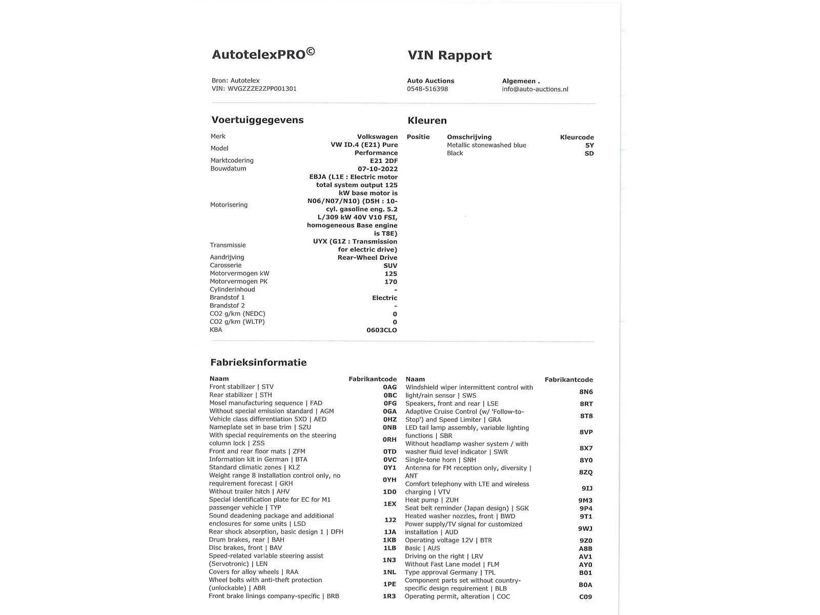 Duitse kenteken papieren. Indien gewenst kunnen wij het gehele import proces voor u verzorgen, RDW invoer, BPM taxatie, Douane afwikkeling, stalling etc. Voor deze auto zijn de totale invoerkosten inclusief de BPM €1.195.- Dus voor €1.195.- boven op uw aankoopprijs verzorgen wij het NL kenteken voor u. (This option is only for Dutch buyers) Voor vragen kunt u mailen naar info@auto-auctions.nl Nee Kenteken: Duitse Kenteken Papieren Merk: Volkswagen Model: ID.4 Type: Pure 52 kWh Afgelezen kilometerstand: 61419km Vermogen (kW): 125kW Brandstof: Elektrisch Chassisnummer: WVGZZZE2ZPP001301 Datum eerste toelating: 24-10-2022 Vermogen (pk): 170hp Aantal zitplaatsen: 5 Kleur: Stonewashed Blue Metallic Transmissie: Automaat Aantal deuren: 5 Aantal sleutels: 2 Velgmaat: 19 Carrosserie: SUV Nationaliteit documenten: Duitse Kenteken Papieren Onderhoudshistorie: Digitaal Volledig Aanwezig Start en rijdt: Ja oplaadkabel : Aanwezig