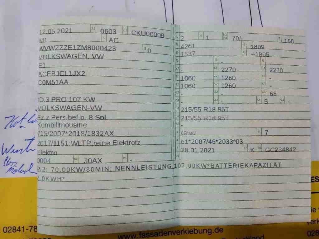 Duitse kenteken papieren. Indien gewenst kunnen wij het gehele import proces voor u verzorgen, RDW invoer, BPM taxatie, Douane afwikkeling, stalling etc. Voor deze auto zijn de totale invoerkosten inclusief de BPM €1.195.- Dus voor €1.195.- boven op uw aankoopprijs verzorgen wij het NL kenteken voor u. (This option is only for Dutch buyers) Voor vragen kunt u mailen naar info@auto-auctions.nl Nee Kenteken: Duitse Kenteken Papieren Merk: Volkswagen Model: ID.3 Type: Pro 58 kWh Afgelezen kilometerstand: 80214km Vermogen (kW): 107kW Brandstof: Elektrisch Chassisnummer: WVWZZZE1ZM8000423 Datum eerste toelating: 12-05-2021 Vermogen (pk): 145hp Kleur: Scale Silver Metallic Transmissie: Automaat Aantal sleutels: 1 Carrosserie: Hatchback Nationaliteit documenten: Duitse Kenteken Papieren Onderhoudshistorie: Digitaal Volledig Aanwezig Start en rijdt: Ja oplaadkabel : Aanwezig