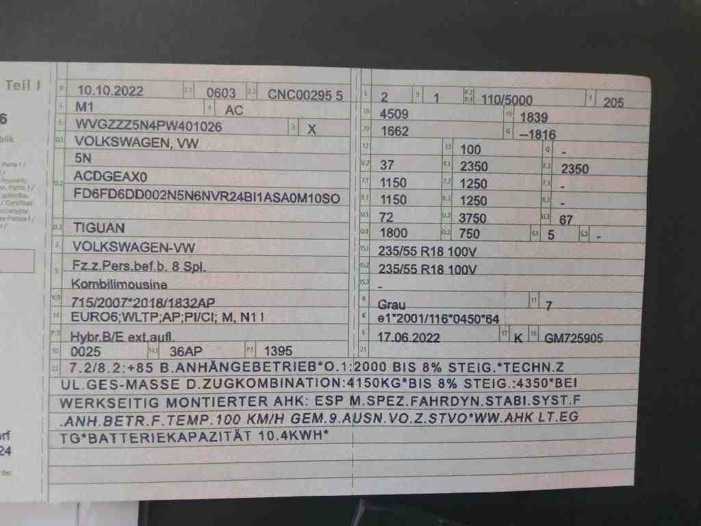 Duitse kenteken papieren. Indien gewenst kunnen wij het gehele import proces voor u verzorgen, RDW invoer, BPM taxatie, Douane afwikkeling, stalling etc. Voor deze auto zijn de totale invoerkosten inclusief de BPM €1.195.- Dus voor €1.195.- boven op uw aankoopprijs verzorgen wij het NL kenteken voor u. (This option is only for Dutch buyers) Voor vragen kunt u mailen naar info@auto-auctions.nl Nee Kenteken: Duitse Kenteken Papieren Merk: Volkswagen Model: Tiguan Type: 1.4 TSI eHybrid Afgelezen kilometerstand: 143233km Cilinderinhoud: 1395cc Vermogen (kW): 180kW Brandstof: Hybride Benzine Chassisnummer: WVGZZZ5N4PW401026 Datum eerste toelating: 10-10-2022 Vermogen (pk): 245hp Aantal zitplaatsen: 5 Kleur: Dolphin Grey Metallic Transmissie: Automaat Aantal deuren: 5 Aantal sleutels: 2 Velgmaat: 18 Aantal cilinders: 4 Carrosserie: SUV Nationaliteit documenten: Duitse Kenteken Papieren Onderhoudshistorie: Digitaal Volledig Aanwezig Start en rijdt: Ja oplaadkabel : Aanwezig