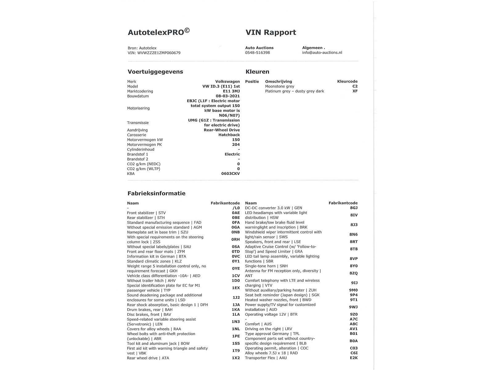 Duitse kenteken papieren. Indien gewenst kunnen wij het gehele import proces voor u verzorgen, RDW invoer, BPM taxatie, Douane afwikkeling, stalling etc. Voor deze auto zijn de totale invoerkosten inclusief de BPM €1.195.- Dus voor €1.195.- boven op uw aankoopprijs verzorgen wij het NL kenteken voor u. (This option is only for Dutch buyers) Voor vragen kunt u mailen naar info@auto-auctions.nl Nee Kenteken: Duitse Kenteken Papieren Merk: Volkswagen Model: ID.3 Type: Pro 58 Kwh Afgelezen kilometerstand: 91676km Vermogen (kW): 150kW Brandstof: Elektrisch Chassisnummer: WVWZZZE1ZMP060679 Datum eerste toelating: 26-4-2021 Vermogen (pk): 204hp Aantal zitplaatsen: 5 Kleur: Moonstone Gray Transmissie: Automaat Aantal deuren: 5 Aantal sleutels: 2 Carrosserie: Suv Nationaliteit documenten: Duitse Kenteken Papieren Onderhoudshistorie: Digitaal Volledig Aanwezig Start en rijdt: Ja oplaadkabel : Aanwezig