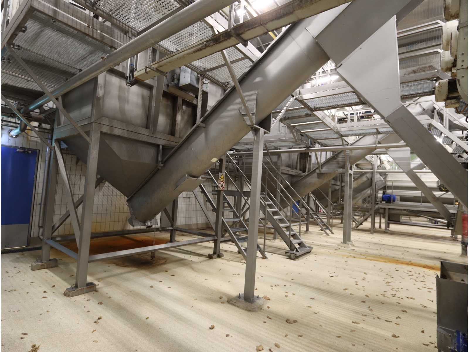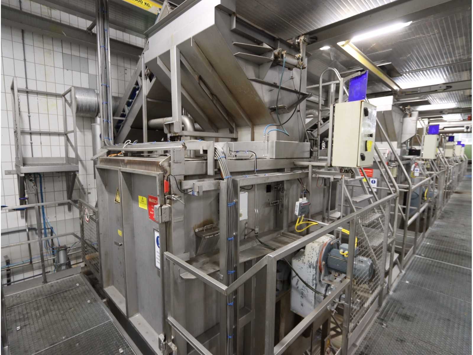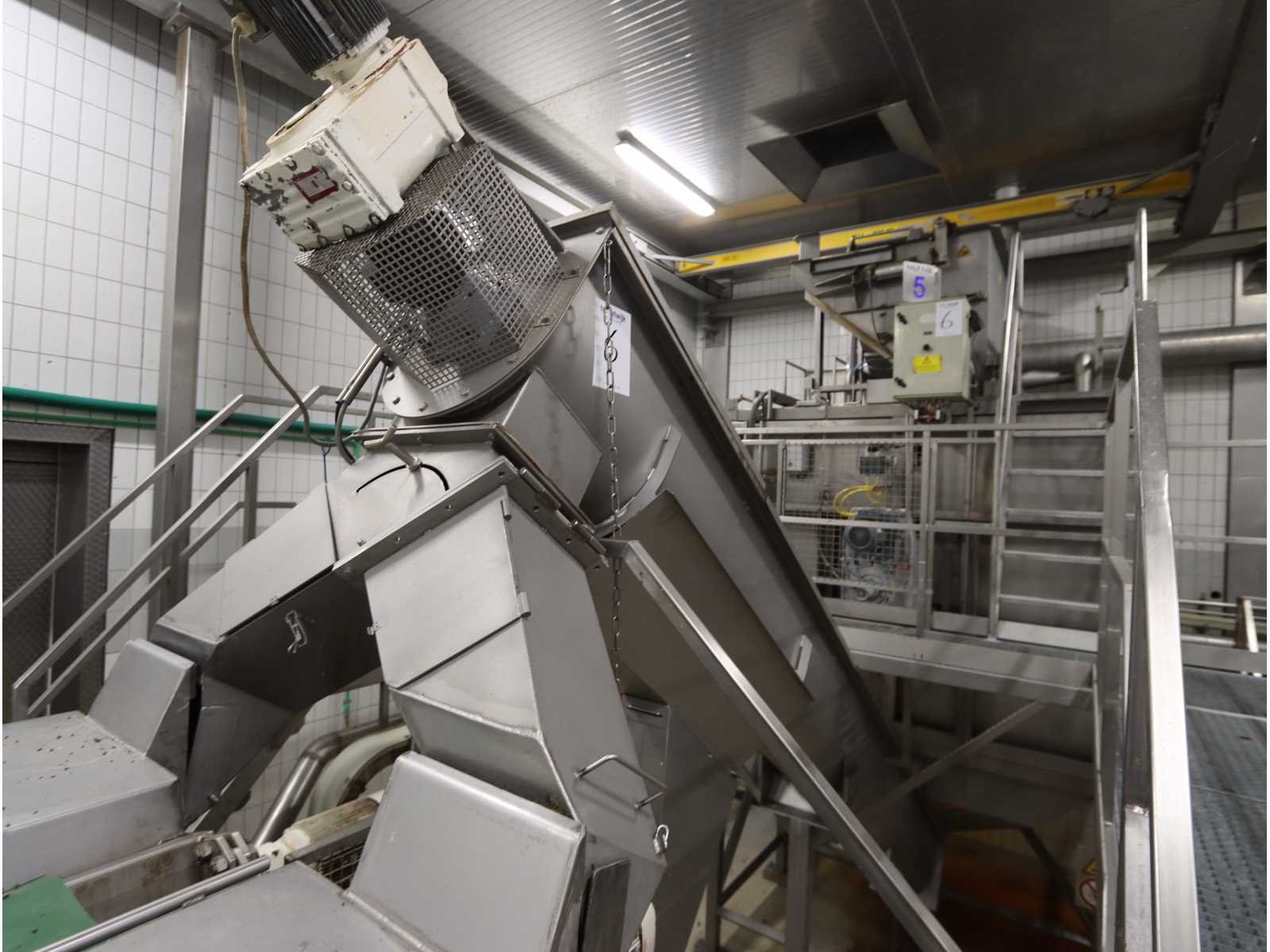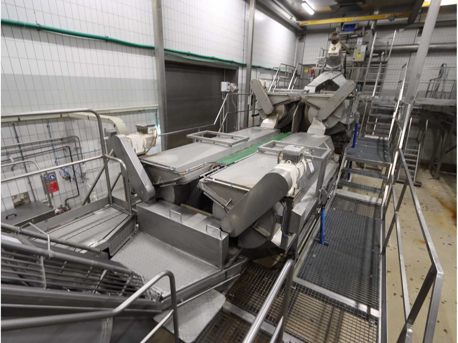 Bestaande uit: “Kiremko” stoomschiller voorzien van invoerbunker (afmeting circa 2400x3000x6000 mm), en onderlopende opvoer schroeftransporteur (lengte circa 6000 mm), “Agrico” 2-voudige ontveller en 2-voudige borstelmachine type AT-OBC-2500, werklengte 2500 mm, beide voorzien van schroeftransporteur, uitvoer schroeftransporteur (lengte 2500 mm) en opvang/filter bak met pomp (afmeting circa 1550x1070x1160 mm)(bordessen niet inbegrepen) Nee