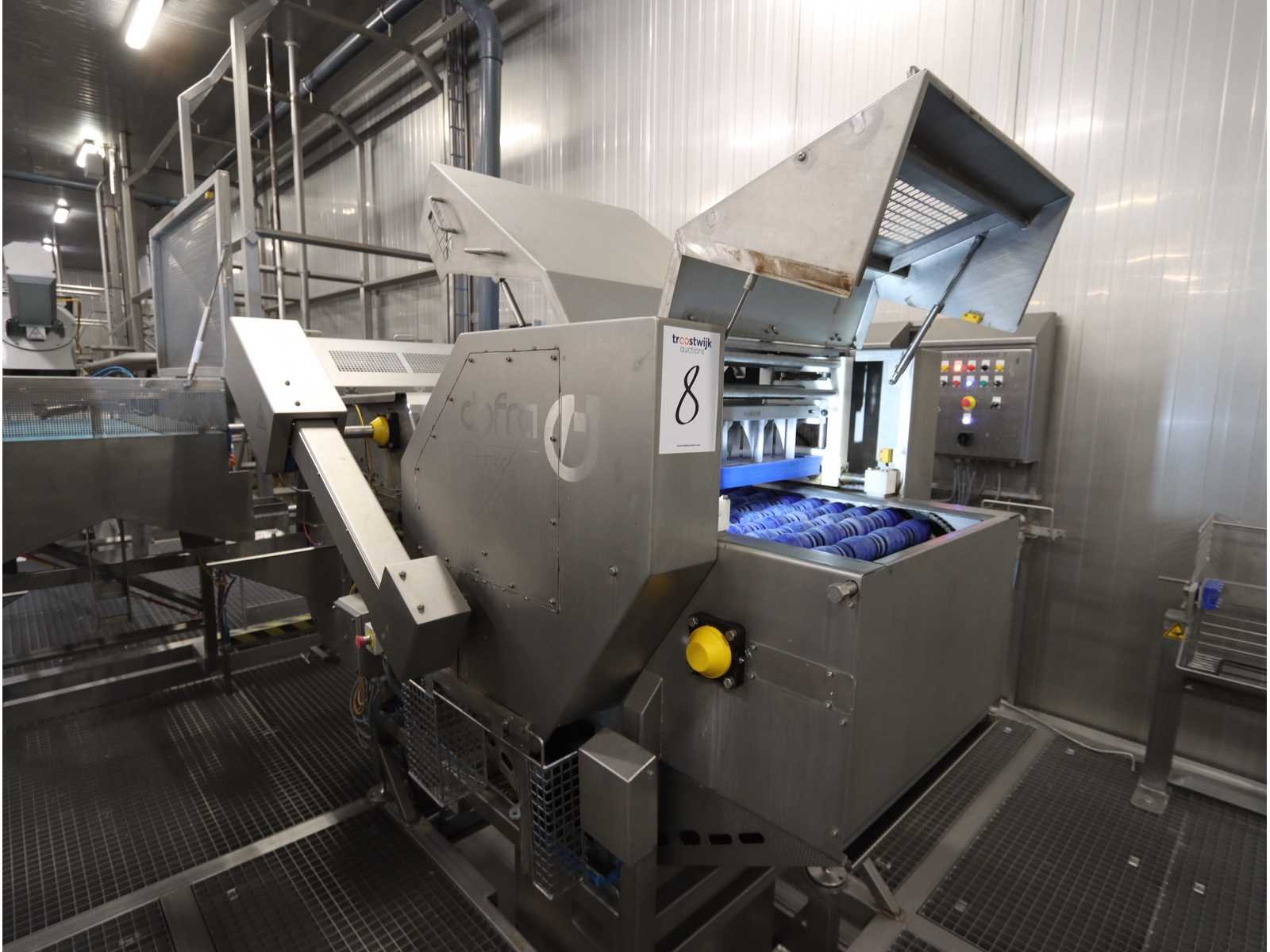 Werkbreedte , doorloop lengte , Voorzien van 3-delige segmenteerset (2-deler langs, 2-deler dwars, 4-deler, 8 deler), besturingskast, met regelbare snelheid, Nee Merk: Dofra Foodtech Type: 20054743 01 Bouwjaar: 2015 Serienummer: 12150350 Aansluiting: 400V Eigen gewicht: 700kg