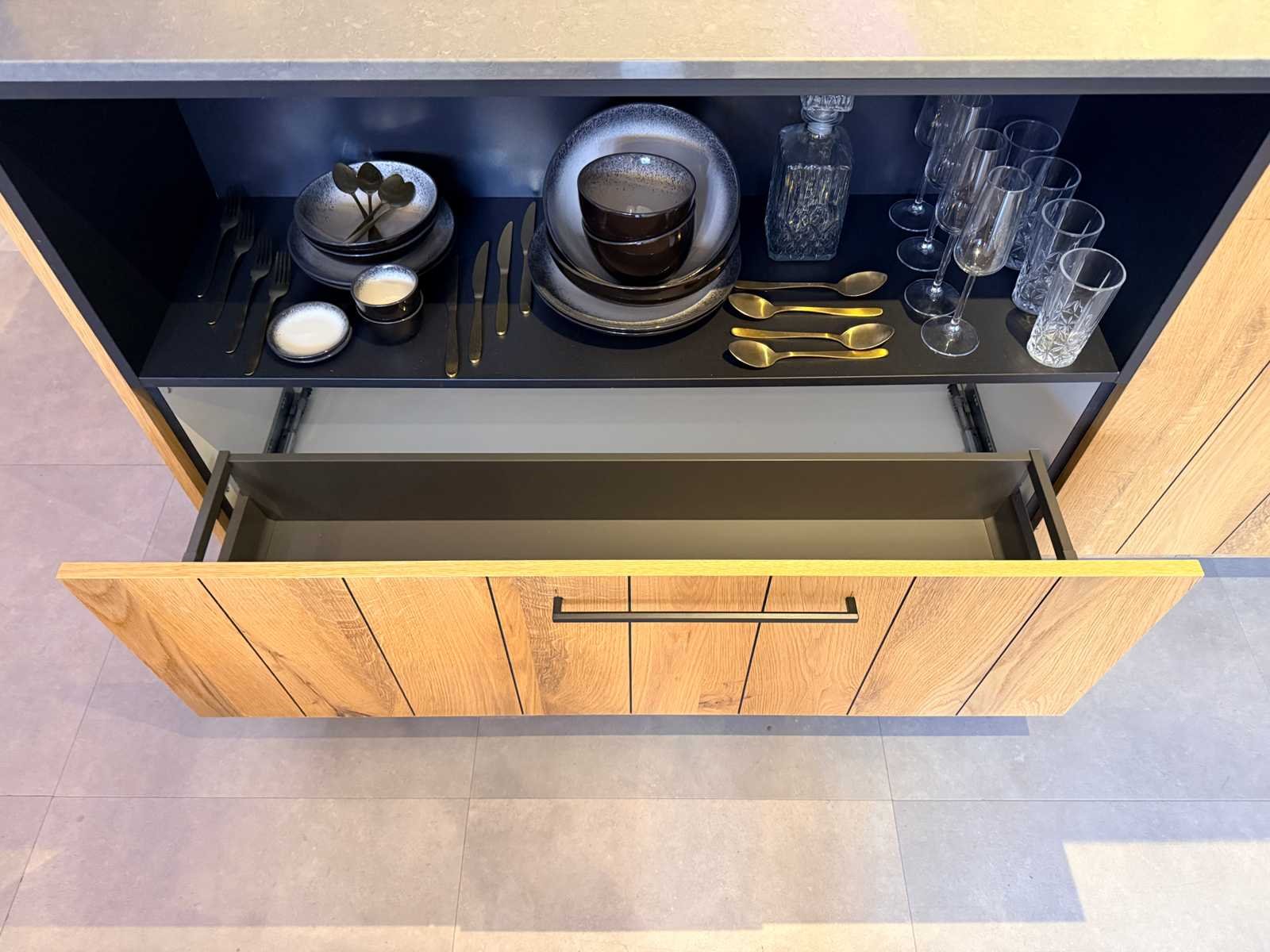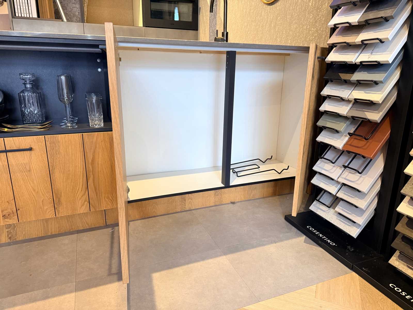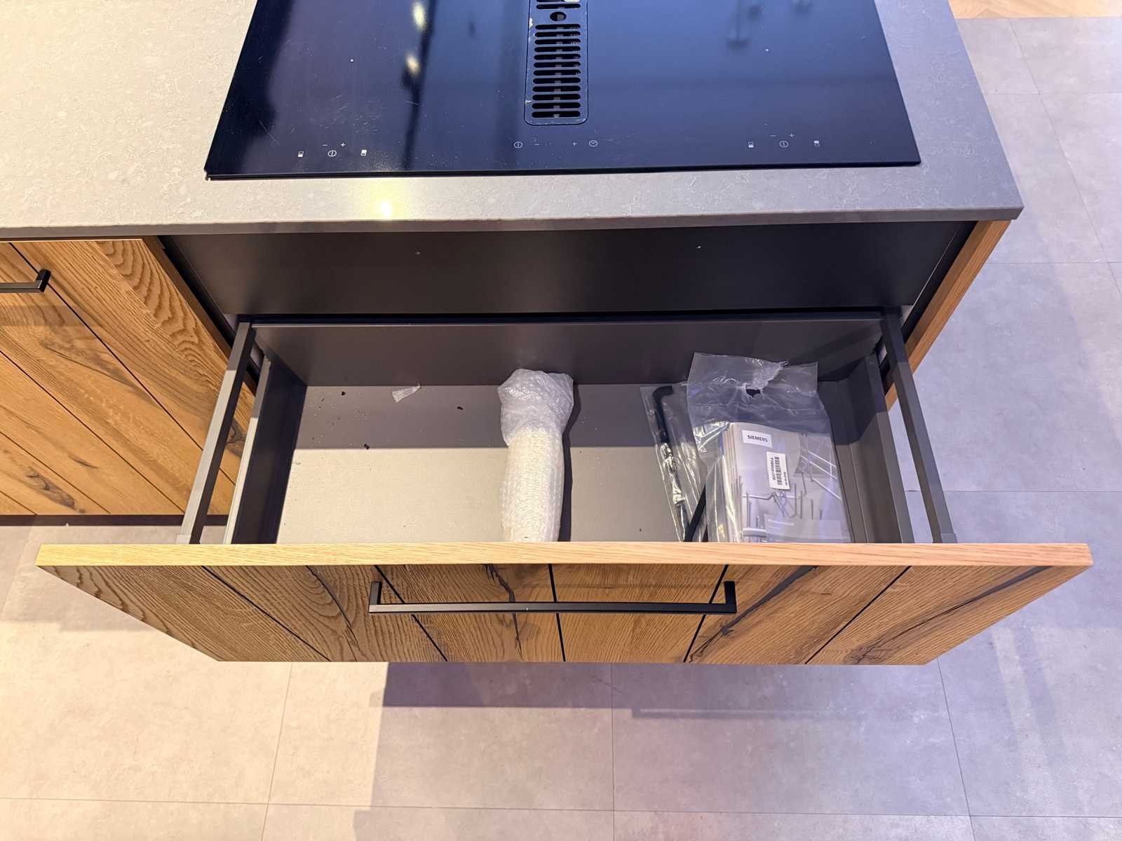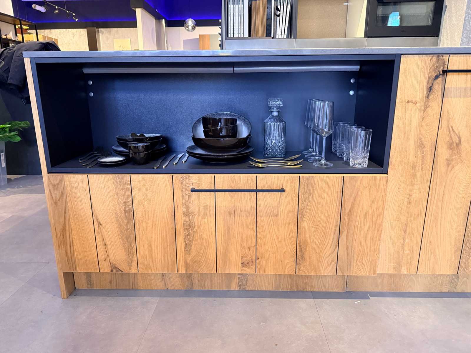 Zonder oven; afmetingen kastenwand circa 185x60x160 cm; reeds gedemonteerd en ingepakt op pallets. (afstapelen, omruilen of statiegeld per pallet); pallets zijn niet inbegrepen; statiegeld betalen bij afhalen, of pallets afstapelen; werkblad niet ingepakt op pallets (26-JAK-03465); zonder inhoud en accessoires Nee Type keukenopstelling: Eiland Kraan: Gun metal Gootsteen: Gun metal Aanrechtblad: Composiet Fornuis: Kuppersbusch Koelkast: Frilec BERLIN102-8RV Softclose: true Vaatwasser: AEG FSB52617Z Lengte kookeiland: 245cm Breedte kookeiland: 100cm Hoogte kookeiland: 90cm Kleur: Eikenfineer hout met belijning