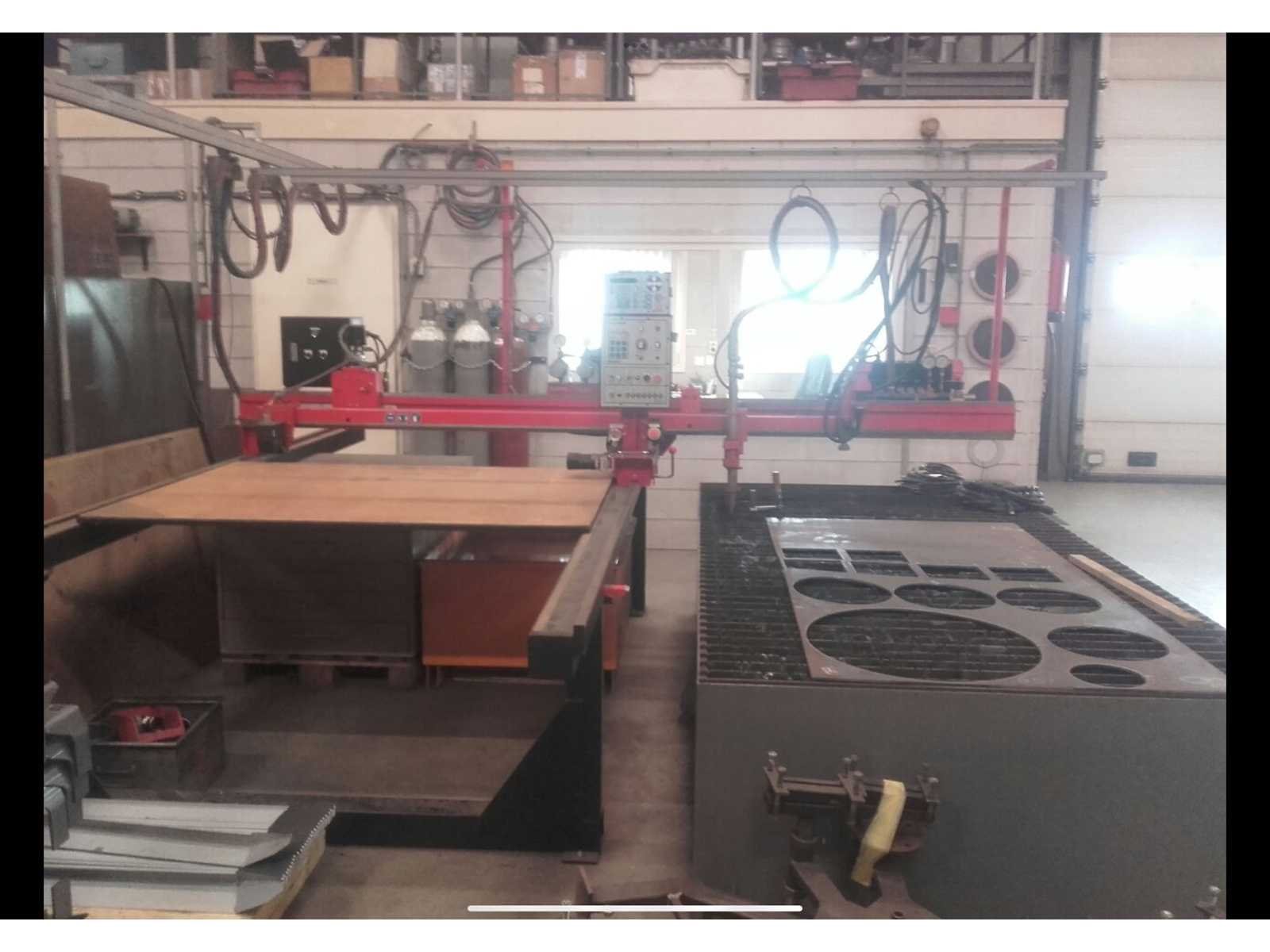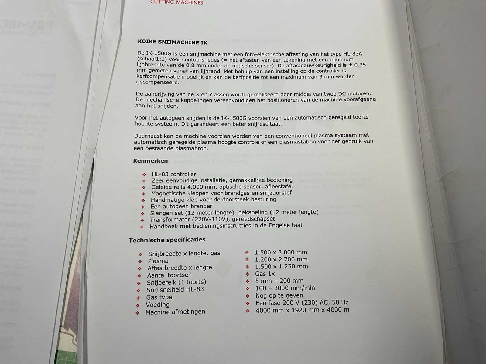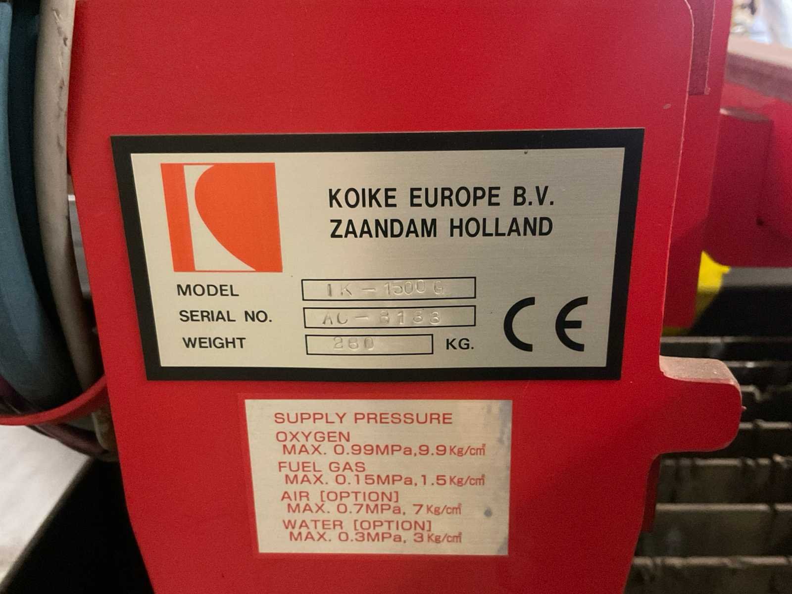 Snijbereik 3000x1500mm, complete installatie, gedemonteerd, voorzien van: CNC besturing (direct inlezen .dxf files), snijtafel, Autogeen brander, plasma brander, Dell computer met Sigmanest Cadcam besturing/software, Burny 2.5 plus bedieningskast, Burny cator 1100CCD, waterreservoir, stalen kast met reserveonderdelen Nee Merk: Koike Type: IK-1500G Serienummer: AC-8133 Tafel afmeting l: 3000mm Tafel afmeting b: 1510mm Afmeting l: 3500mm Afmeting b: 1750mm Afmeting h: 2000mm