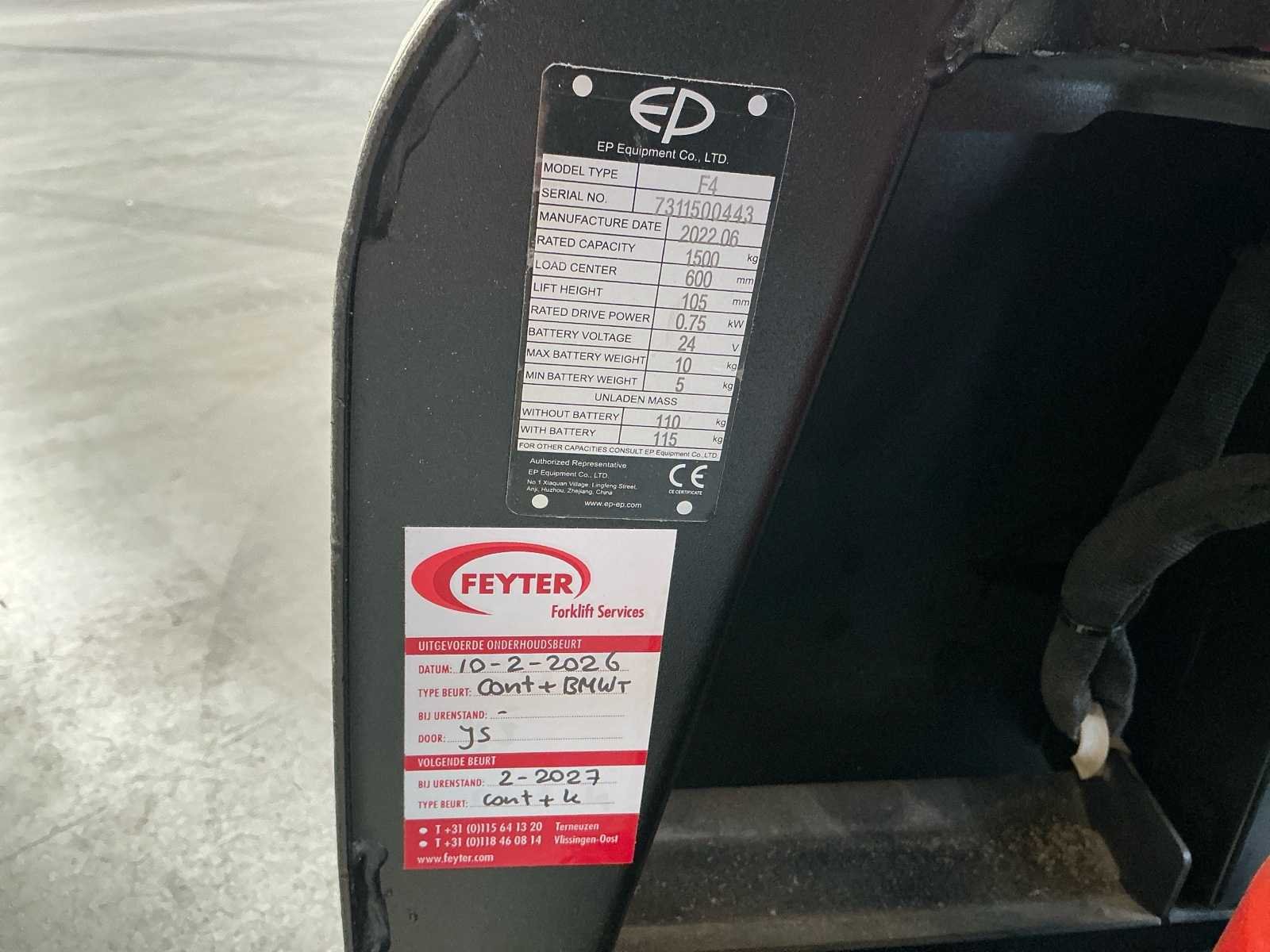 Recent onderhoud gehad (Februari 2026) Nee Merk: EP Type: F4 Bouwjaar: 2022 Serienummer: 7311500443 Hefvermogen: 1500kg Accu lader: true
