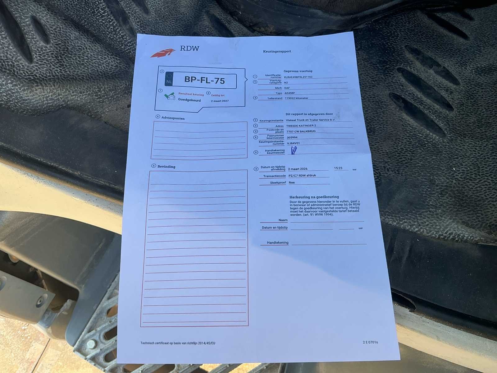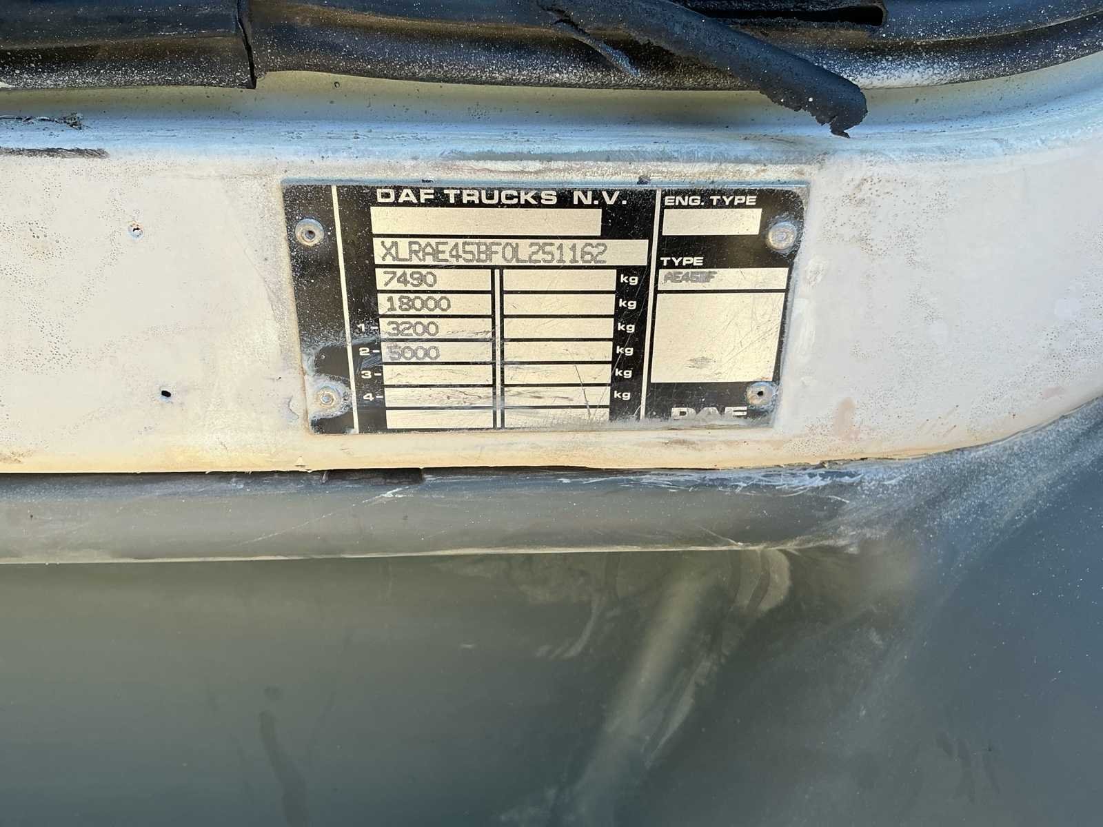 Voorzien van; Oprijklep; Elektrische Stoelen; Automaat; APK; MAX MASSA 7490; 3500 kg trekgewicht Bak; 230cm breedte ; 450CM L (LET OP! dit voertuig heeft een kenteken registratie, bij afhalen dient u dit ter plaatste bij een derde partij te naam te stellen of te exporteren, hier zijn extra kosten aan verbonden) Nee Kenteken: BP-FL-75 Merk: Daf Type: AE45BF Bouwjaar: 2004 Chassisnummer VIN: XLRAE45BFOL251162 Kilometerstand bij opname: 119060km APK vervaldatum: 2027-03-02 Datum eerste toelating: 2004-02-11 Datum eerste toelating (NL): 2004-02-11 Aantal assen: 2 Fuel Type: Diesel Laadvermogen: 2030kg Aantal sleutels: 1 Emissieklasse: 3 Totale afmeting L: 6200mm Startinformatie: Start en rijdt Nationaliteit documenten: Nederland Kentekenpapieren compleet?: true Aantal zitplaatsen: 2 Automaat: true