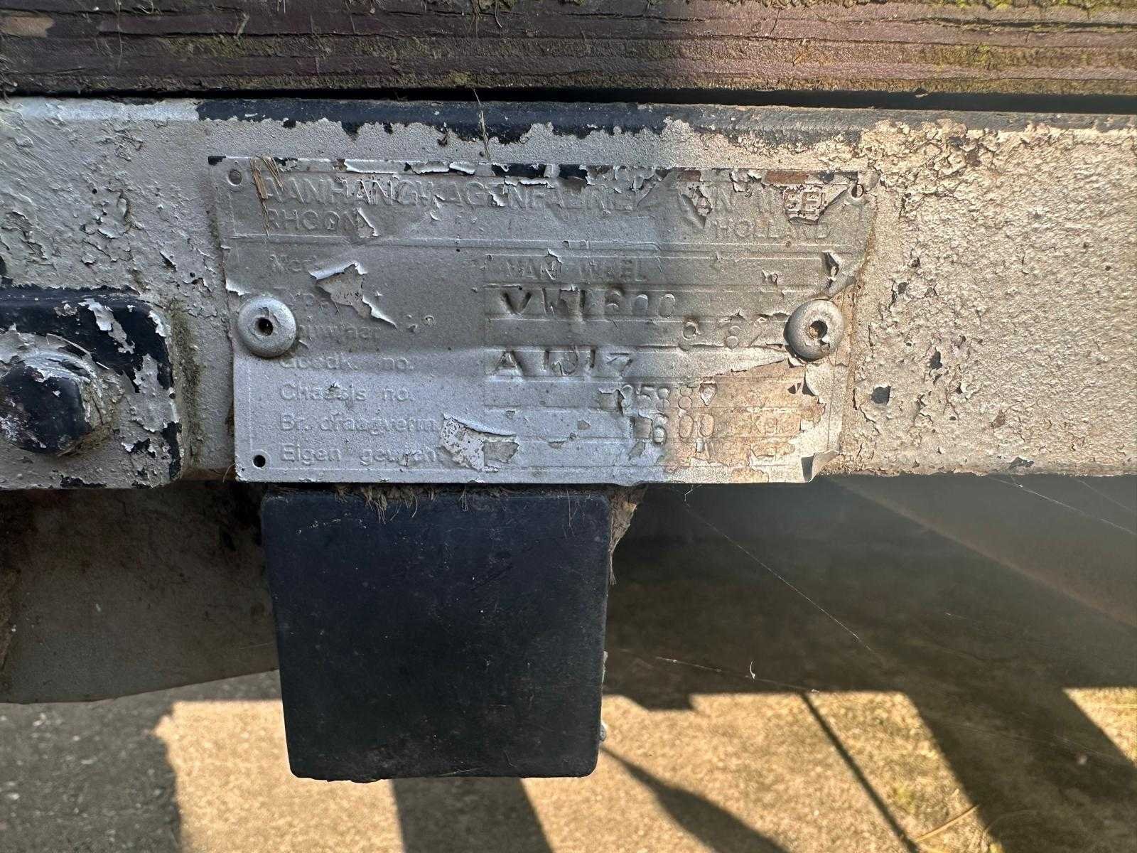 Voorzien van: Trekhaakkoppeling, handrem, neuswiel, verlichting Nee Merk: van weel Model: VW 1600 Bouwjaar: 1982 Aantal assen: 2 Laadbak afmeting l: 150cm Laadbak afmeting b: 300cm Ledig gewicht: 418kg Datum eerste toelating: 1982-10-11 Kenteken: 1736wv