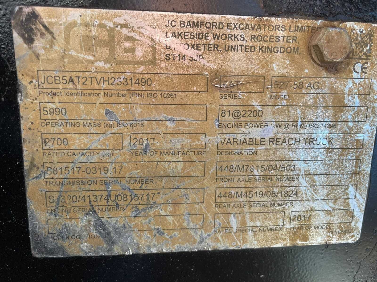 Voorzien van: JCB Diesel Max 81kW, hefvermogen 2700 KG, hefhoogte 5800mm, hoogte 2000mm, breedte 2040mm,40 km/h hydrostatic drive, geveerde stoel, hydraulisch snelwissel JCB compact tool, radio, zwaailamp en werklampen, veegfunctie, handgas, omkeerbare koelventilator, 4WD, 4WS, poultrymaster-pakket, load-indicator, machine is voorzien van demontabele cabine met snelsluiting, hierdoor is machine zeer geschikt voor het werken in lage ruimtes, na demontage is er een doorrij hoogte van 1600mm, trekhaak, 7 polige stekker achterzijde, luchtgeveerde stoel. Nee Merk: JCB Type: 527-58 AG+ Bouwjaar: 2017 Serienummer: 2331490 Kenteken: TLB08K Motorvermogen (kW): 81kW Hefvermogen: 2700kg Hefhoogte: 5800mm Cabine: true Vierwielaandrijving 4x4: true Luchtbanden: true Afgelezen urenstand: 4200 Eigen gewicht: 5990kg
