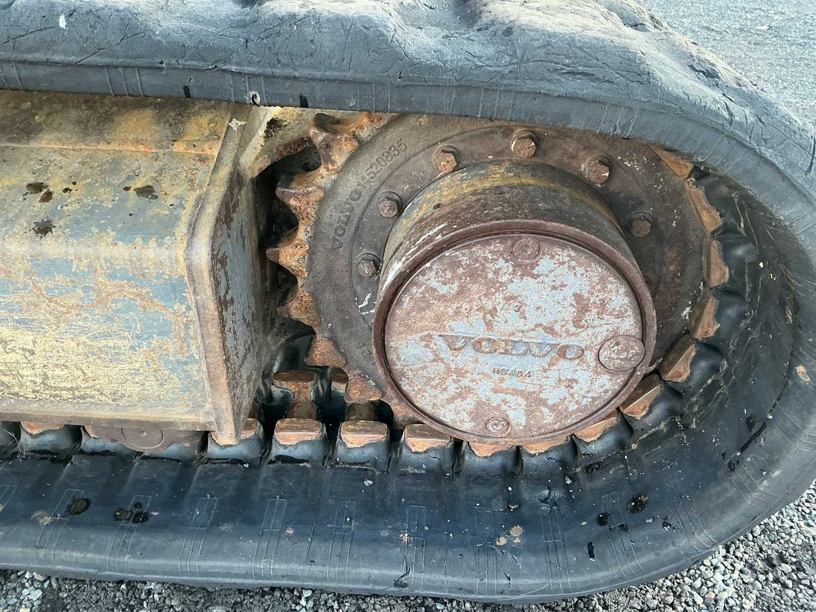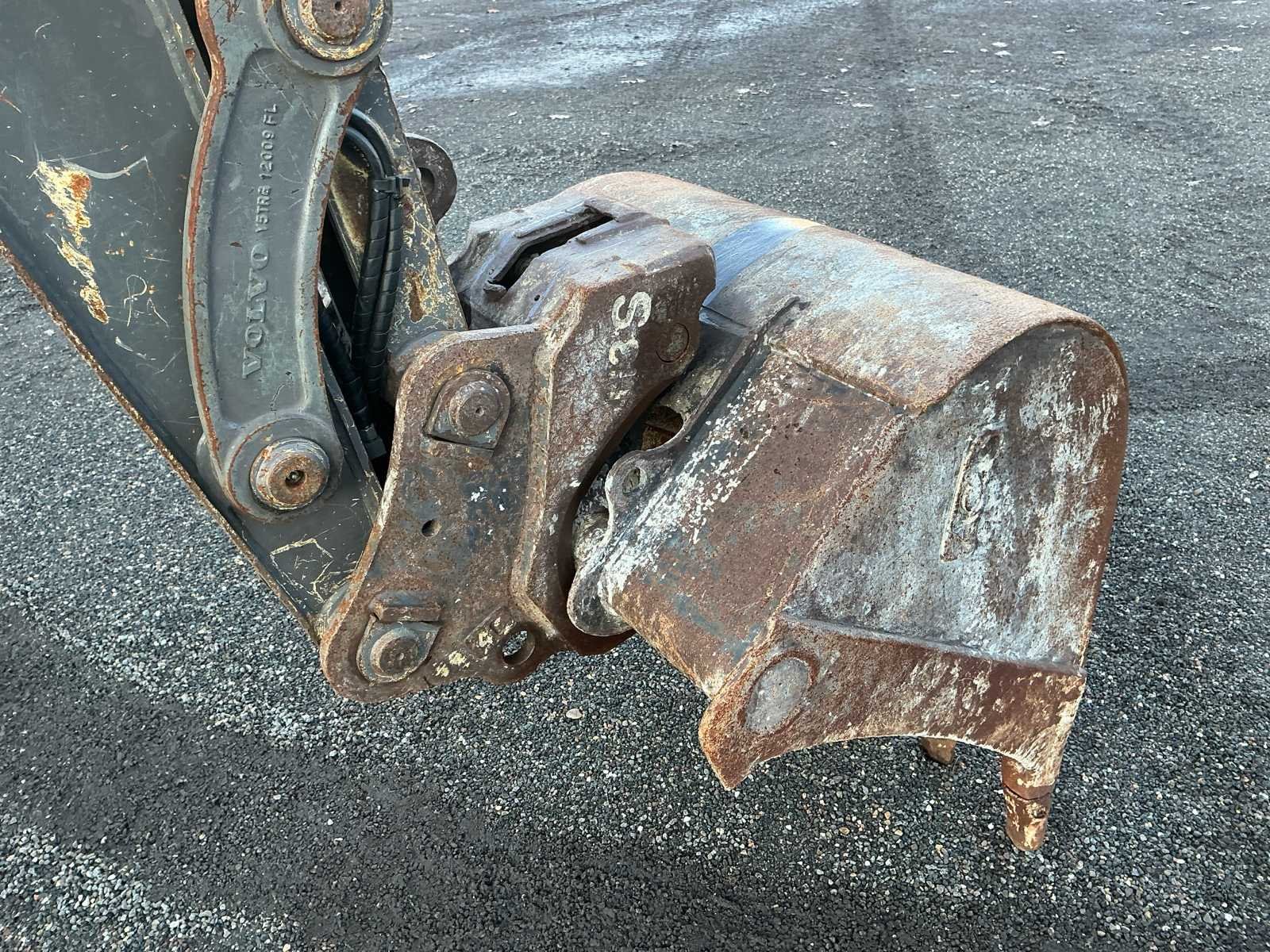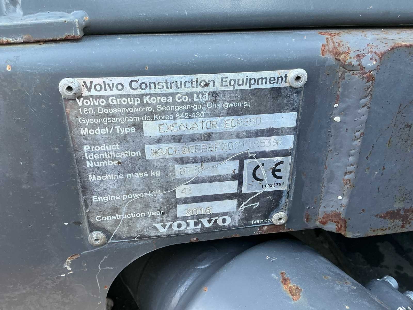 Voorzien van: Volvo D2.6 (43kW), hydraulische snelwissel, graafbak met tanden 850mm, aux. aansluiting langs giek, werklampen, dozerblad, joystick bediening, Grammer mechanisch geveerde stoel, rubber rupsen 450mm, airco, ruitenwissers, schuiframen, bedrijfsgewicht 8.778kg, totale breedte 2,30 m, totale lengte 6,37 m, bakinhoud 0,08 – 0,33 m³, max. rijsnelheid 4,9 km/u, max. graafdiepte tot 4,53 max. graafbereik tot 7,35 m, max. storthoogte tot 5,22 m. No Merk: Volvo Type: ECR88D Bouwjaar: 2016 Serienummer: 211853 Merk motor: Volvo Motorvermogen (kW): 43kW Aantal cilinders: 4 Brandstof: Diesel Bedrijfsgewicht: 8778kg Met graafbak: true Graafbak afm. b: 850mm Cabine: true Afgelezen urenstand: 5402 Eigen gewicht: 8778kg Totale afmeting L: 6400mm Totale afmeting Breedte: 2300mm