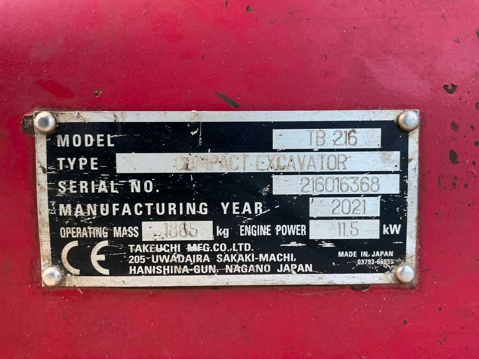 Inclusief sloten bak 1000mm, dieplepel 450mm, banaan bak 220mm, CW05 hydraulische wissel, 3e functie, led werkverlichting, blad 980mm, verstelbaar rijwerk 980/1300mm, 2e rij snelheid, verwarming, radio, Nee Merk: Takeuchi Type: TB 216 Bouwjaar: 2021 Serienummer: 216016368 Merk motor: Yanmar Motorvermogen (kW): 11.5kW Aantal cilinders: 3 Brandstof: Diesel Bedrijfsgewicht: 1865kg Inclusief graafbak: Yes Graafbak afm. b: 1000mm Rups breedte: 230mm Afgelezen urenstand: 2385 Eigen gewicht: 1865kg Totale afmeting L: 3700mm Totale afmeting Breedte: 1300mm Totale afmeting Hoogte: 2400mm