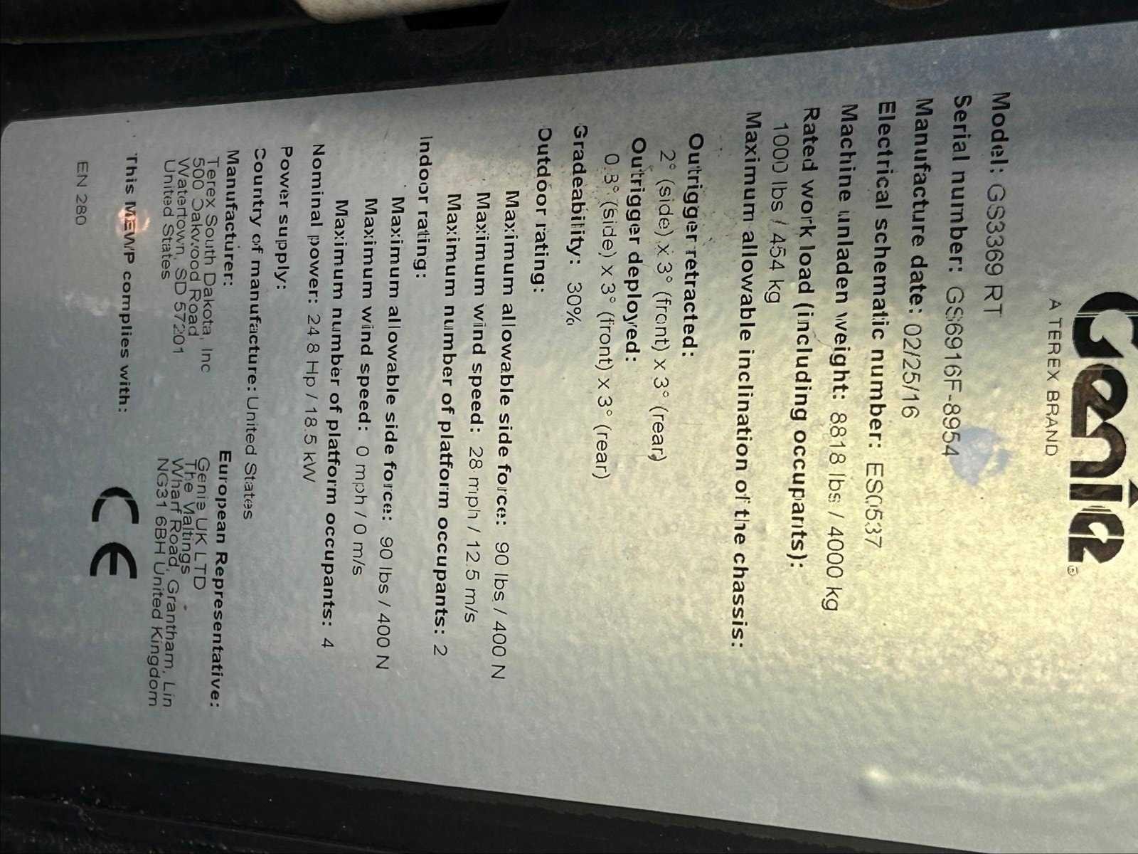 Nee Merk: Genie Type: GS3369 RT Bouwjaar: 2016 Serienummer: GS6916F-8954 Diesel: true Elektrisch: true Motorvermogen (kW): 18kW Schaarhoogwerker: true Werkhoogte: 12500mm Plateau afm. l: 3100mm Plateau afm. b: 1500mm Platform capaciteit: 454kg Afgelezen urenstand: 1390 Eigen gewicht: 4000kg Totale afmeting L: 3600mm Totale afmeting Breedte: 1600mm Totale afmeting Hoogte: 2550mm