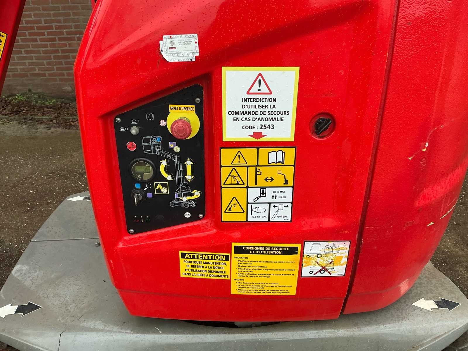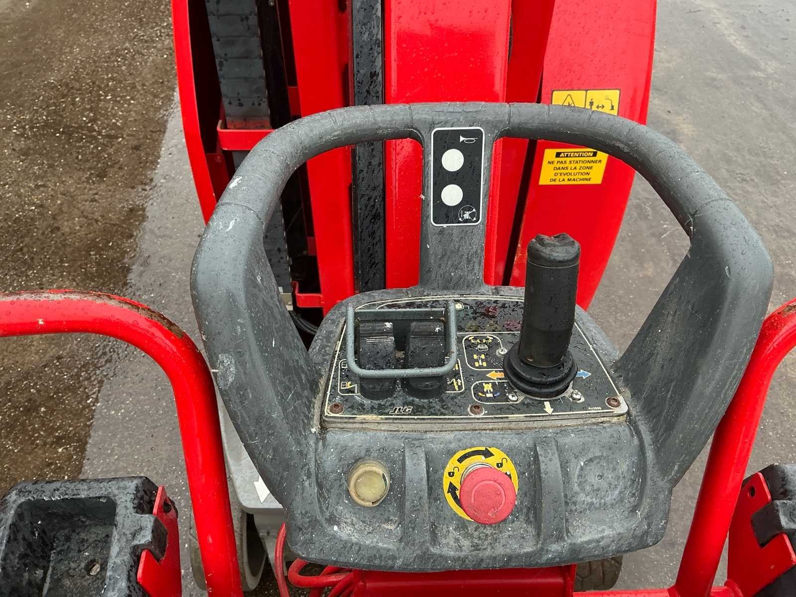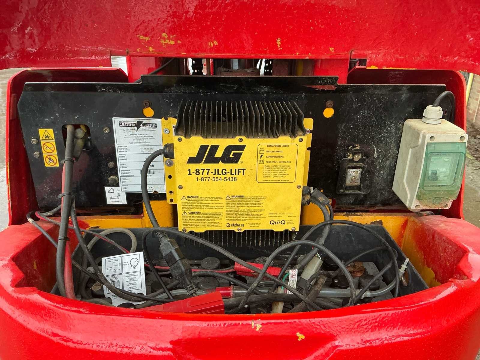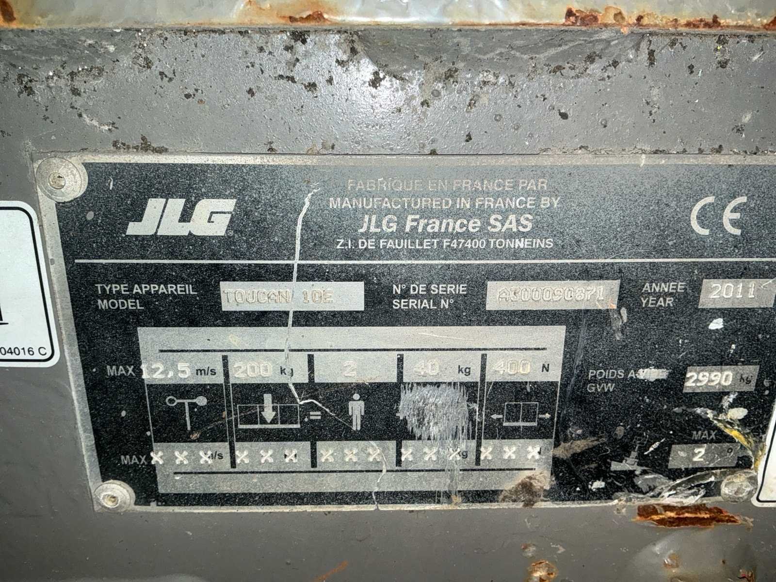 Voorzien van: • stalen platform van 0,90mx0,70 m(L x B), instap via schuifstang aan de achterzijde, proportionele aandrijving en zwenkjoystickbediening met geïntegreerde duimstuurschakelaar, mini-joysticks voor proportionele hef- en daalfuncties van mast en giek, 1,60 m scharnierende giek, lastdetectiesysteem, AC-stroomkabel naar platform, directe elektrische aandrijving op twee wielen, borstelloze AC-aandrijfmotoren, automatische energiebesparing bij inactiviteit, uitschakeling bij lage acculading, zware stalen rolmast met 345º rotatie, kettingspelingdetectiesysteem, alarm en indicatielampje voor kantelen tot 2,5 graden, frame van 0,99 m breed, hijs-/sjorogen • Keuzeschakelaar voor grondbediening met sleutelvergrendeling, batterijontladingsindicator, urenteller, handmatig daalsysteem, banden (massief, non-marking) 406 x 125 mm, werkhoogte 10,10 m, werkbereik 3,38m, overbruggingshoogte 6,51m, zwenkhoek (niet continu) 345°, platformcapaciteit 1200 kg, giek - totale lengte 1,60 m, giek - articulatiebereik 126° (+65°/ -61°), platformafmetingen standaard platform (L x B) 0,70 x 0,90 m, totale breedte 0,99 m, achterzwenkhoek 12 cm, ingeklapte hoogte 1,99m, totale lengte 2,82m. Nee Merk: JLG Type: Toucan 10E Bouwjaar: 2011 Serienummer: A3000090871 Elektrisch: true Masthoogwerker: true Werkhoogte: 10100mm Plateau afm. l: 900mm Plateau afm. b: 700mm Accu lader: true Afgelezen urenstand: 1050 Eigen gewicht: 2990kg Totale afmeting L: 2800mm Totale afmeting Breedte: 1000mm Totale afmeting Hoogte: 2000mm