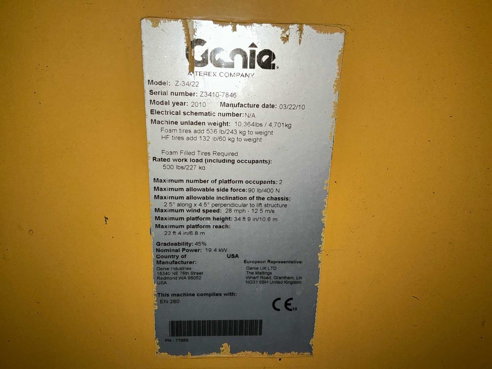 Voorzien van: werkhoogte: 12,52 m, platformhoogte: 10,52 m, horizontaal bereik: 6,78 m, overbruggingshoogte: 4,6 m, platformcapaciteit: 227 kg, breedte: 1,73 m, hoogte (ingeklapt): 2,00m, lengte (ingeklapt): 5,72 m, 4WD, CE-markering. Nee Merk: Genie Type: Z-34/22 Bouwjaar: 2010 Serienummer: Z3410-7846 Diesel: true Motorvermogen (kW): 19kW Knikarm hoogwerker: true Werkhoogte: 12500mm Horizontale rijkwijdte: 6800mm Platform capaciteit: 227kg Afgelezen urenstand: 3366 Eigen gewicht: 4710kg Totale afmeting L: 5700mm Totale afmeting Breedte: 1800mm Totale afmeting Hoogte: 2000mm