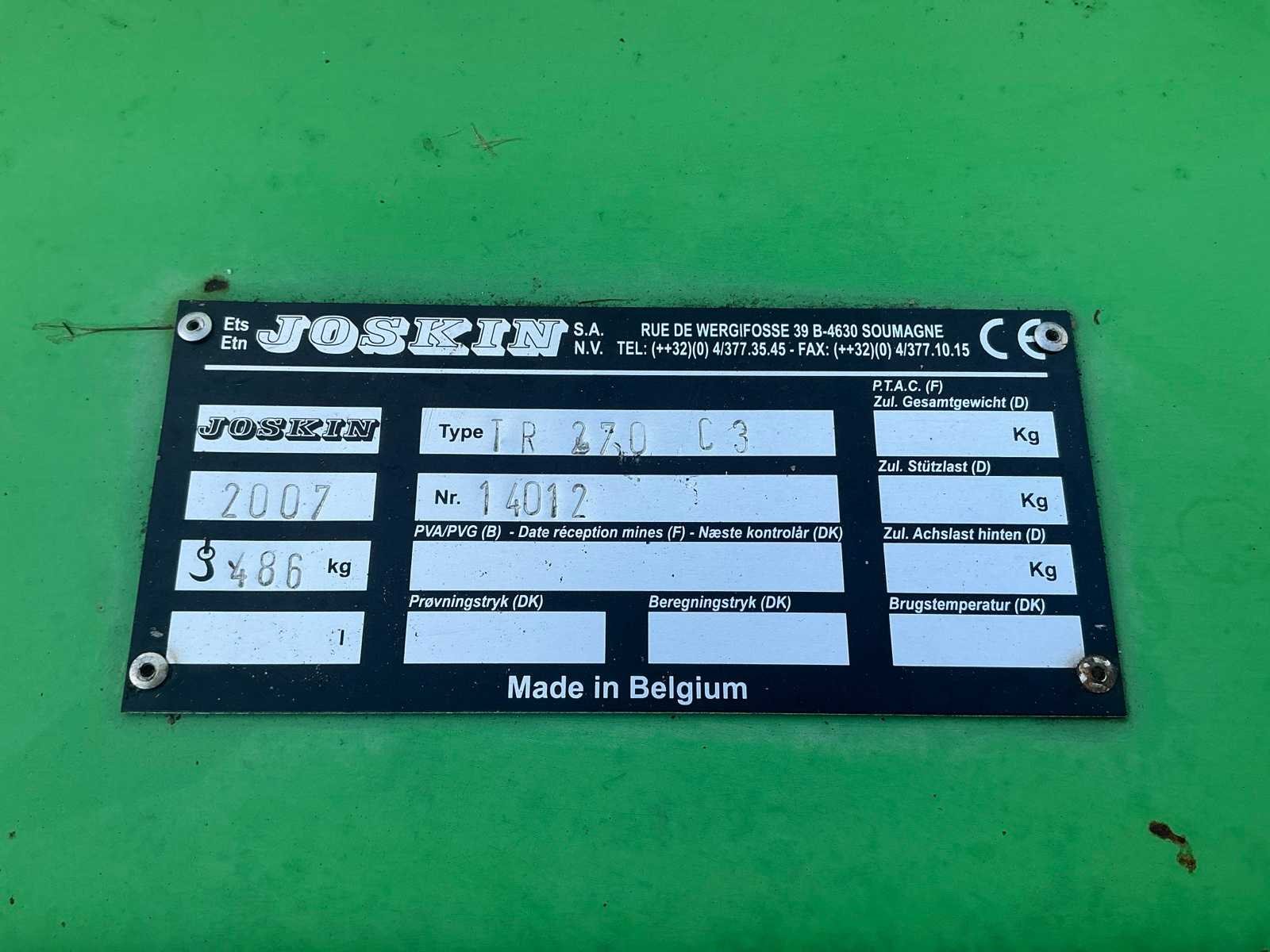 Nee Merk: Joskin Type: TR 270 C3 Bouwjaar: 2007 Serienummer: 14012 Eigen gewicht: 486kg Werkbreedte: 2700mm Totale afmeting L: 3000mm Totale afmeting Breedte: 1400mm Totale afmeting Hoogte: 1000mm