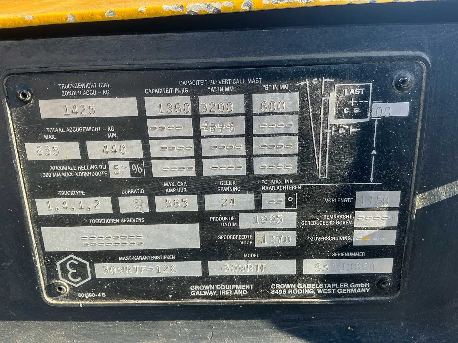 Voorzien van: urenstand niet bekend, claxon, freelift. Nee Merk: Crown Type: 30WRTF Bouwjaar: 1995 Serienummer: 6A133664 Hefvermogen: 1360kg Hefhoogte: 2860mm Lepellengte: 1000mm Eigen gewicht: 1425kg Minimale doorrijhoogte: 2000mm Totale afmeting L: 2200mm Totale afmeting Breedte: 1080mm Totale afmeting Hoogte: 2000mm Accu lader: true