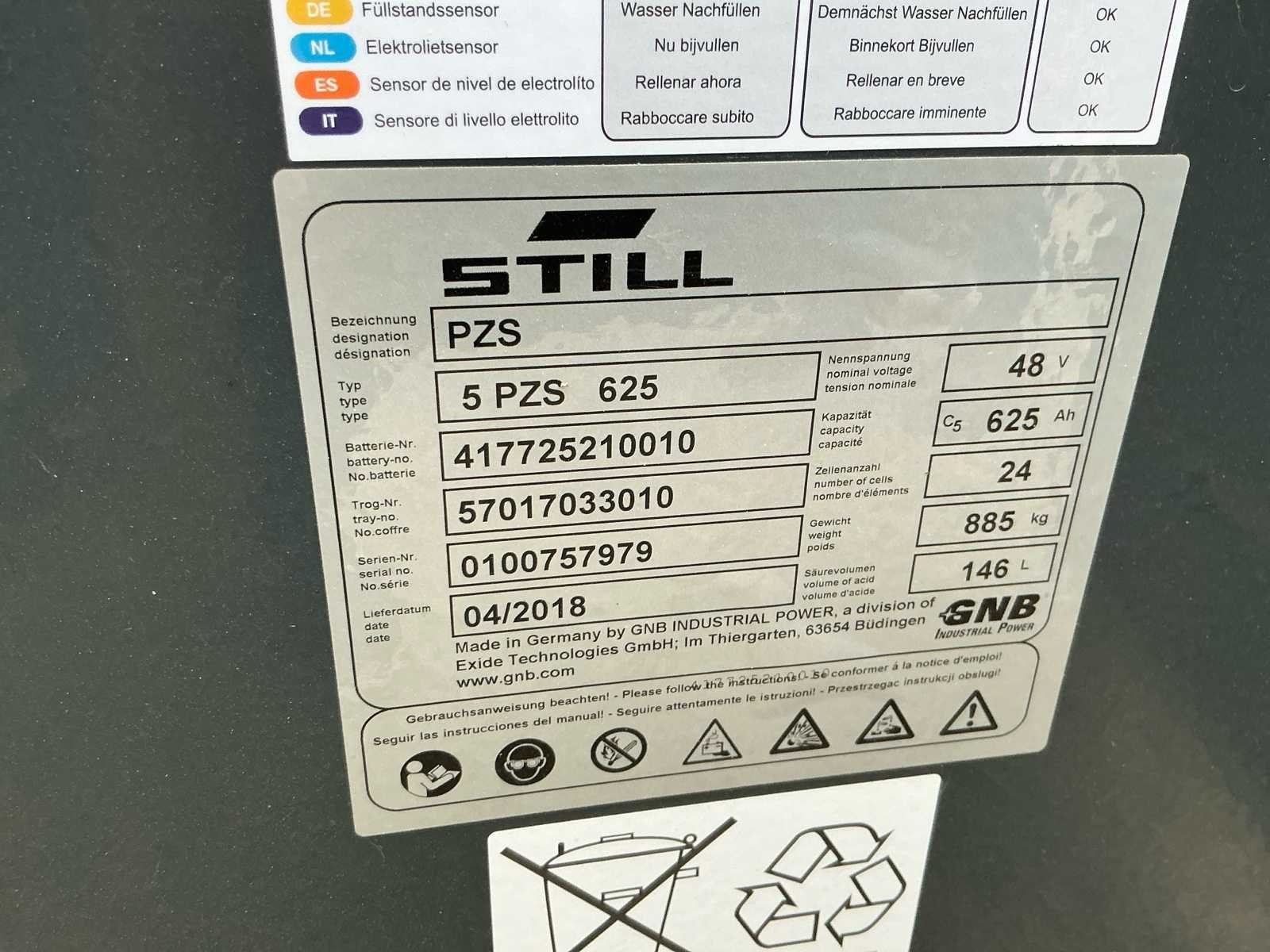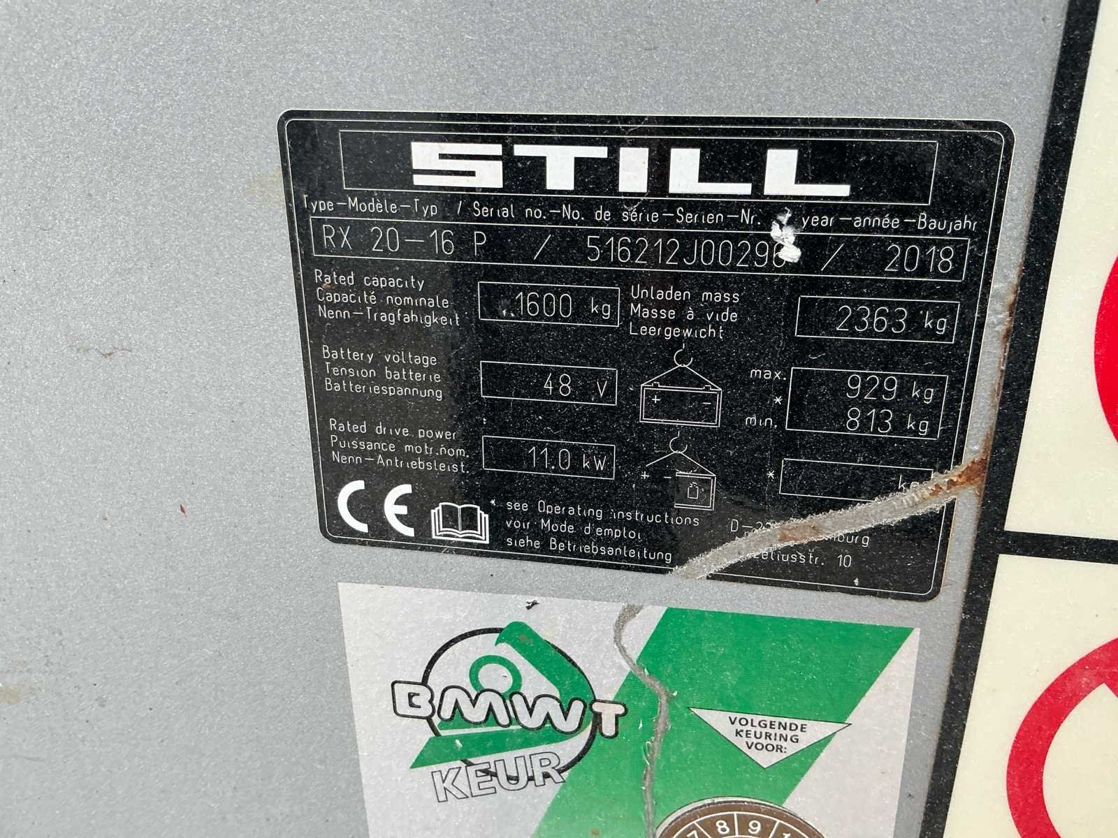 Nee Merk: Still Type: RX 20-16 P Bouwjaar: 2018 Serienummer: 516212J00298 Brandstof: Elektrisch Soort band: Vol rubber Aantal wielen: 4 Afgelezen urenstand: 624 Accu lader: true Free-lift: true Side-shift: true Triple mast: true Eigen gewicht: 2363kg Hefvermogen: 1600kg Lepellengte: 1100mm Hefhoogte: 4350mm Vol rubber banden: true Minimale doorrijhoogte: 2000mm Totale afmeting L: 3100mm Totale afmeting Breedte: 1100mm Totale afmeting Hoogte: 2000mm