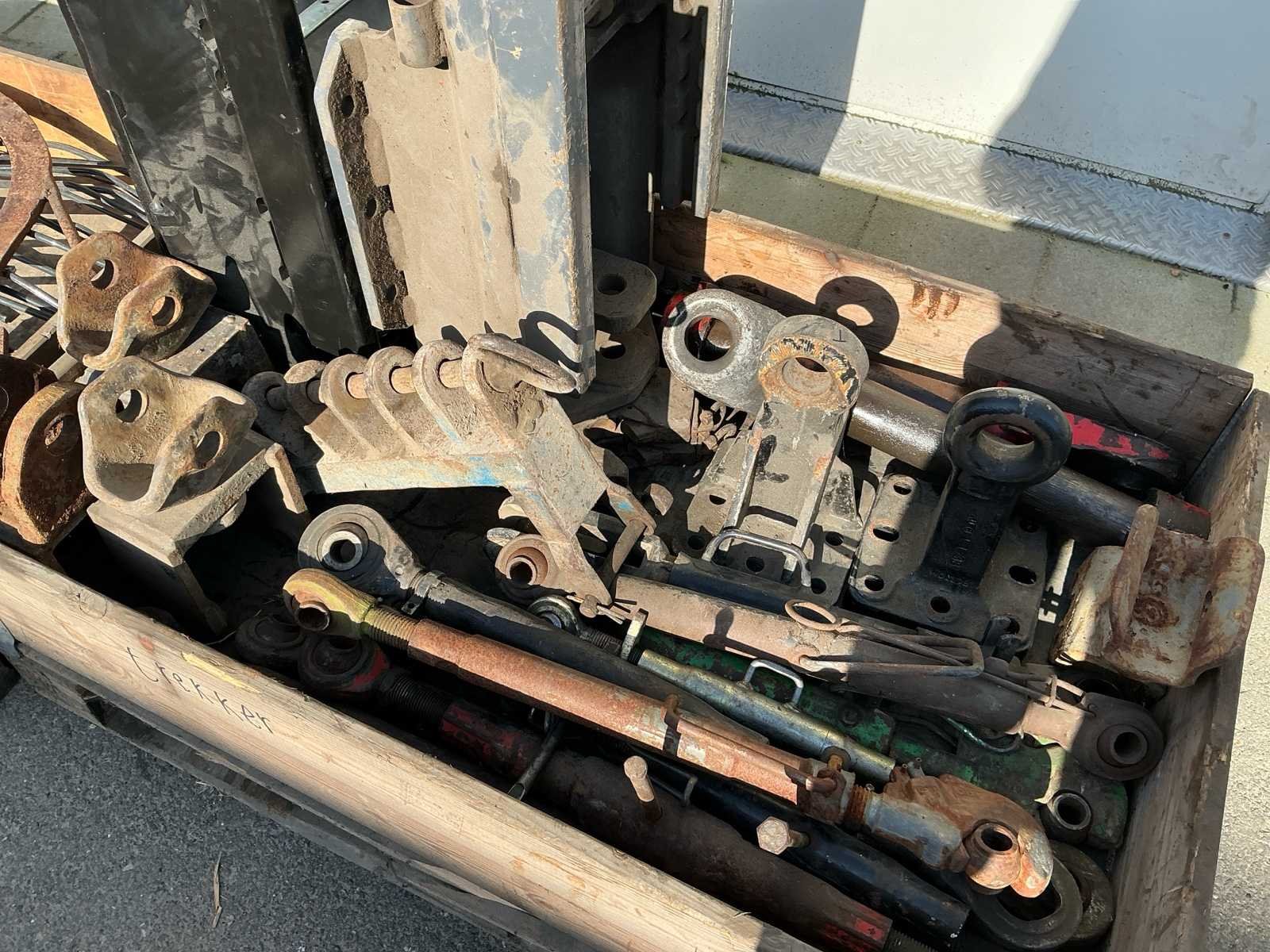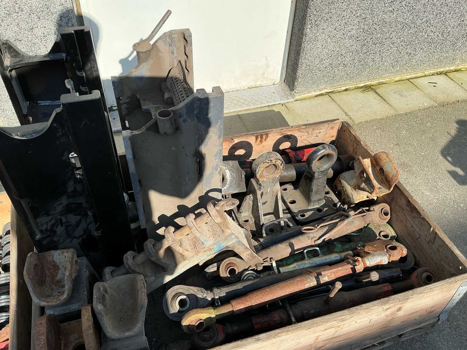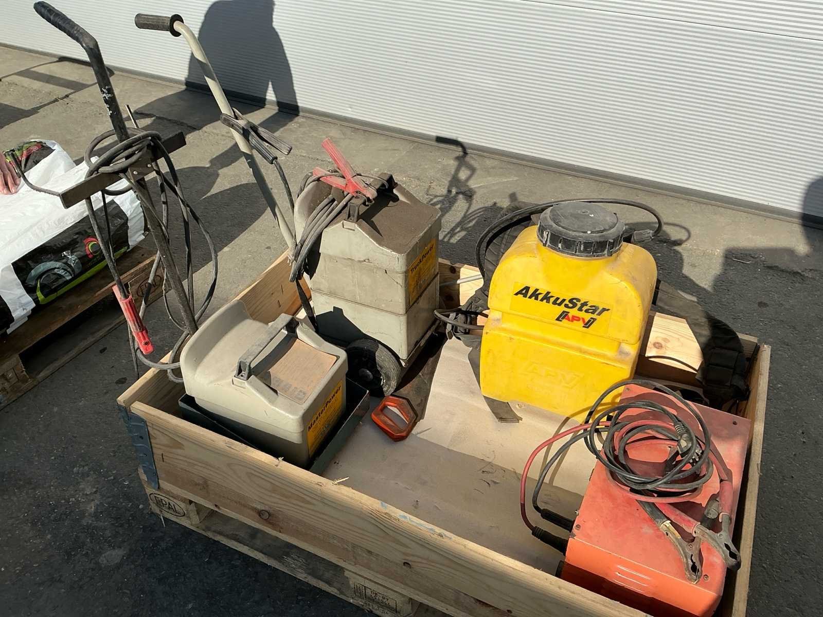 Bestaande uit 4 pallets met onder andere trekstangen, zeil, acculaders, laadbakje, spuit. Nee