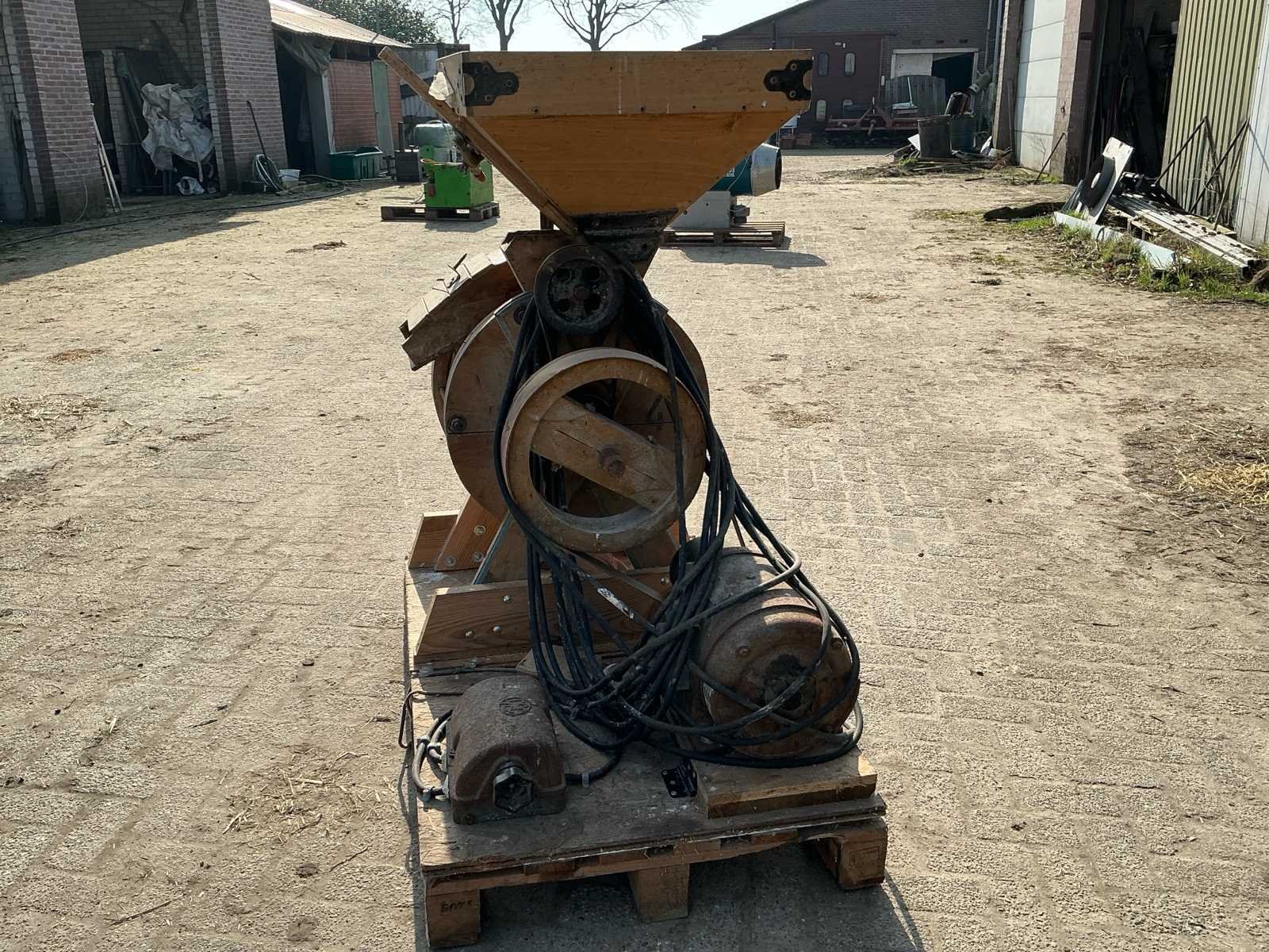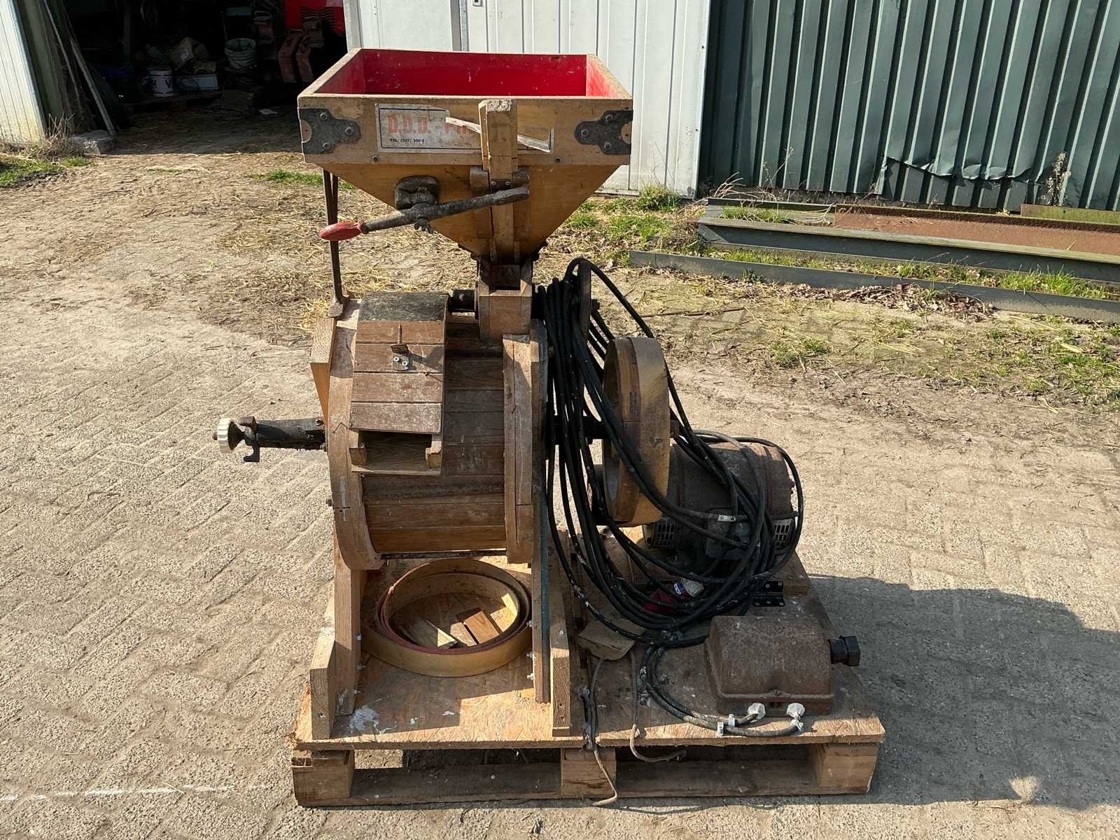 Voorzien van: Moulins de Ferme D.D.D. d’Ypres graanmolen/hamermolen type 4C, serie CB70, met elektrisch aangedreven motor van 3 HP (ca. 2,2 kW), toerental 400 t/min, geschikt voor het malen van graan en veevoeder, vervaardigd door D.D.D. d’Ypres (België/Frankrijk/Duitsland). No Merk: Moulins de Ferme D.D.D. d’Ypres Model: GIB70 Product type: 4 G Kleur: Hout Lengte: 122cm Breedte: 80cm Hoogte: 140cm Materiaal: Hout