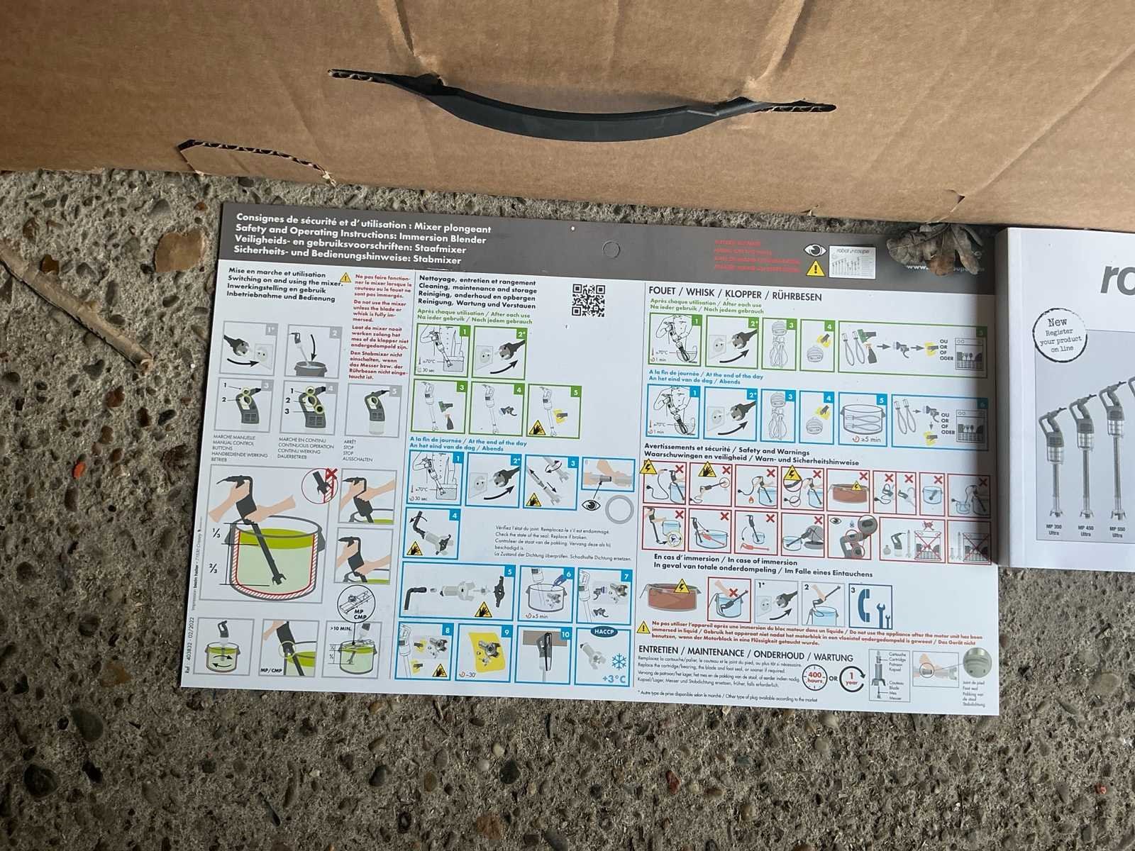 Vermogen: 1000 Watt Voltage: 220–240V Frequentie: 50–60 Hz Toerental: 9.500 RPM Lengte mixervoet: ± 800 mm Made in France Conditie: Nieuw in doos Inclusief handleidingen Nee Merk: Robot Coupe Model: MP 800 Turbo