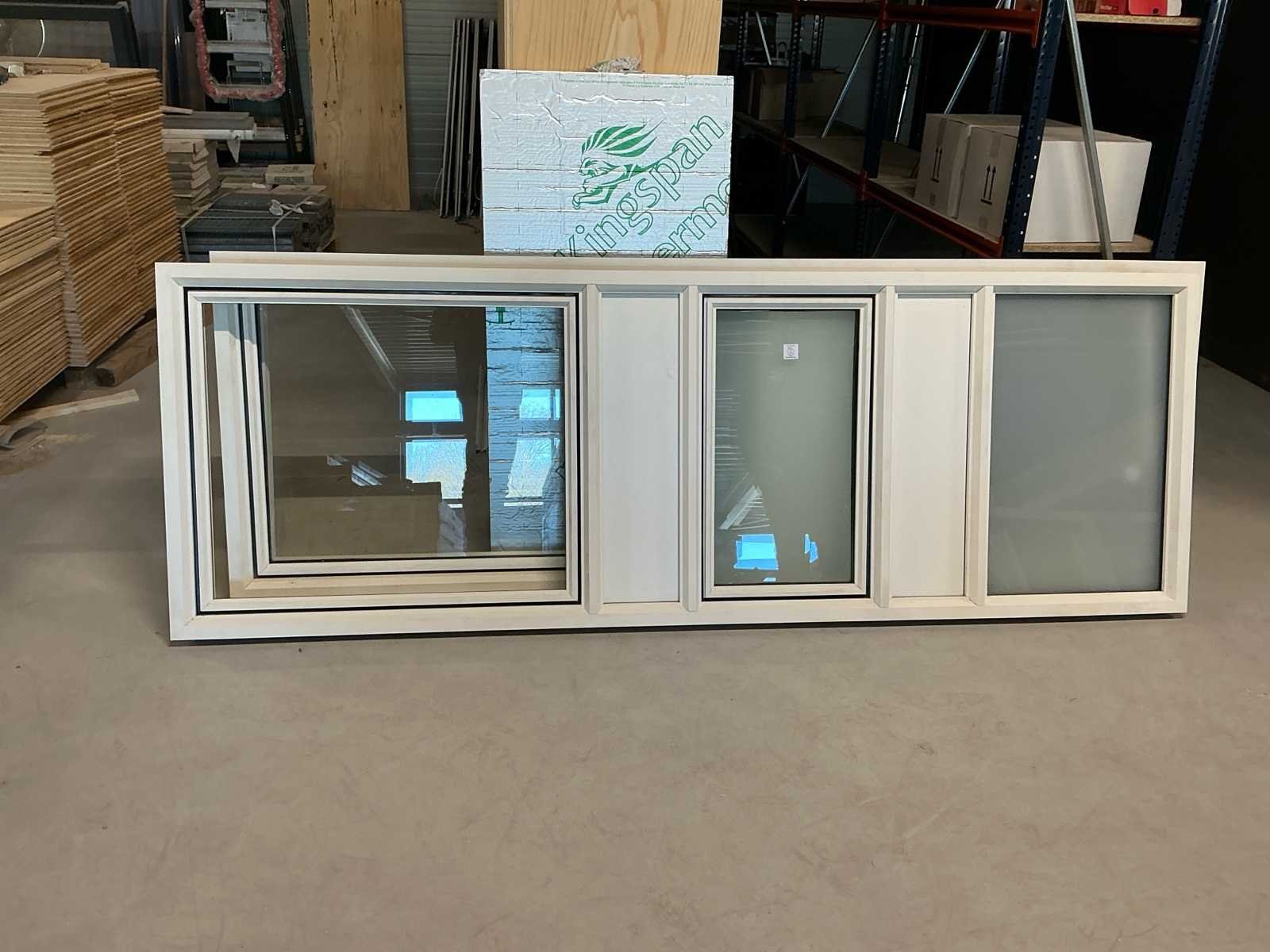 Voorzien van: kleur 9010, 3 draai kiep ramen. 2x. Afsluitbaar met sleutel. Nee Afmeting h: 820mm Afmeting b: 2400mm Aluminium: true Dikte: 110mm Glas: true Kleur: Wit