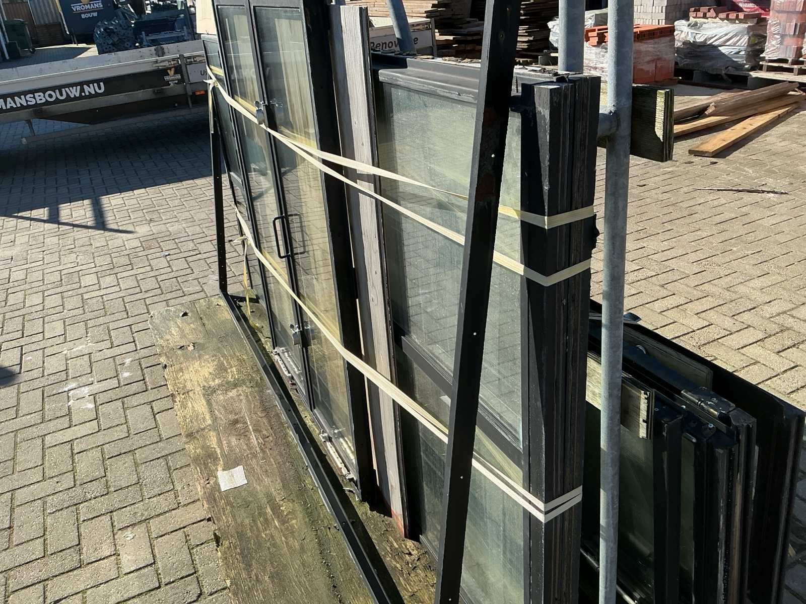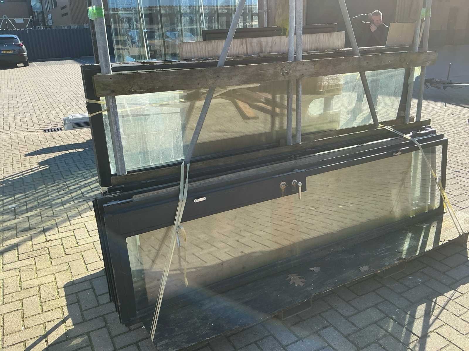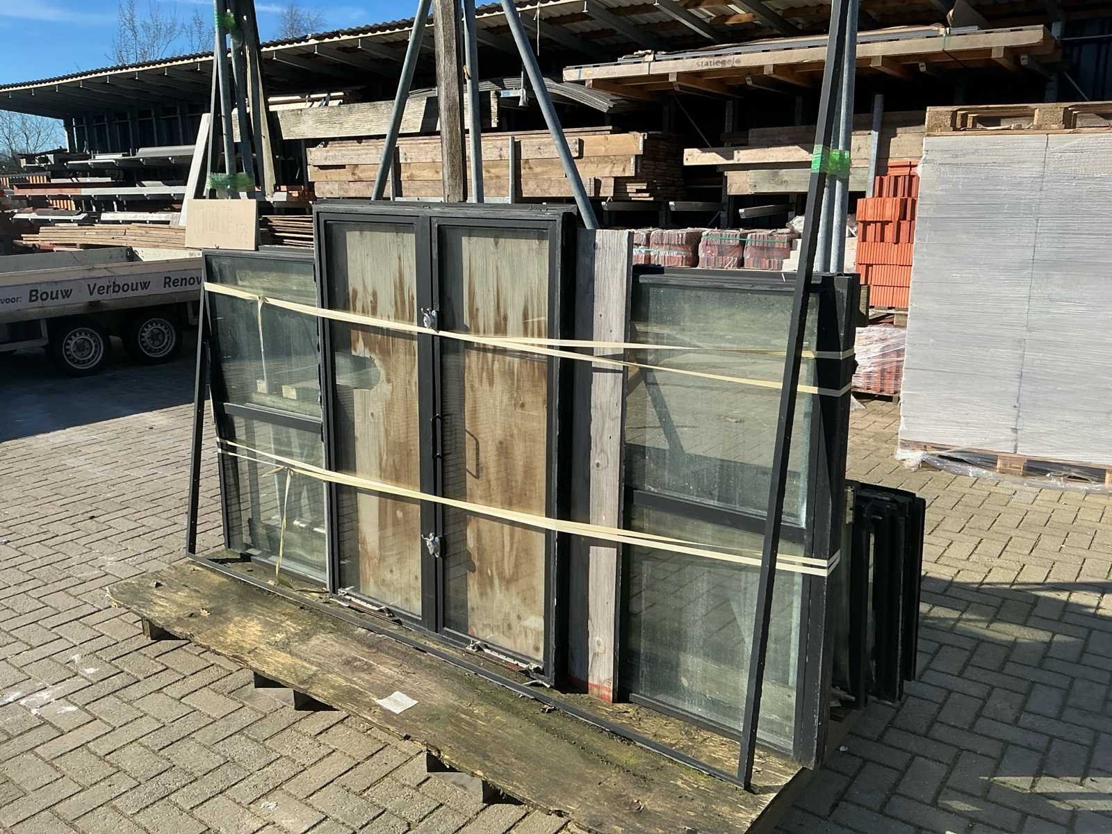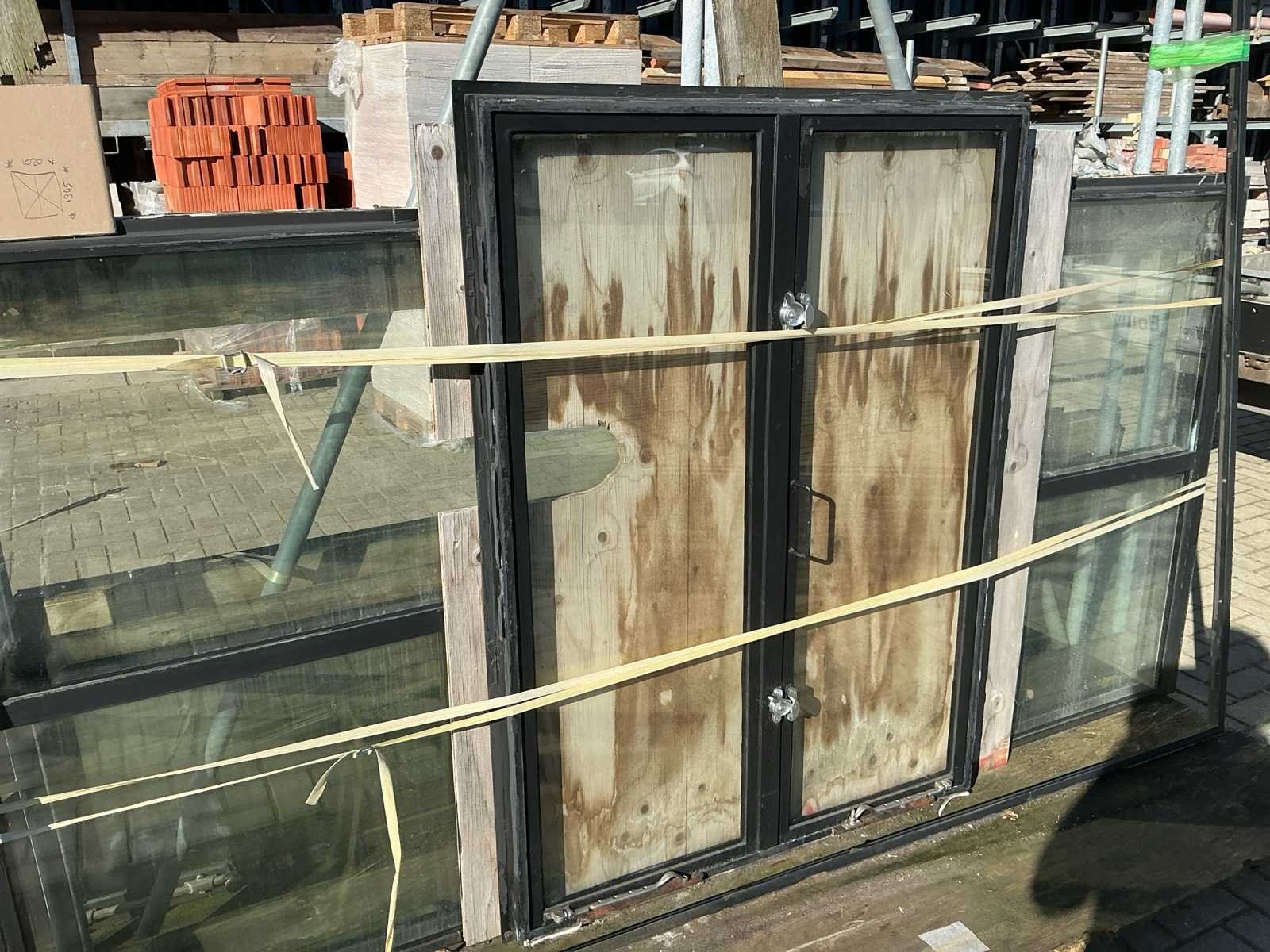 Voorzien van: staal, dubbel glas, draairaam 1020mm breed 1345mm hoog,, 4 deuren 243cm hoog, 58cm breed met hang en sluitwerk, dubbelzijdig kozijn met dubbel glas, De complete pui is 2430mm hoog, 4770mm breed, No Buitendeur: true