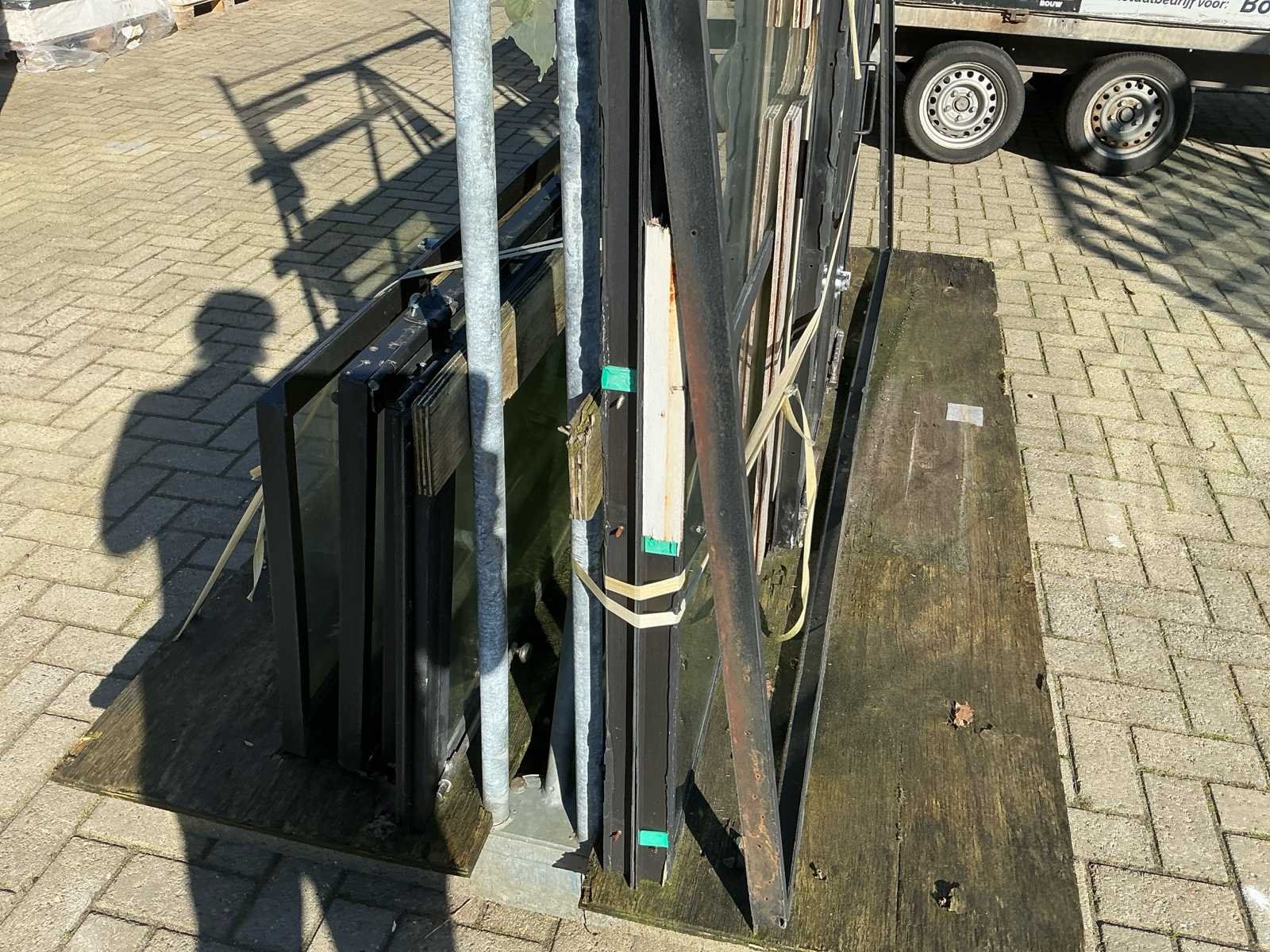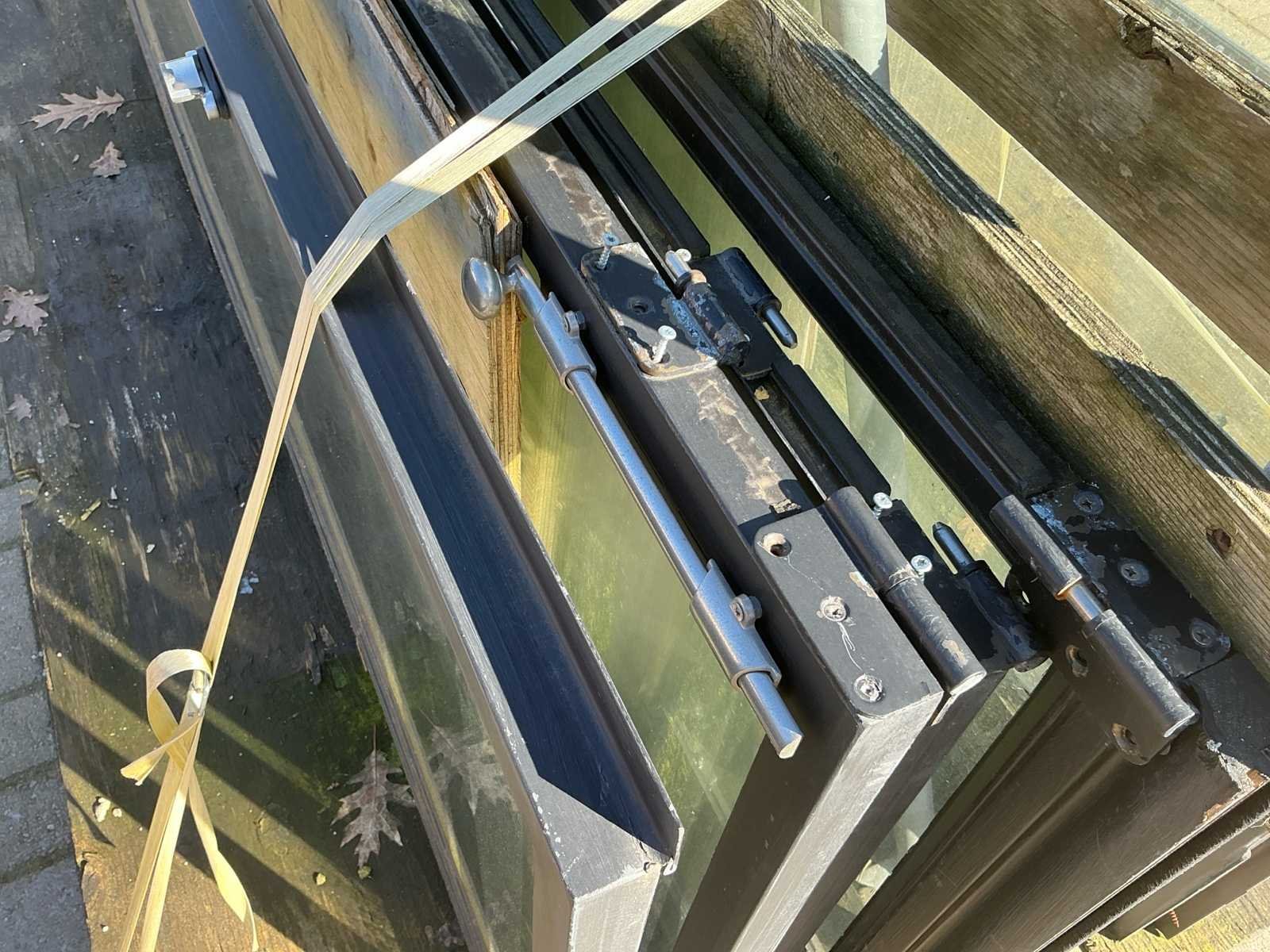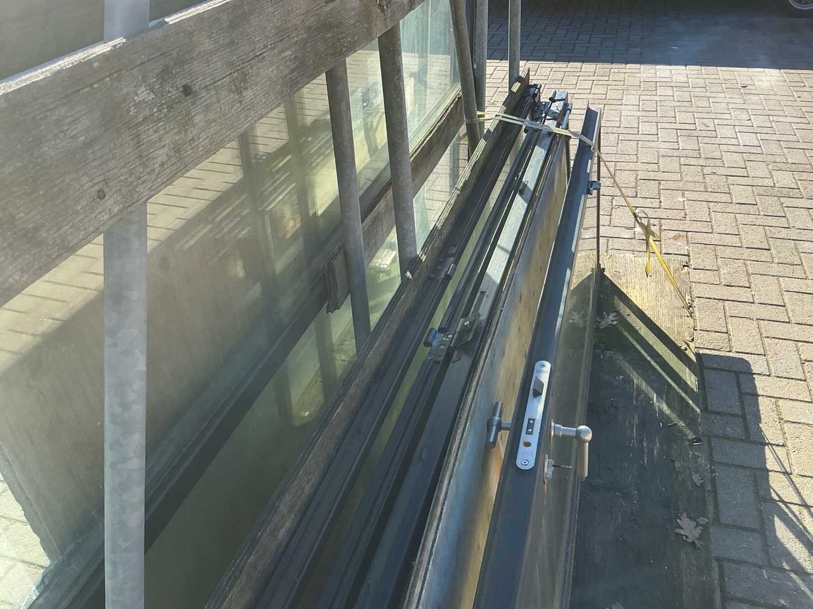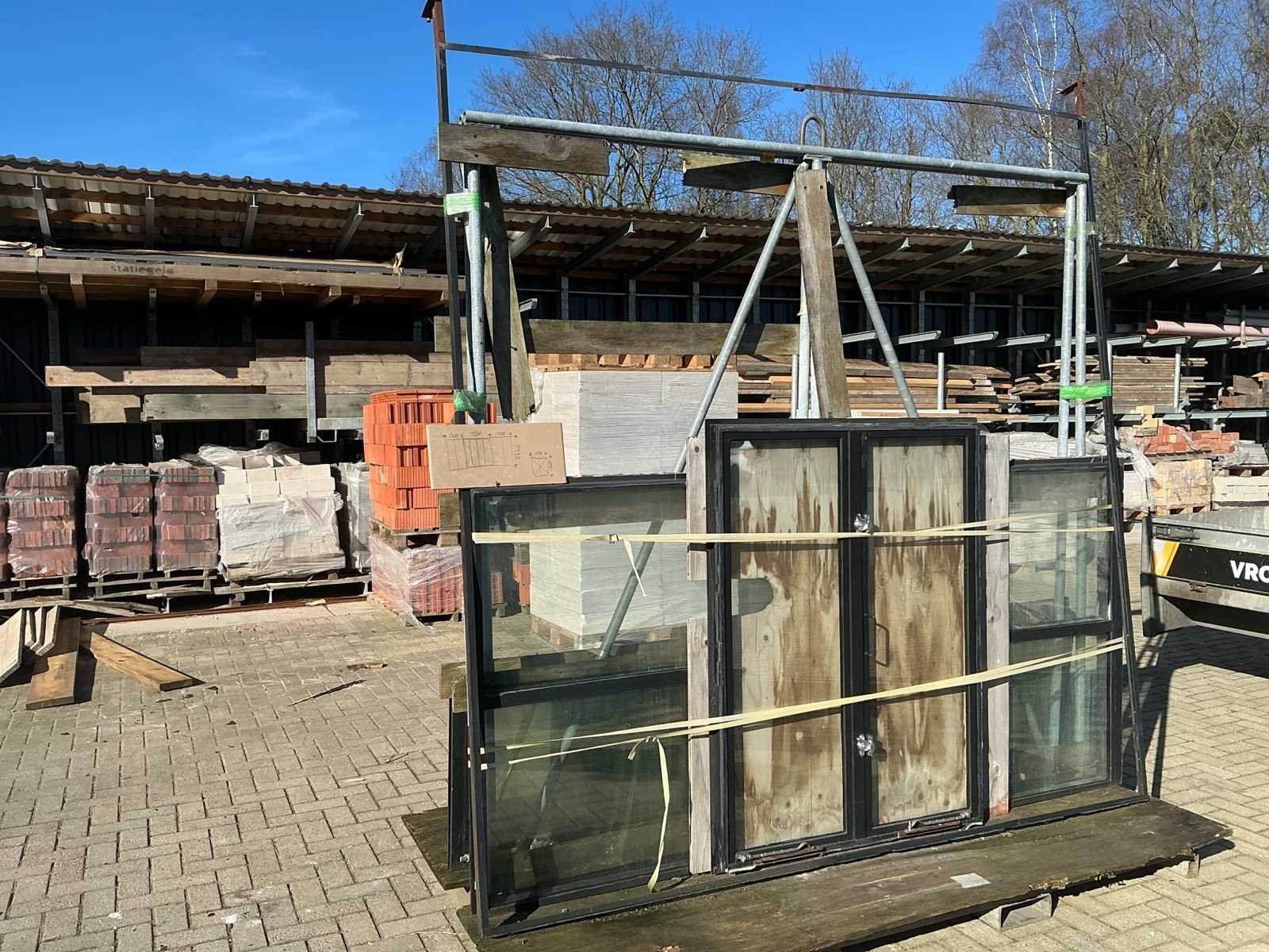 Voorzien van: staal, dubbel glas, draairaam 1020mm breed 1345mm hoog,, 4 deuren 243cm hoog, 58cm breed met hang en sluitwerk, dubbelzijdig kozijn met dubbel glas, De complete pui is 2430mm hoog, 4770mm breed, No Buitendeur: true