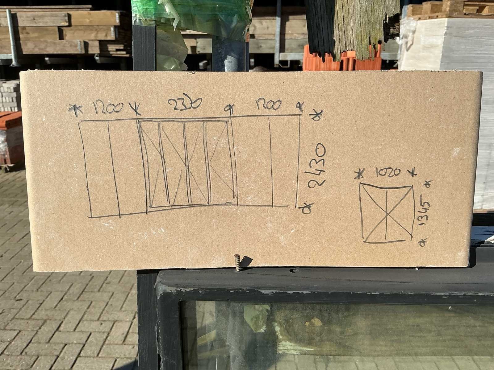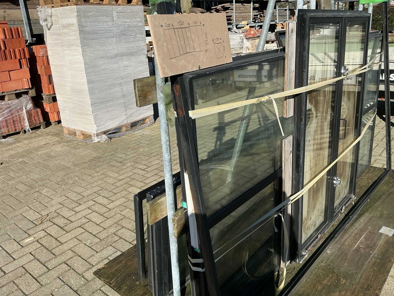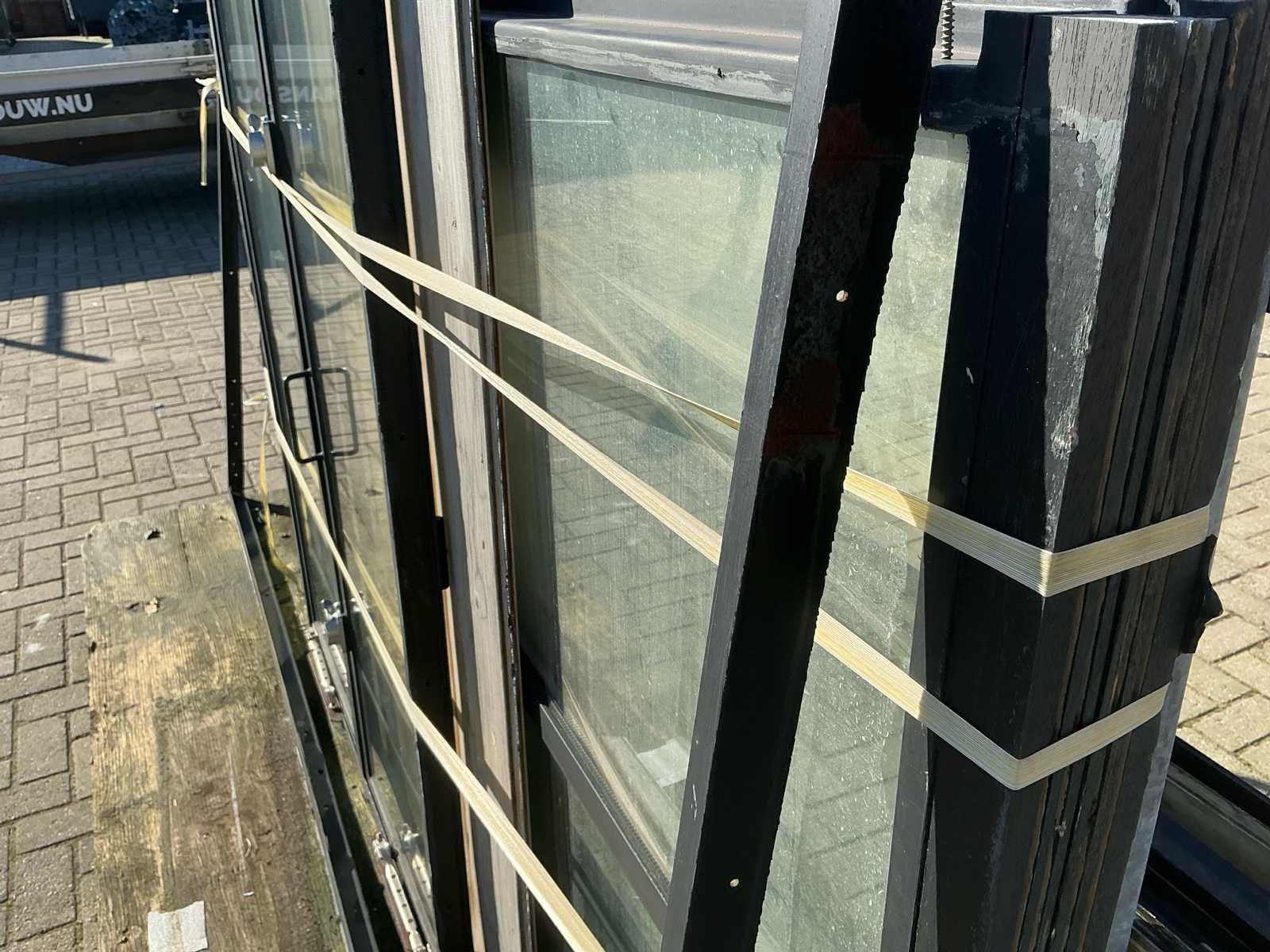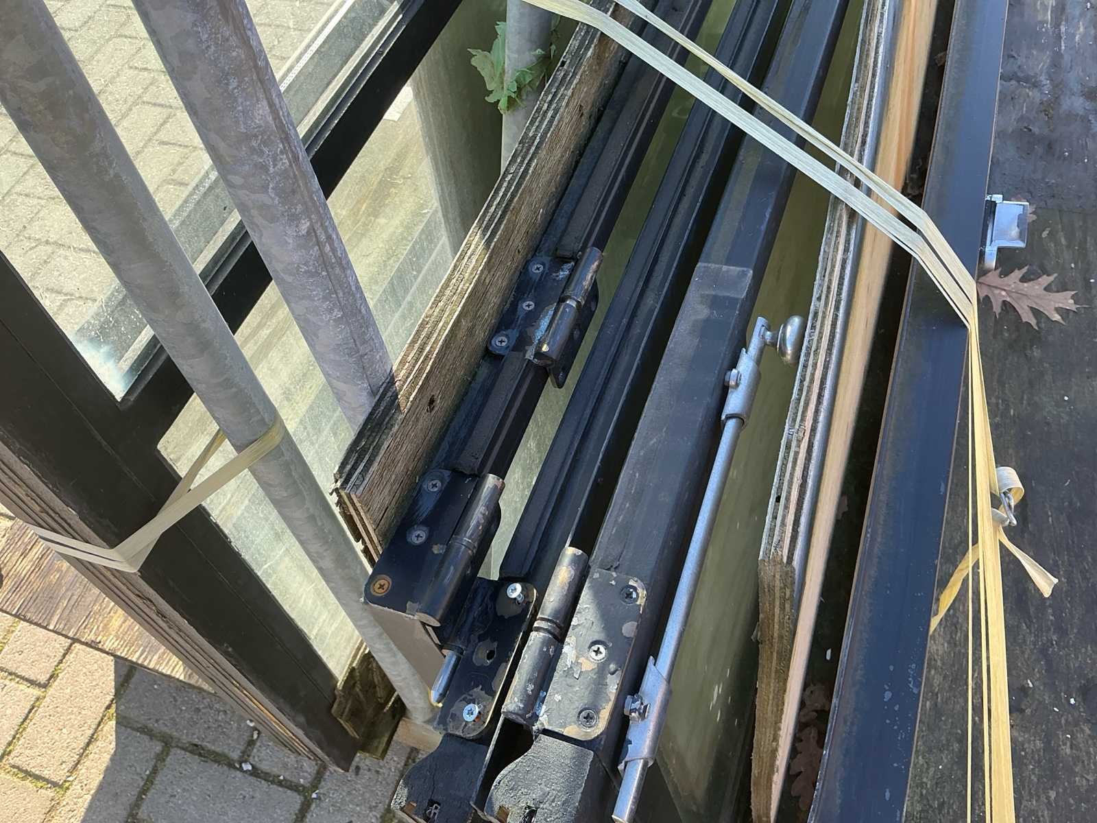 Voorzien van: staal, dubbel glas, draairaam 1020mm breed 1345mm hoog,, 4 deuren 243cm hoog, 58cm breed met hang en sluitwerk, dubbelzijdig kozijn met dubbel glas, De complete pui is 2430mm hoog, 4770mm breed, No Buitendeur: true