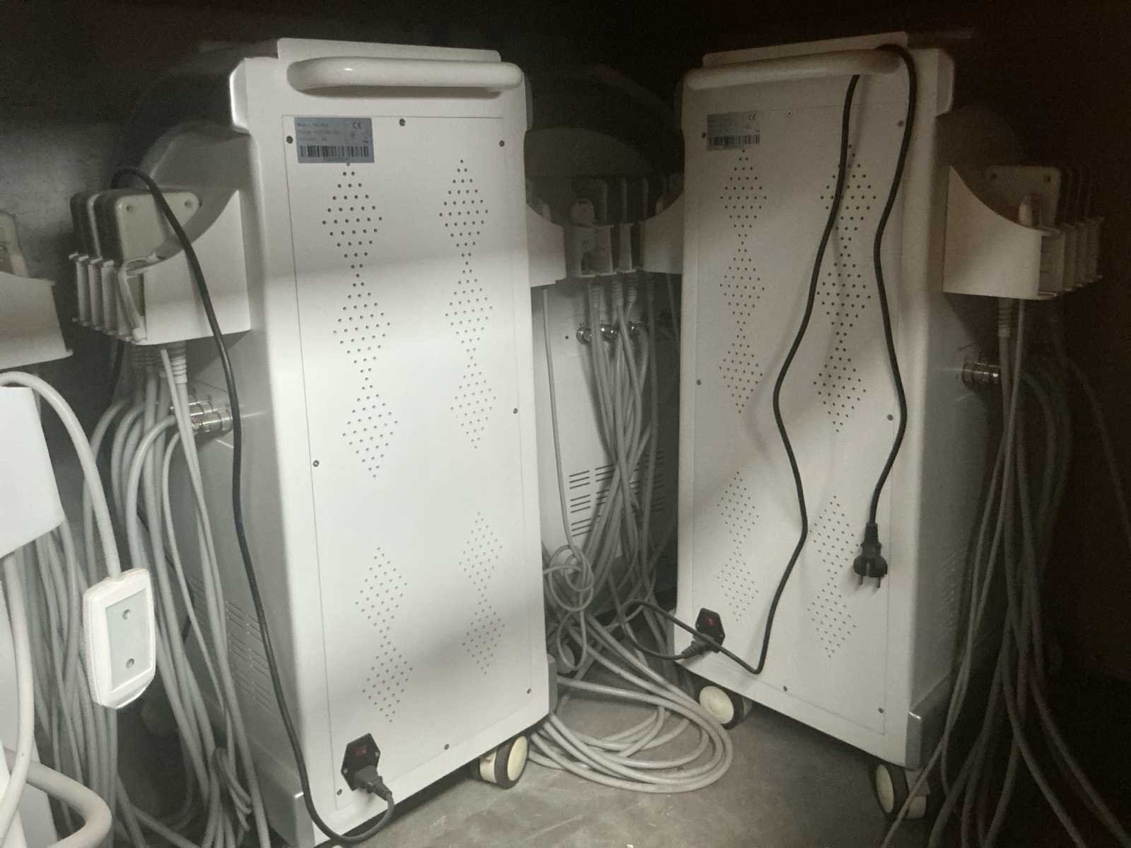Verrijdbaar. Urenstand: beide apparaten minder dan 150 uur. Eventueel promotie materieel bijgeleverd zoals banner en kaartjes. Nee Merk: Pro slimming Model: PZ-809C Kleur: Wit Lengte: 50cm Breedte: 40cm Hoogte: 90cm