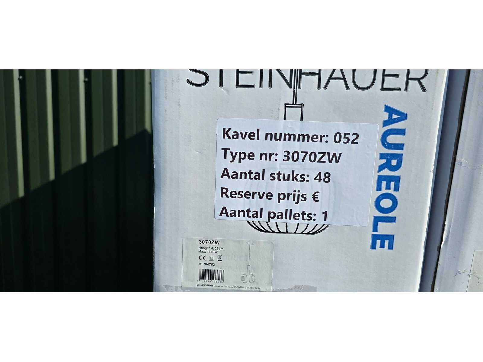 Brutowinkeladviesprijs € 2.800; Gestapeld op en inclusief 1 EURO Pallet; Wordt geleverd zonder lichtbron; No Merk: Steinhauer Product type: Aureole 3070ZW Fitting: E27 Kleur: Zwart