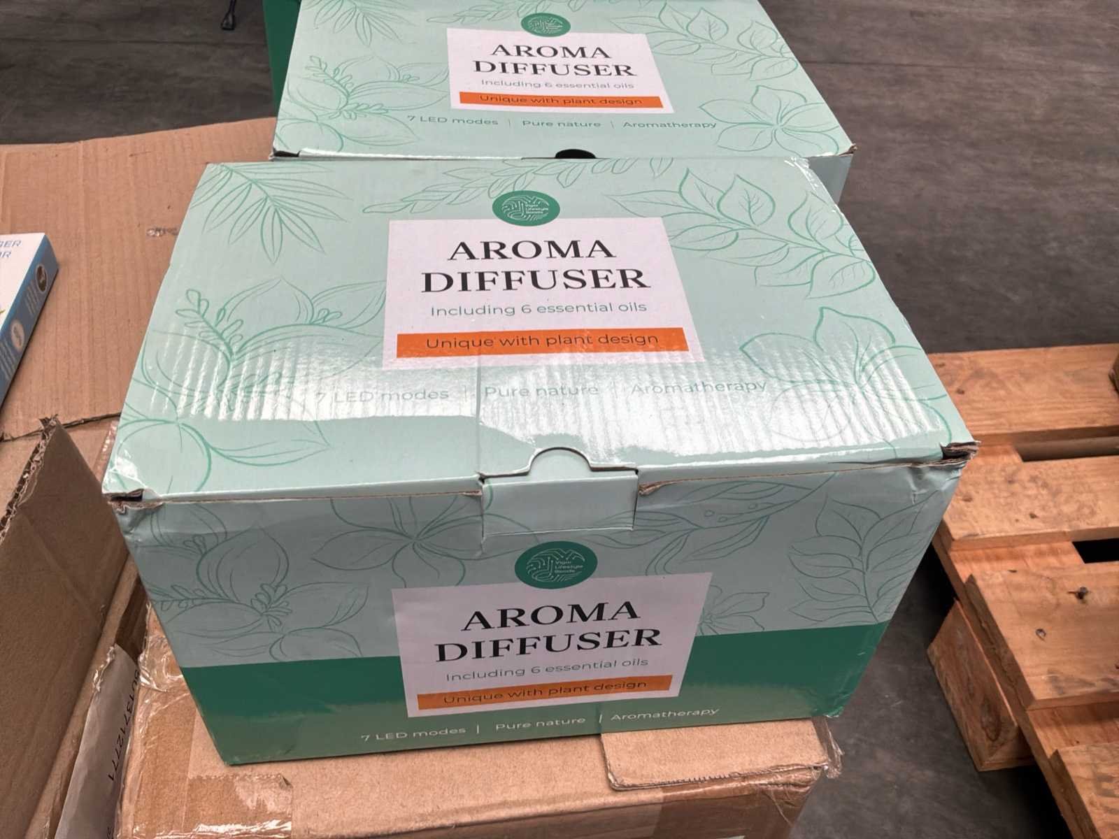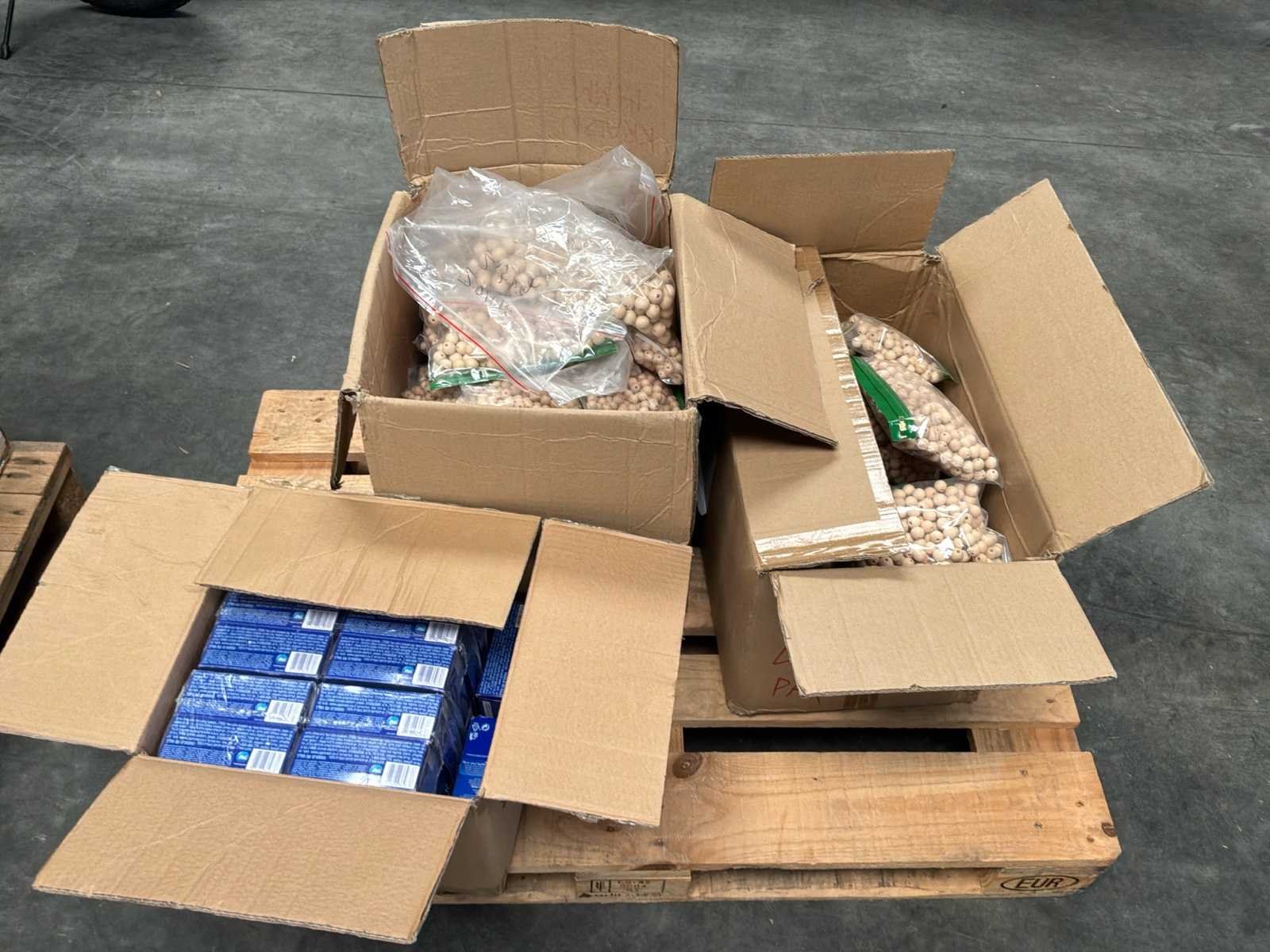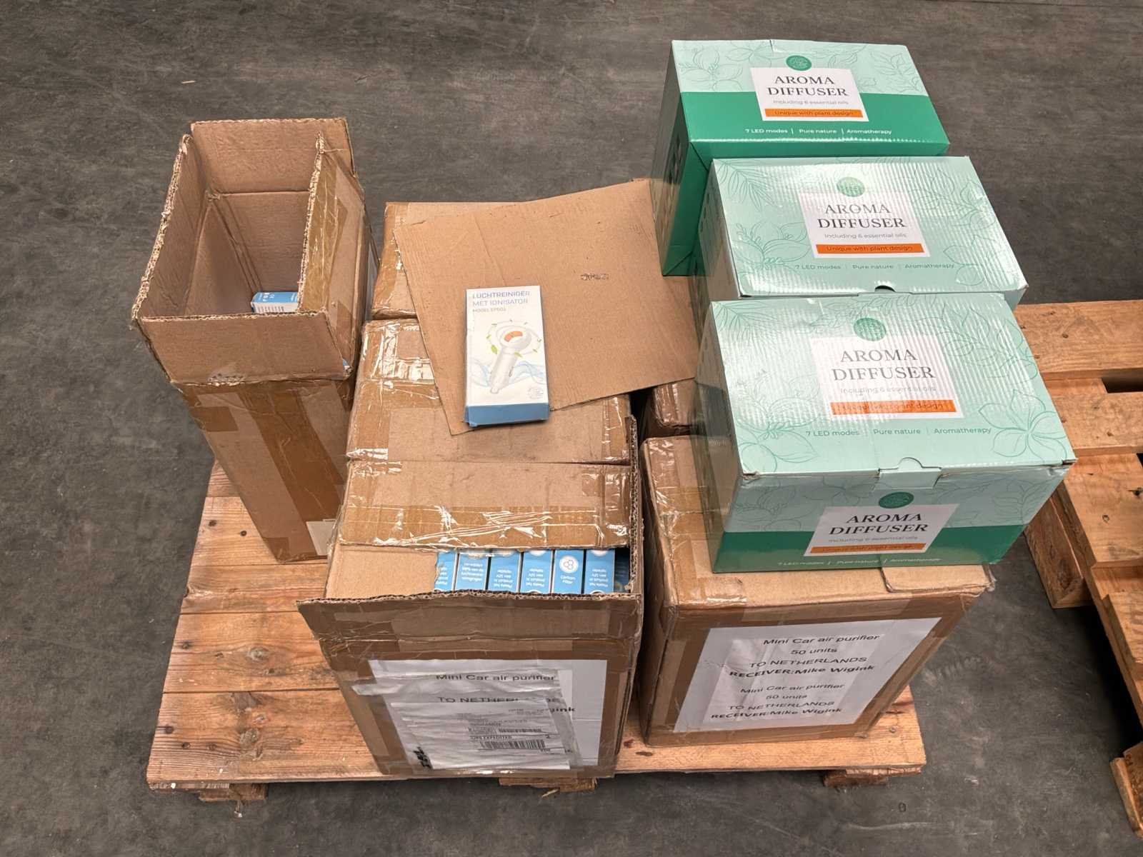 Bestaande uit circa 320 autoluchtreinigers * 3x defuser * 2 dozen met diverse houten kralen met verschillende diameters * 1 doos tampons * verdeeld over en inclusief 2 pallets Nee