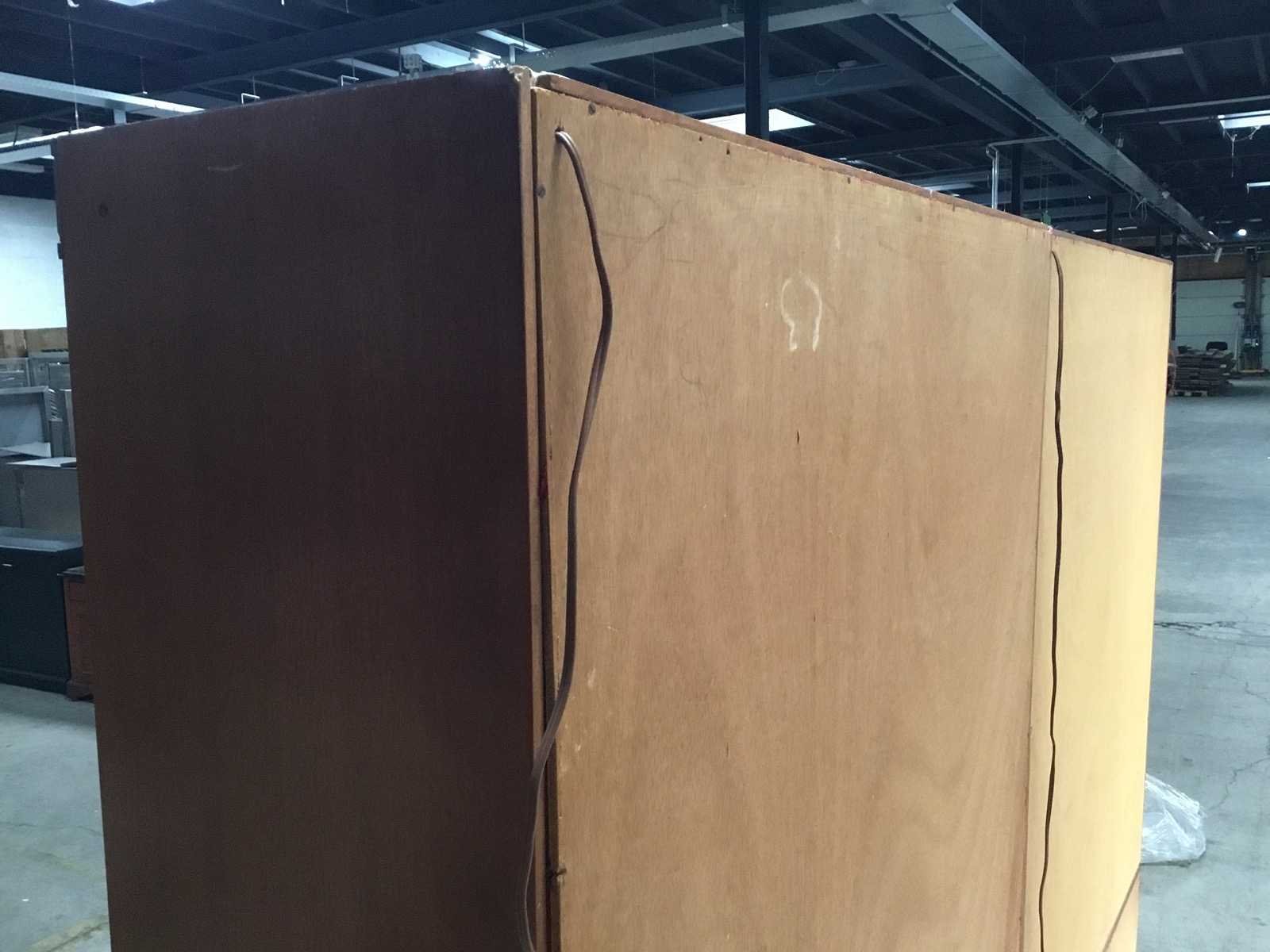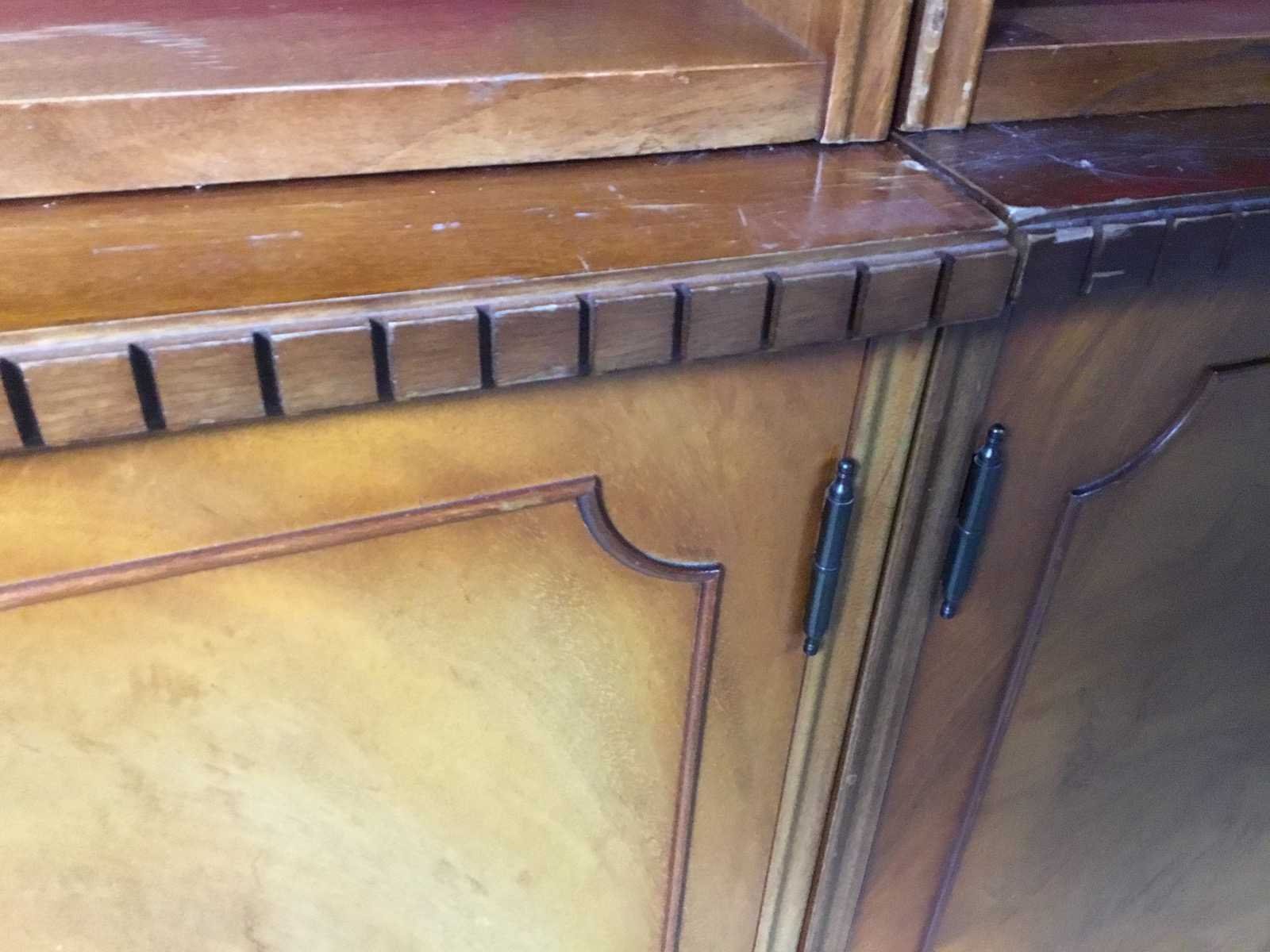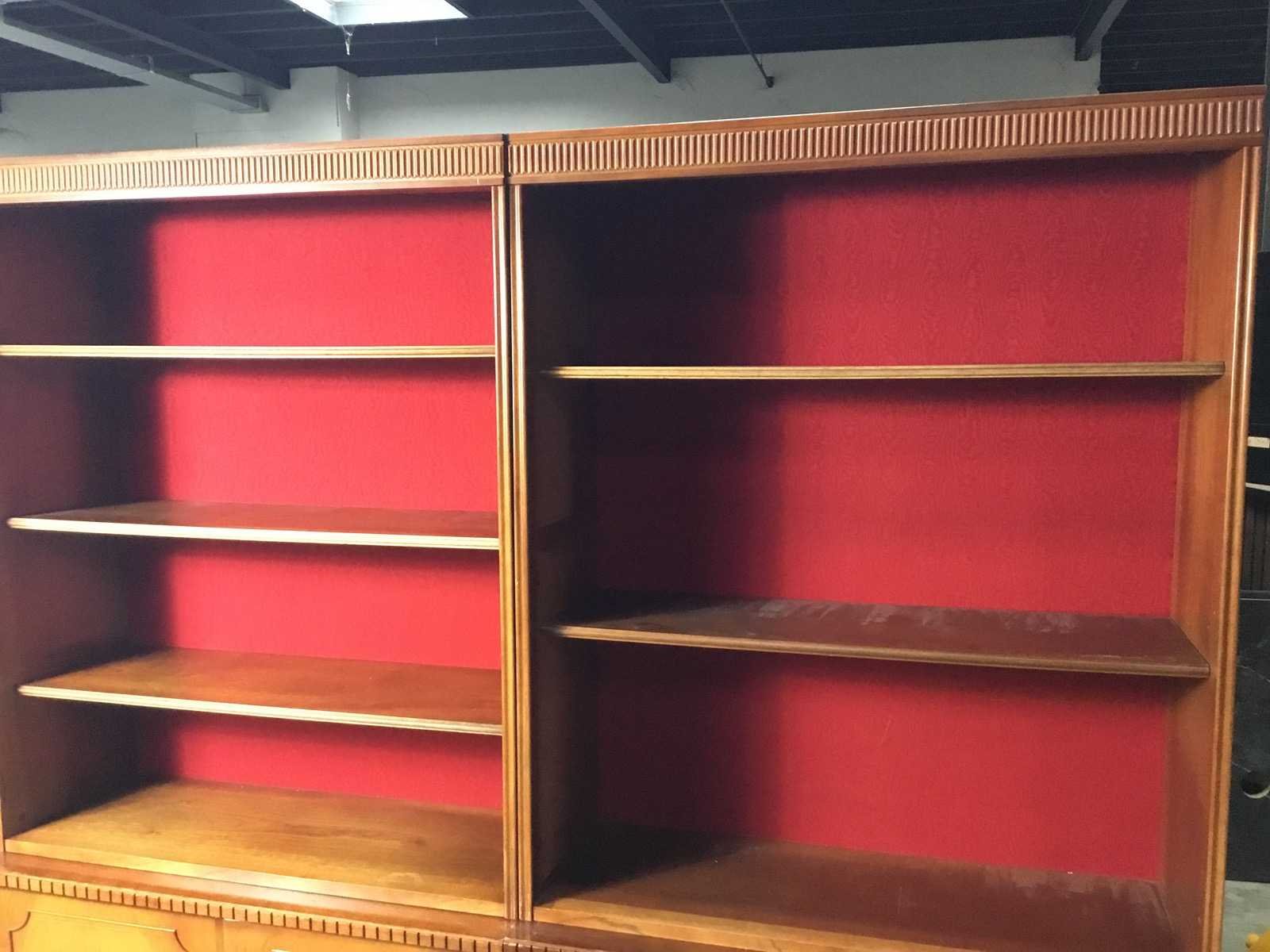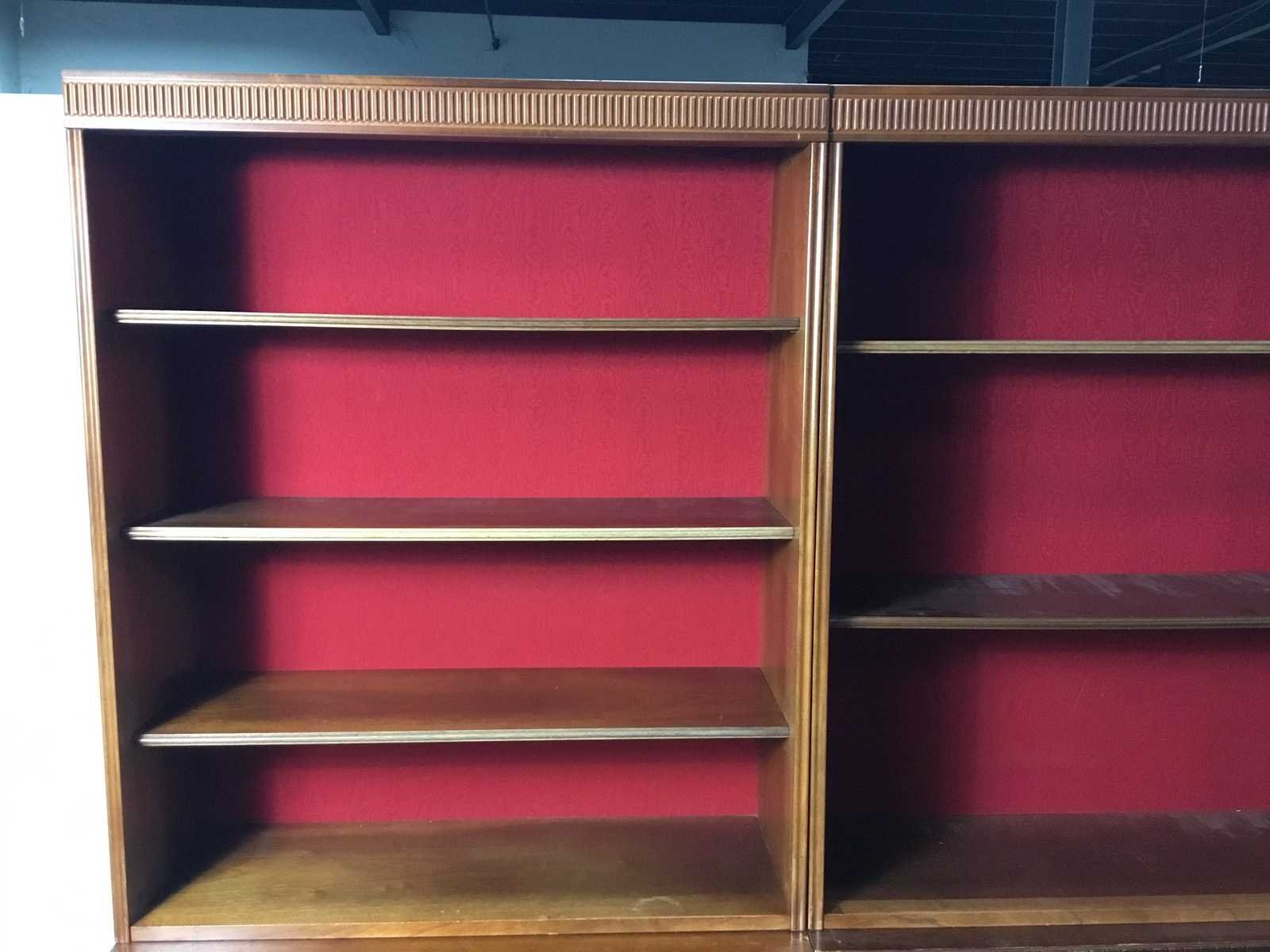 Klassieke houten boekenkast met twee secties en een opvallende rode stoffen achterwand. Kast bestaat uit 2 delen het bovenste deel is 30 diep en 115 hoog. Antiek en in goed conditie. Nee Merk: Antieke showkast Lengte: 95cm Breedte: 40cm Hoogte: 187cm Diepte: 35cm