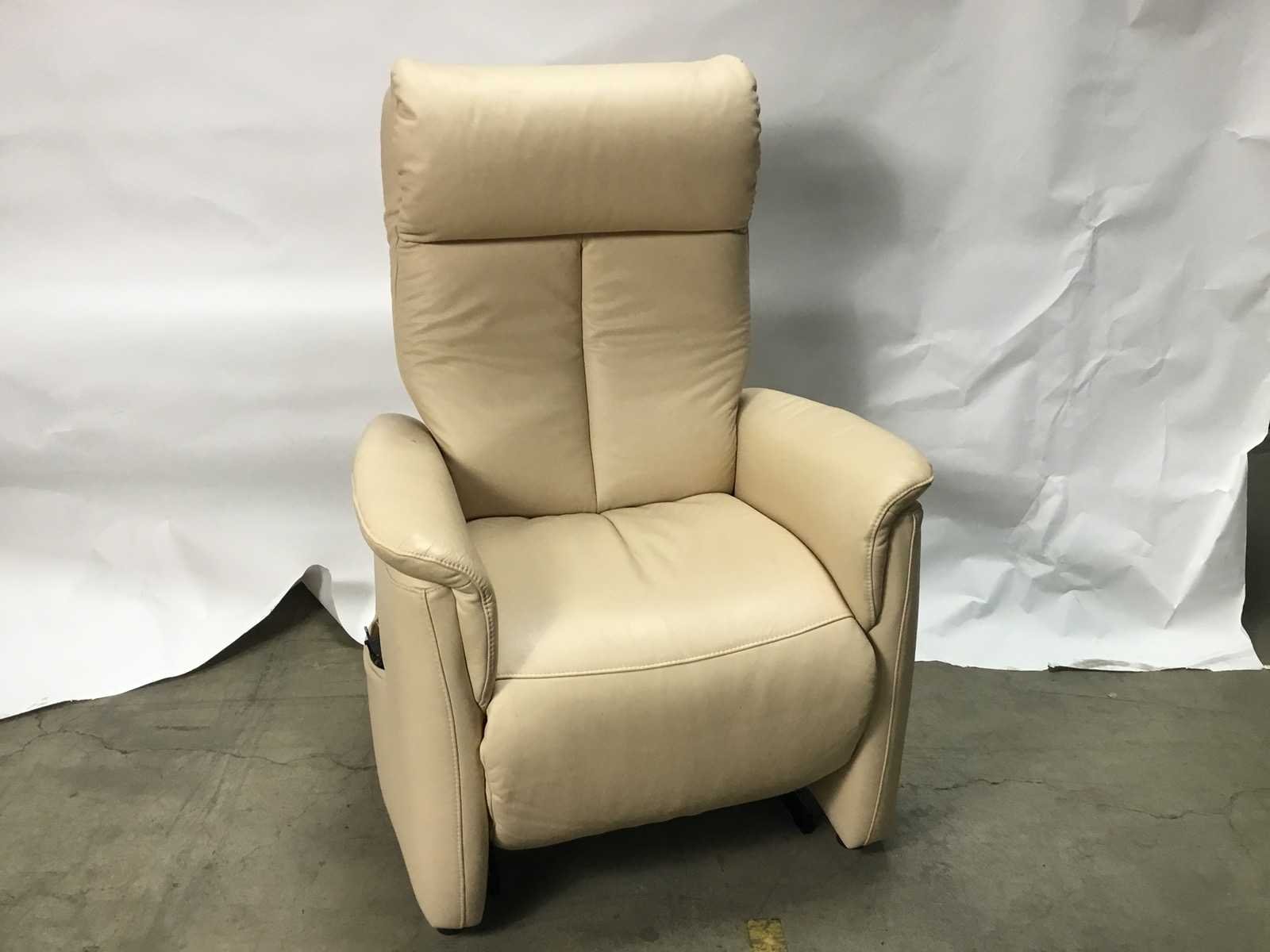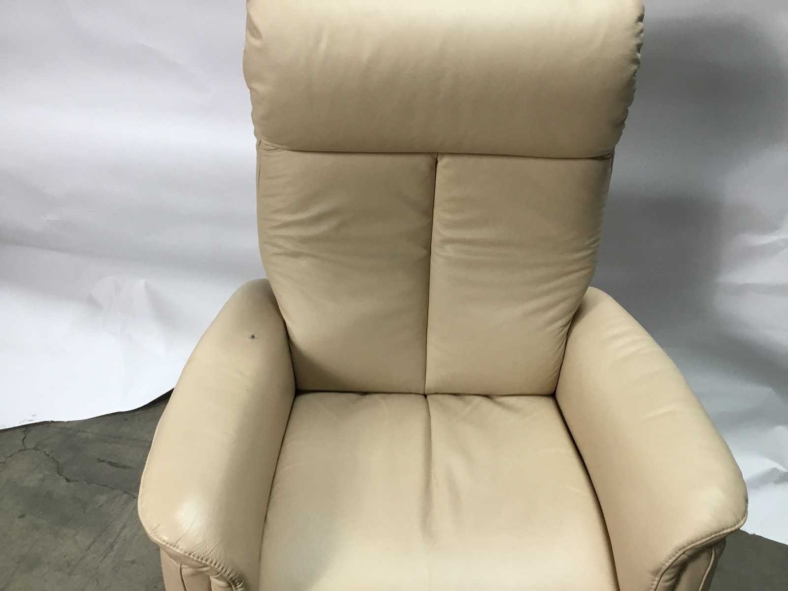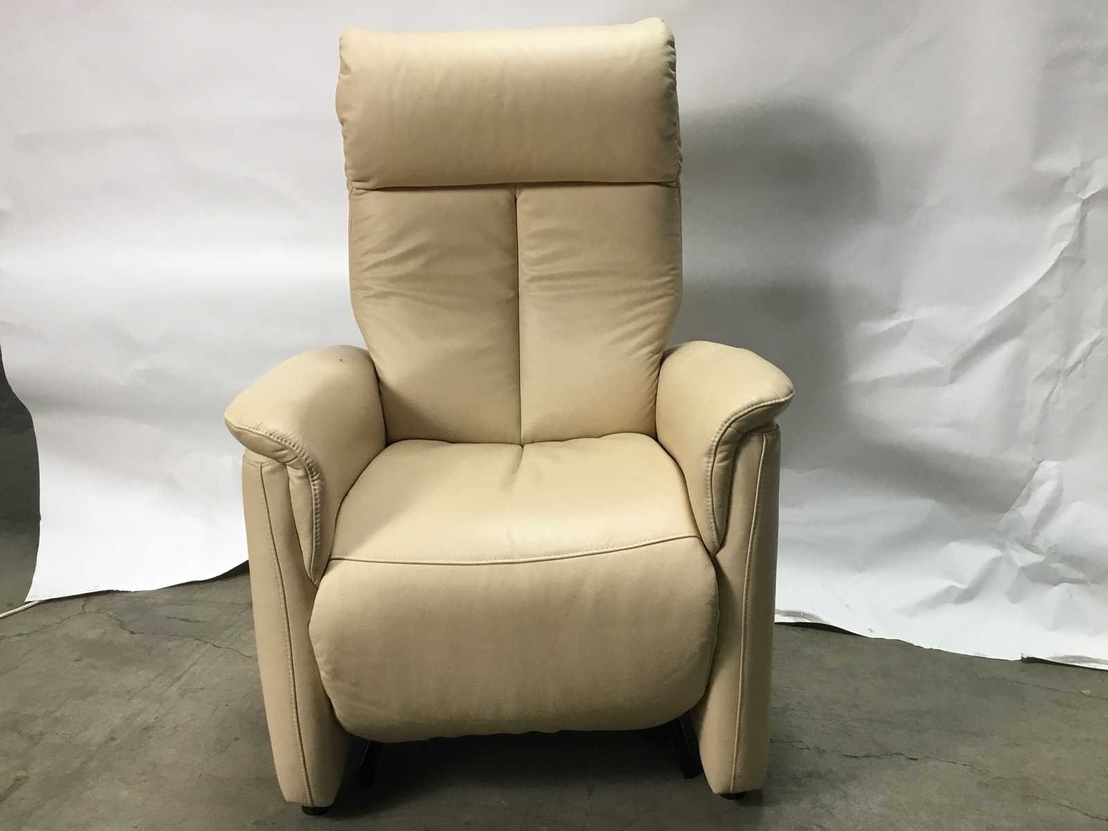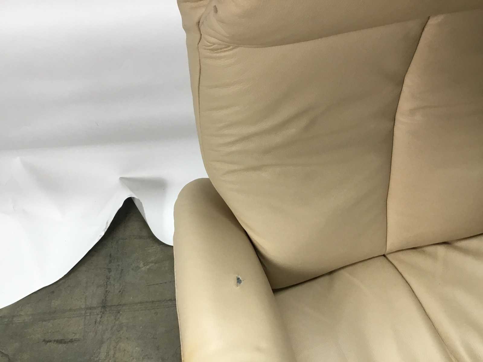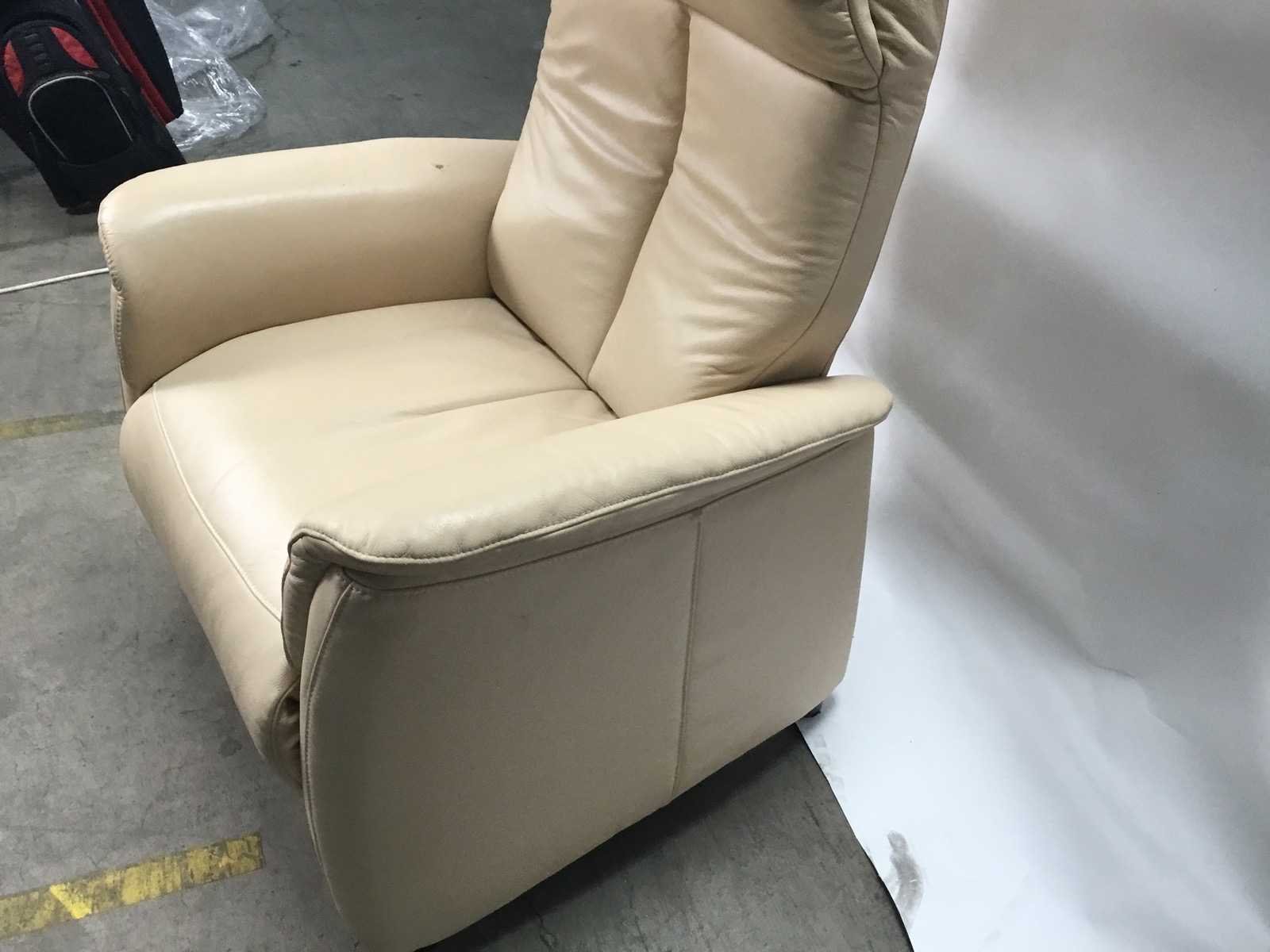 Er zit een klein gatje in de armleuning. zie foto Nee Merk: Elektrische verstelbare stoel Kleur: Crème Lengte: 79cm Breedte: 67cm Hoogte: 115cm Zithoogte: 48cm Materiaal: Leer