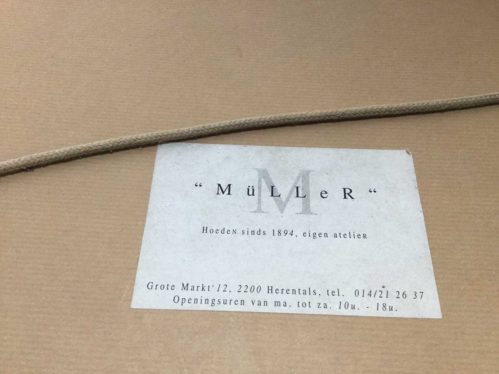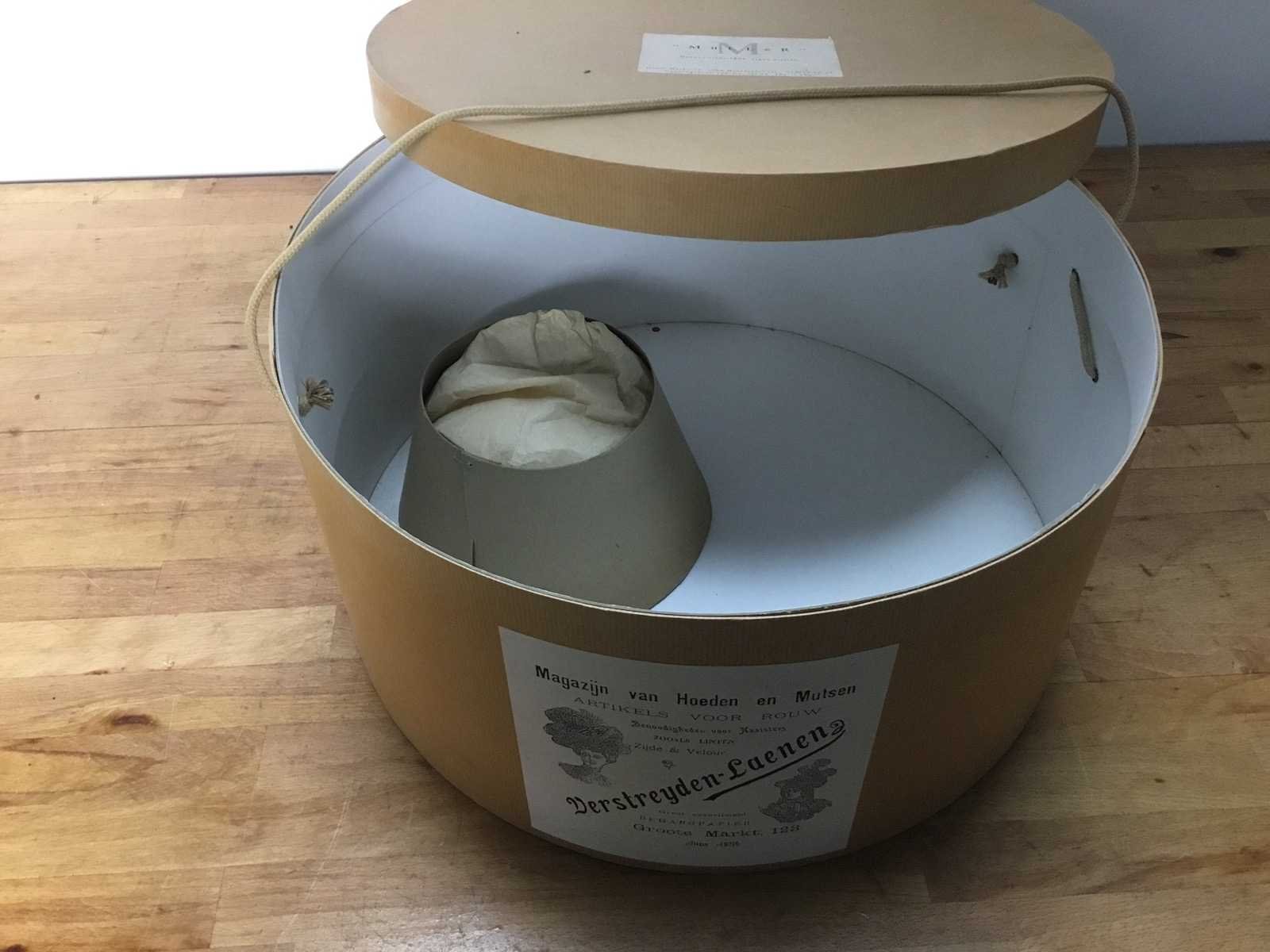 De antieke kartonnen hoedendoos van een Nederlandse firma, specifiek gericht op rouwartikelen en hoofddeksels. Het betreft een doos van de firma Verstreyden-Laeneng. De winkel was gevestigd aan de Groote Markt 123 en actief in 1854. De doos werd gebruikt voor het verkopen van hoeden, mutsen en rouwartikelen. Nee Bestaande uit: Antieke Hoedendoos 1e: Muller Totale afmeting lxbxh: 450 rond 220 hoogmm Materiaal: Karton