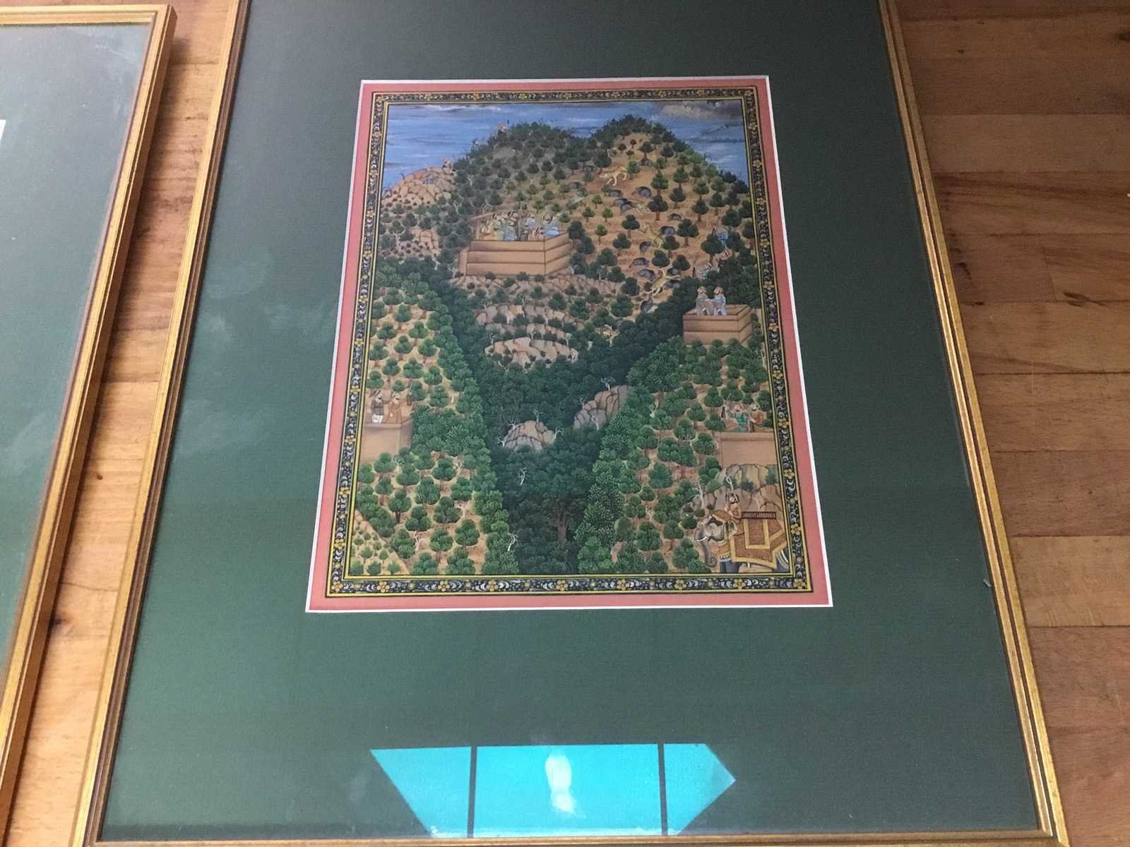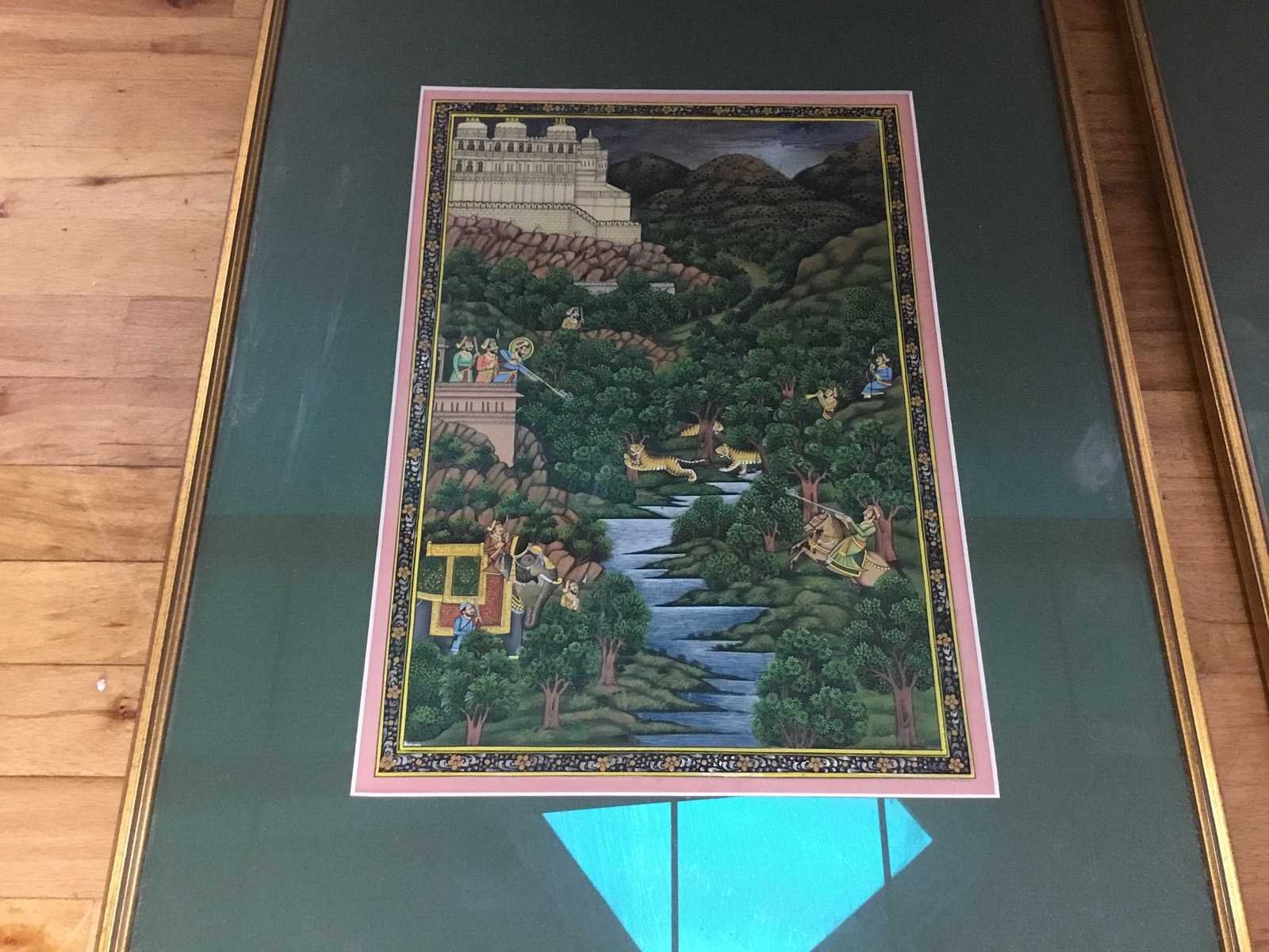 Deze gedetailleerd Indiaas miniatuurschilderijen, waarschijnlijk in Mughal-stijl, dat een jachtscène of koninklijke processie in een weelderig landschap uitbeeldt. Het schilderij toont kenmerken van traditionele Indiase miniatuurkunst, vaak gekenmerkt door fijn penseelwerk. Dergelijke werken worden traditioneel geschilderd met natuurlijke steenkleuren en soms met goudinkt. De scènes tonen vaak koningen, ruiters, tijgers en weelderige vegetatie, wat duidt op een jachtthema Nee Land: India Titel van werk: Traditioneel indiaas miniatuurschlderij Hoogte: 49cm Breedte: 38cm Frame: true